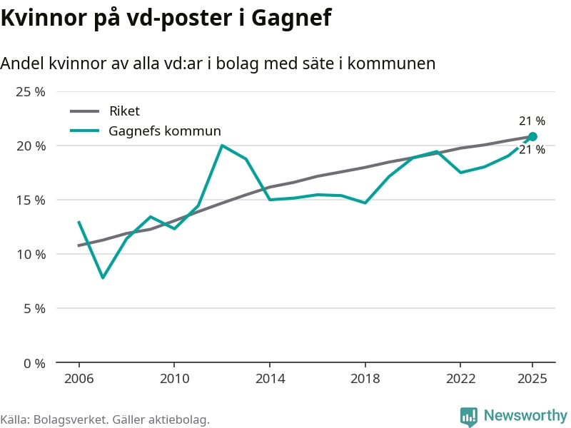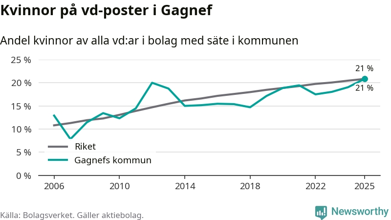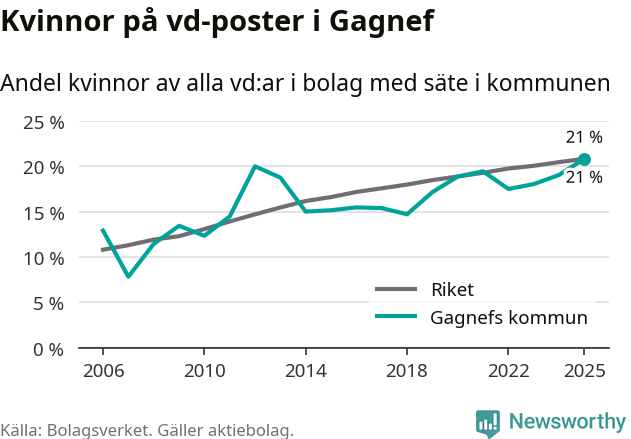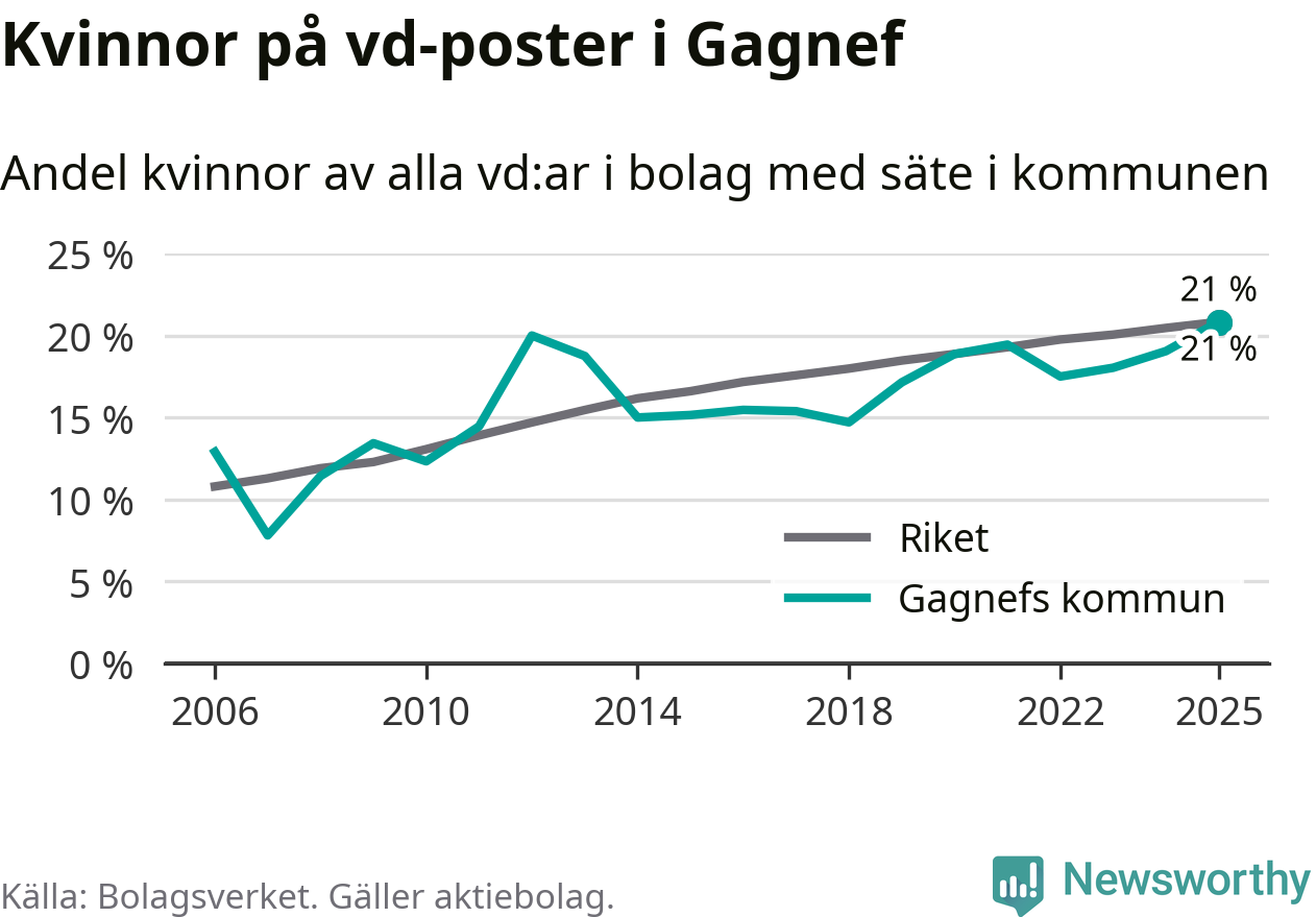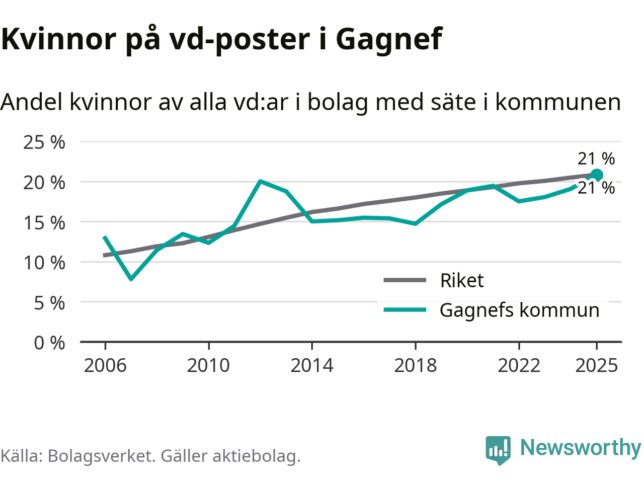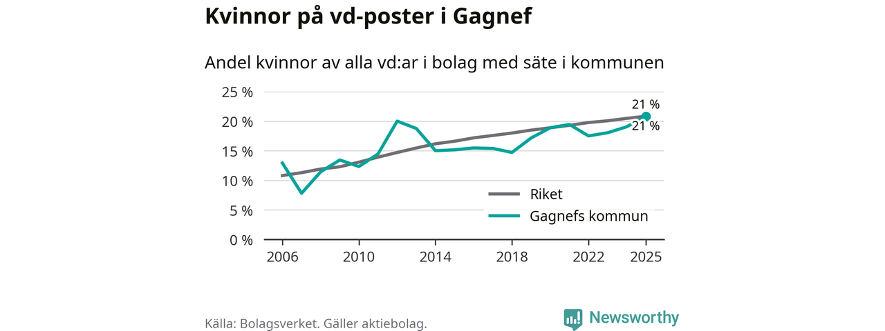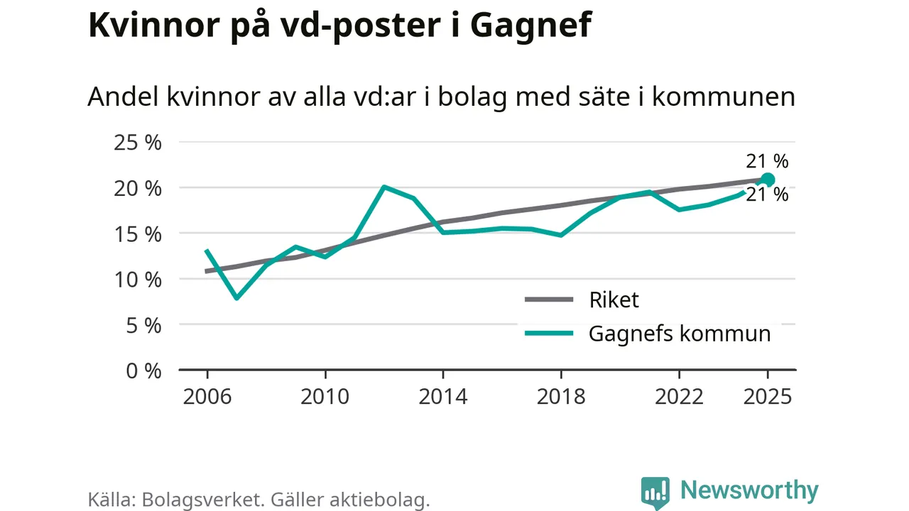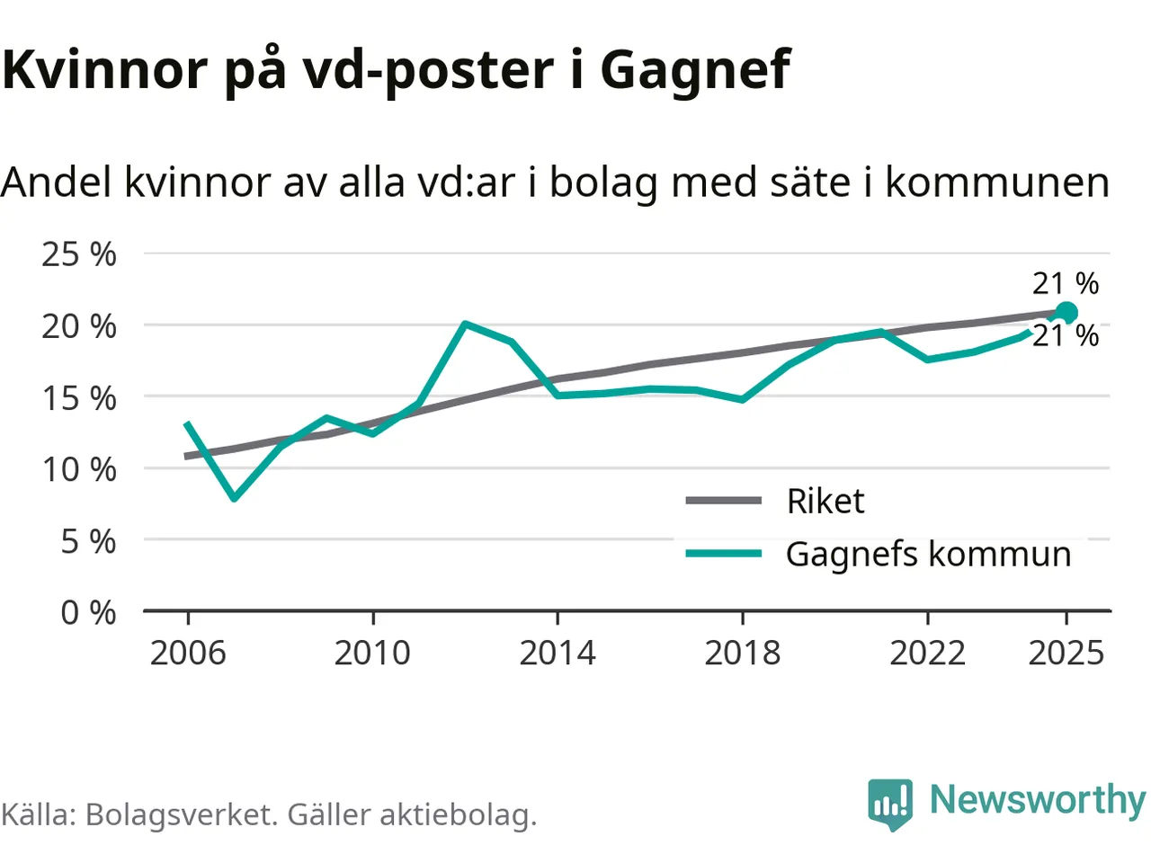 21 procent av aktiebolagen med registrerad vd i Gagnef hade en kvinna på posten vid årsskiftet. Det innebär att på varje kvinnlig vd går fyra män.