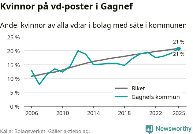Delar man upp vd:arna i Gagnef efter ålder är andelen kvinnor högre bland dem under 50 år. Där är 27 procent kvinnor, jämfört med 16 procent i den äldre gruppen. I riket som helhet är 22 procent av vd:arna som är under 50 år kvinnor, medan motsvarande siffra för direktörerna som är äldre är 20 procent.