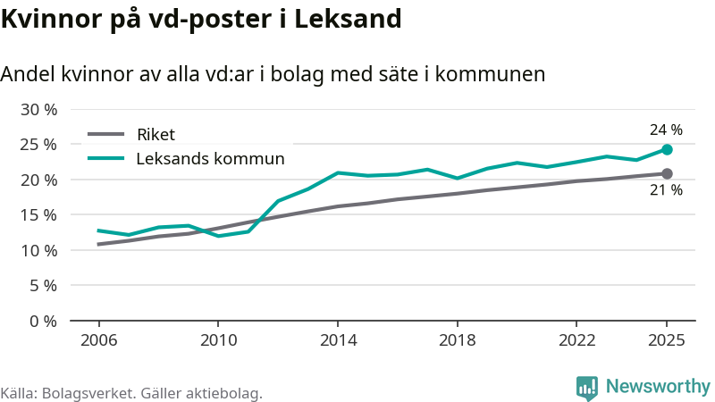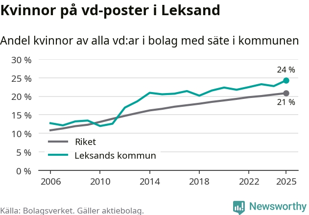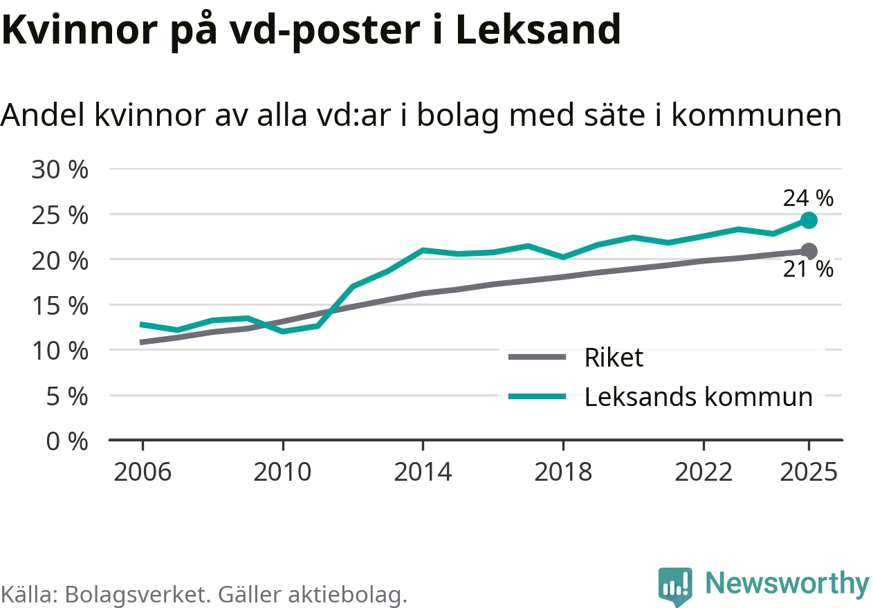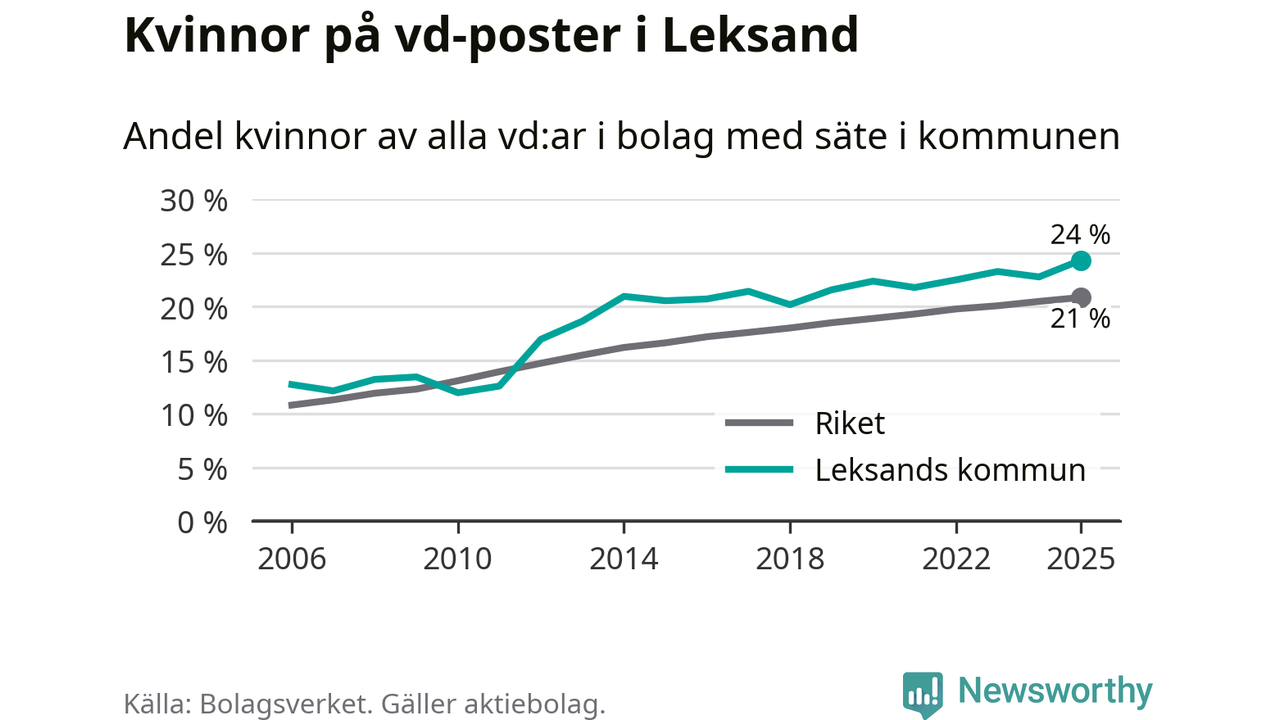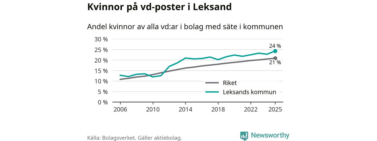 Det är fortfarande män som är vd i nästan fyra av fem bolag i Sverige, men i Leksand är det alltså en högre andel kvinnor på vd-posten. 24 procent är den näst högsta andelen av kommunerna i Dalarna. Högst andel kvinnliga vd:ar i Dalarna har företagen med säte i Orsa kommun, 27 procent. Där rör det sig dock om relativt få företag – 95 stycken totalt – och även små förändringar får stora utslag i andelen kvinnliga vd:ar. Lägst är andelen bland företagen med säte i Malung-Sälens kommun, 14 procent.