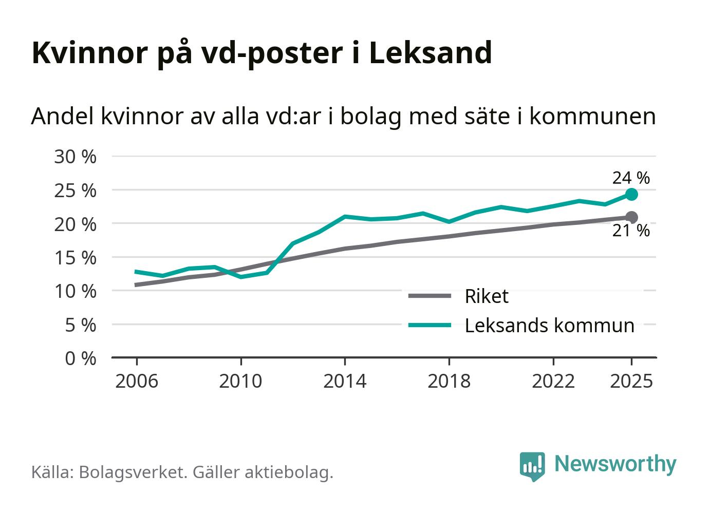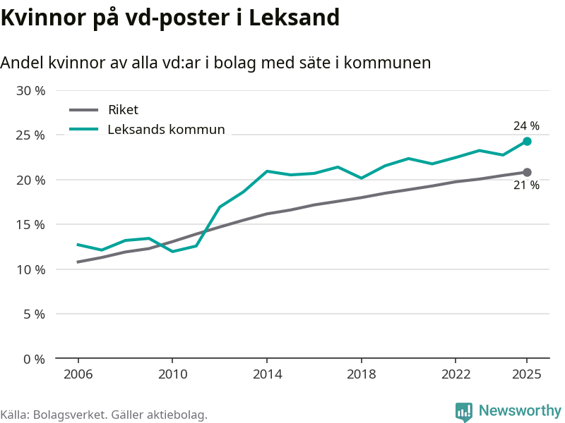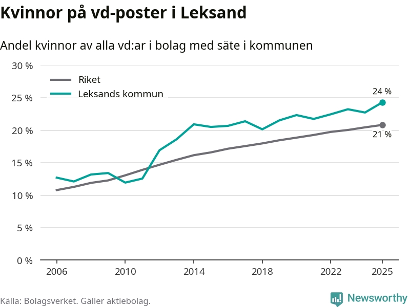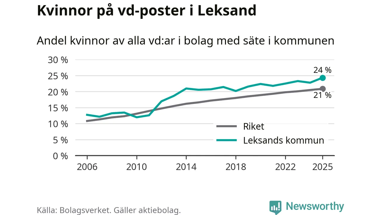 24 procent av aktiebolagen med registrerad vd i Leksand hade en kvinna på posten vid årsskiftet. Det innebär att på varje kvinnlig vd går tre män.