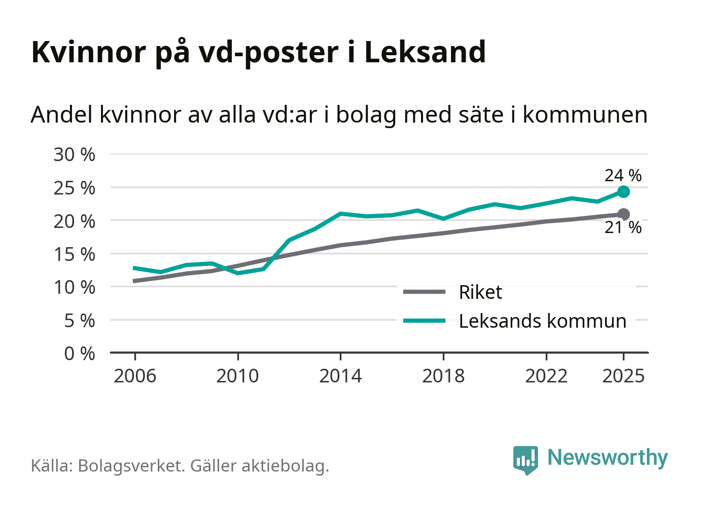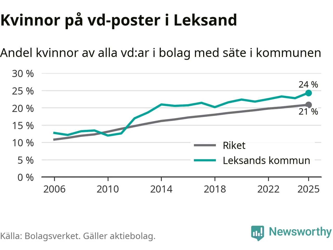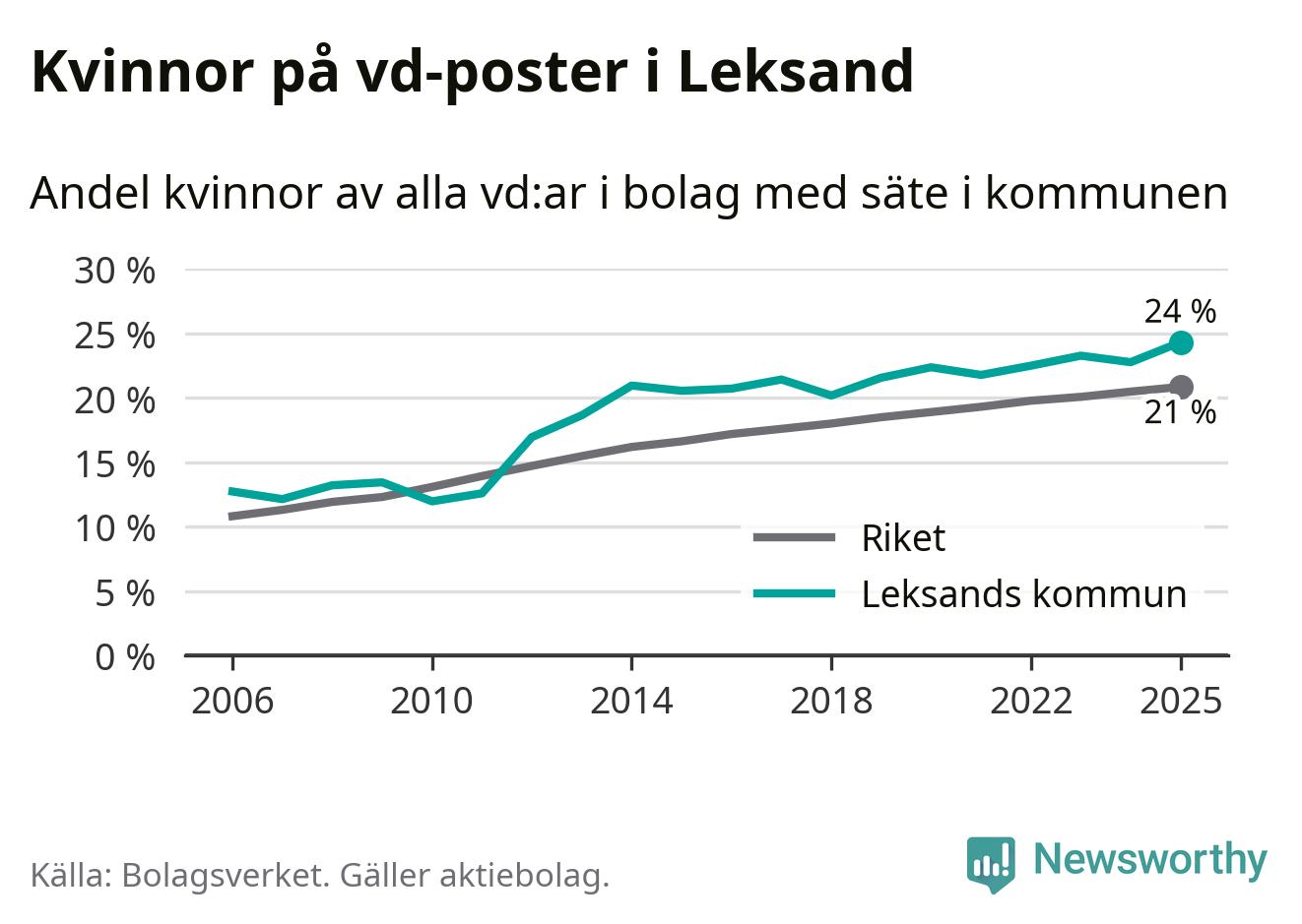 24 procent av aktiebolagen med registrerad vd i Leksand hade en kvinna på posten vid årsskiftet. Det innebär att på varje kvinnlig vd går tre män.
