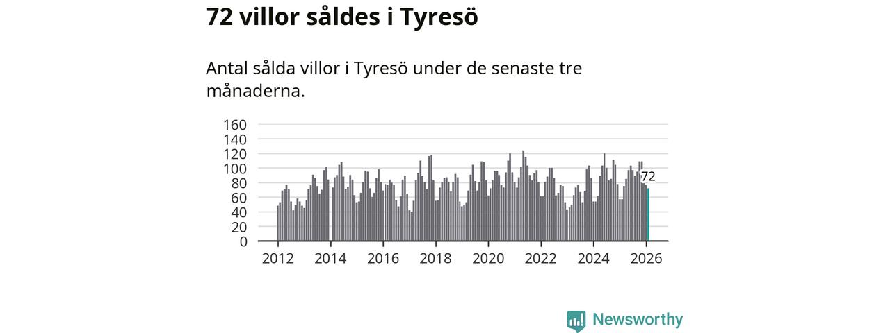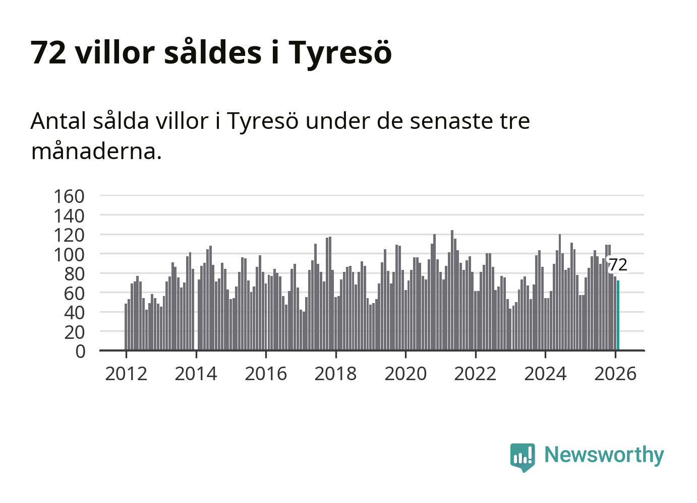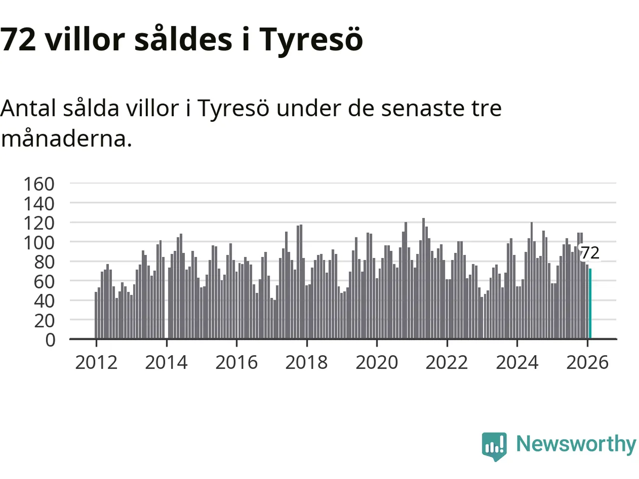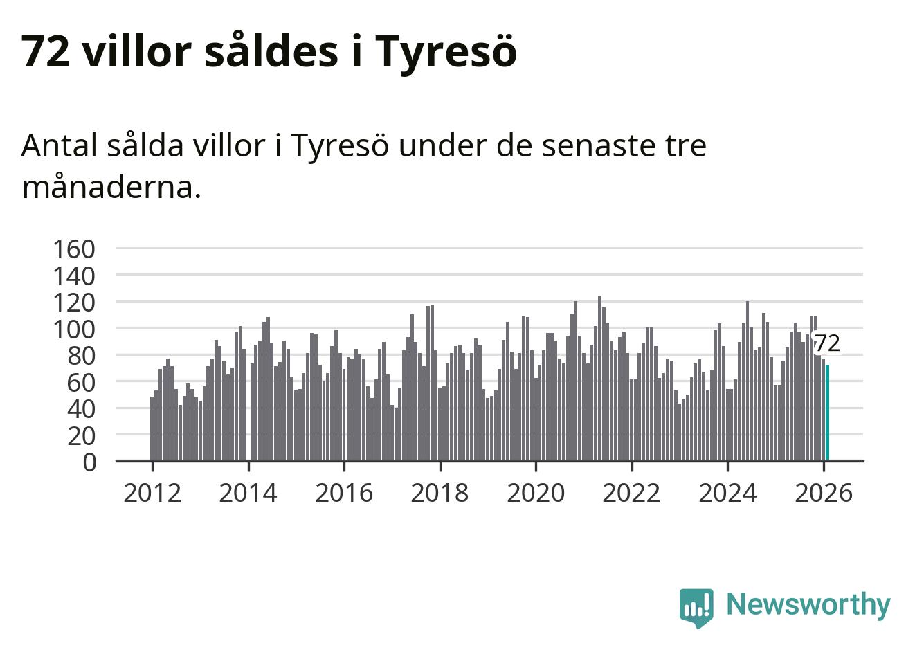 Sammanlagt såldes 72 villor i Tyresö kommun mellan december och februari till ett genomsnittligt pris på 6,1 miljoner kronor. I fjol gjordes 57 affärer vid den här tiden på året.