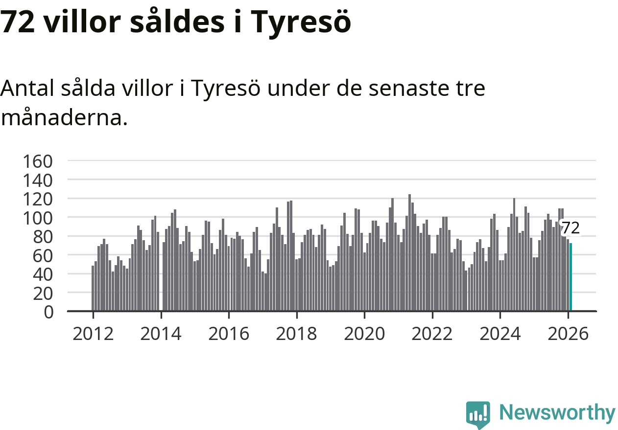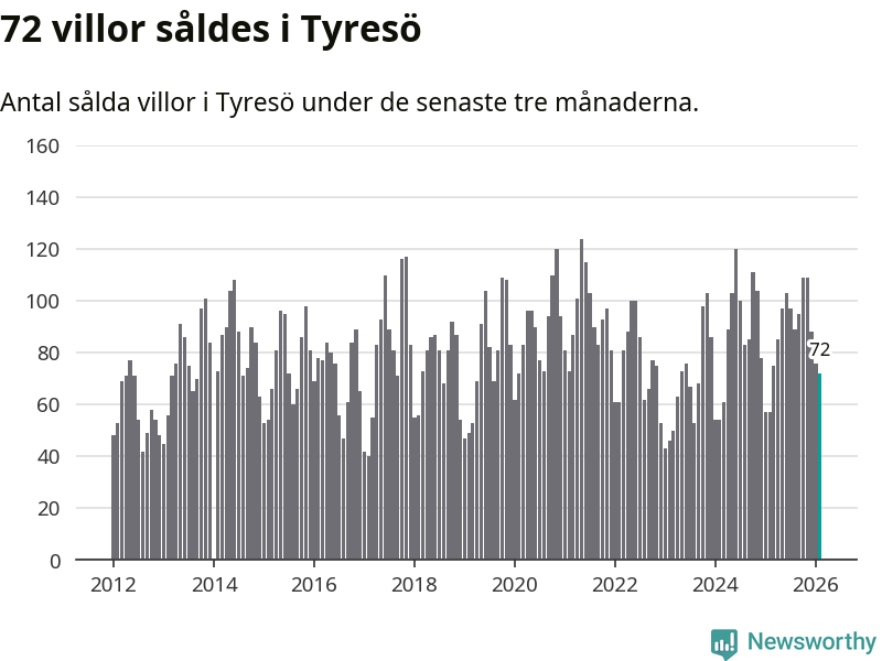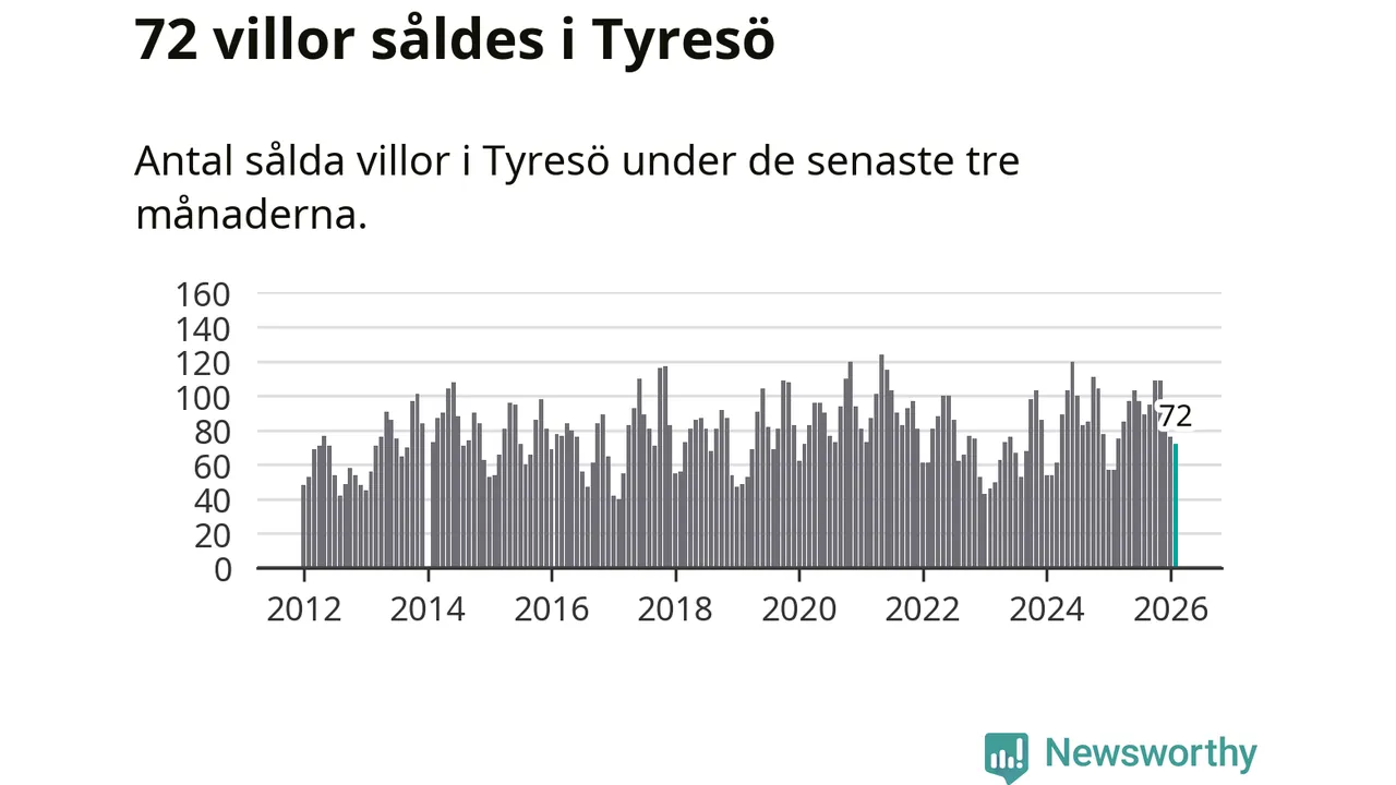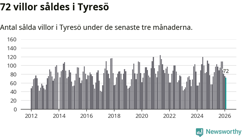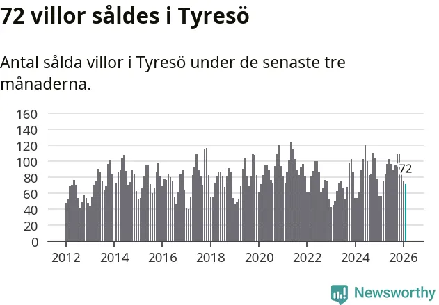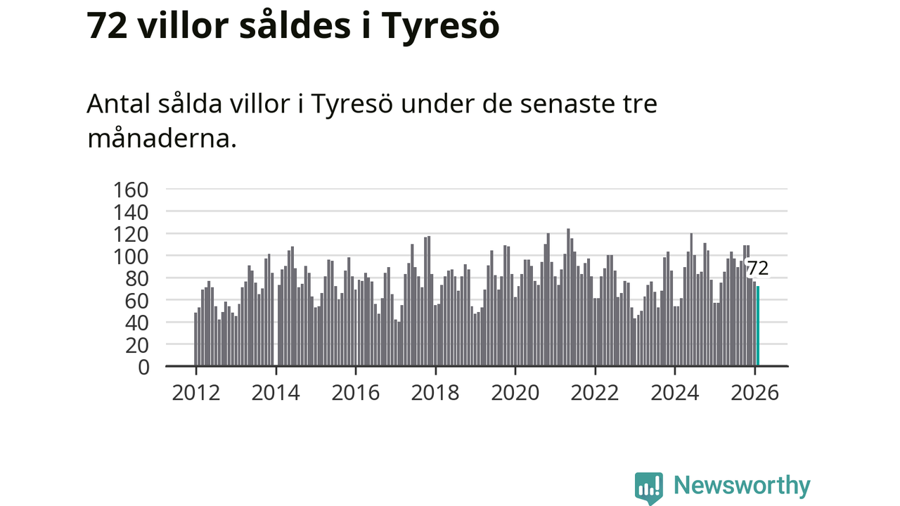 Sammanlagt såldes 72 villor i Tyresö kommun mellan december och februari till ett genomsnittligt pris på 6,1 miljoner kronor. I fjol gjordes 57 affärer vid den här tiden på året.
