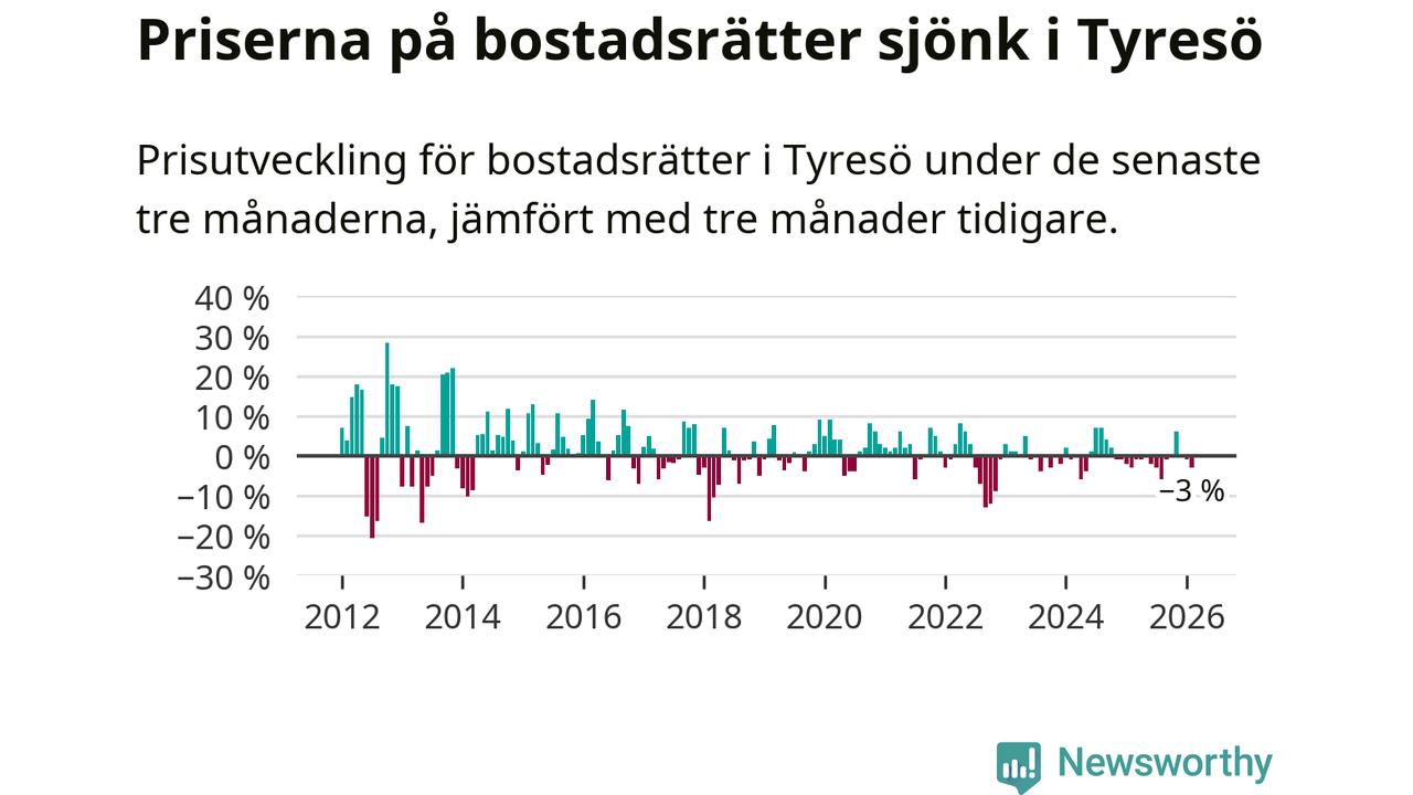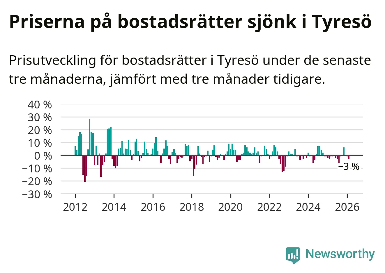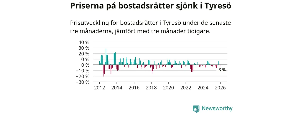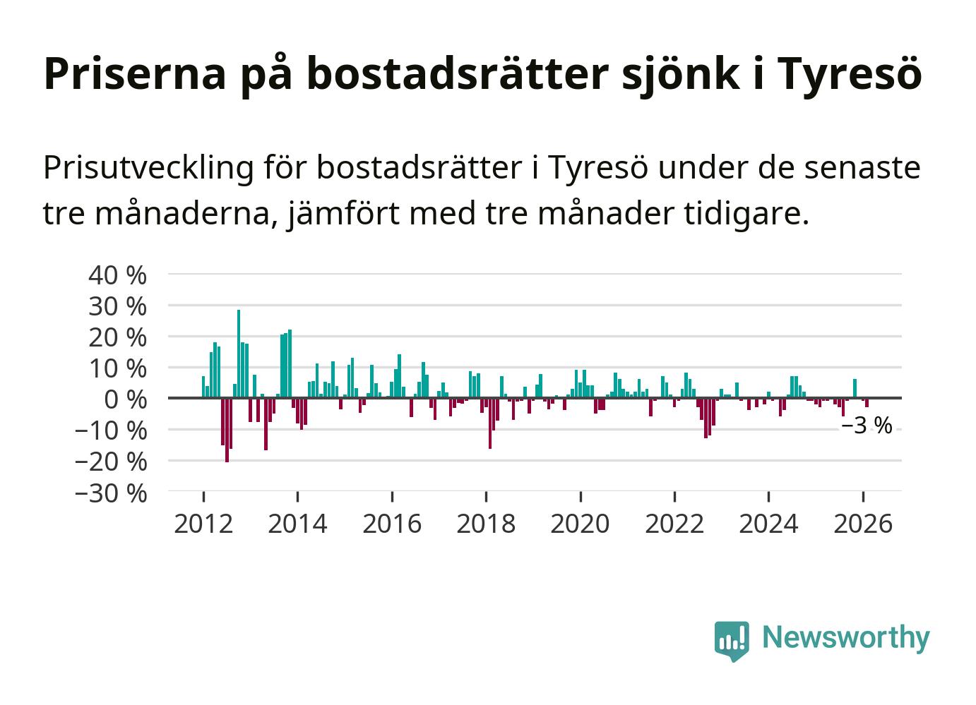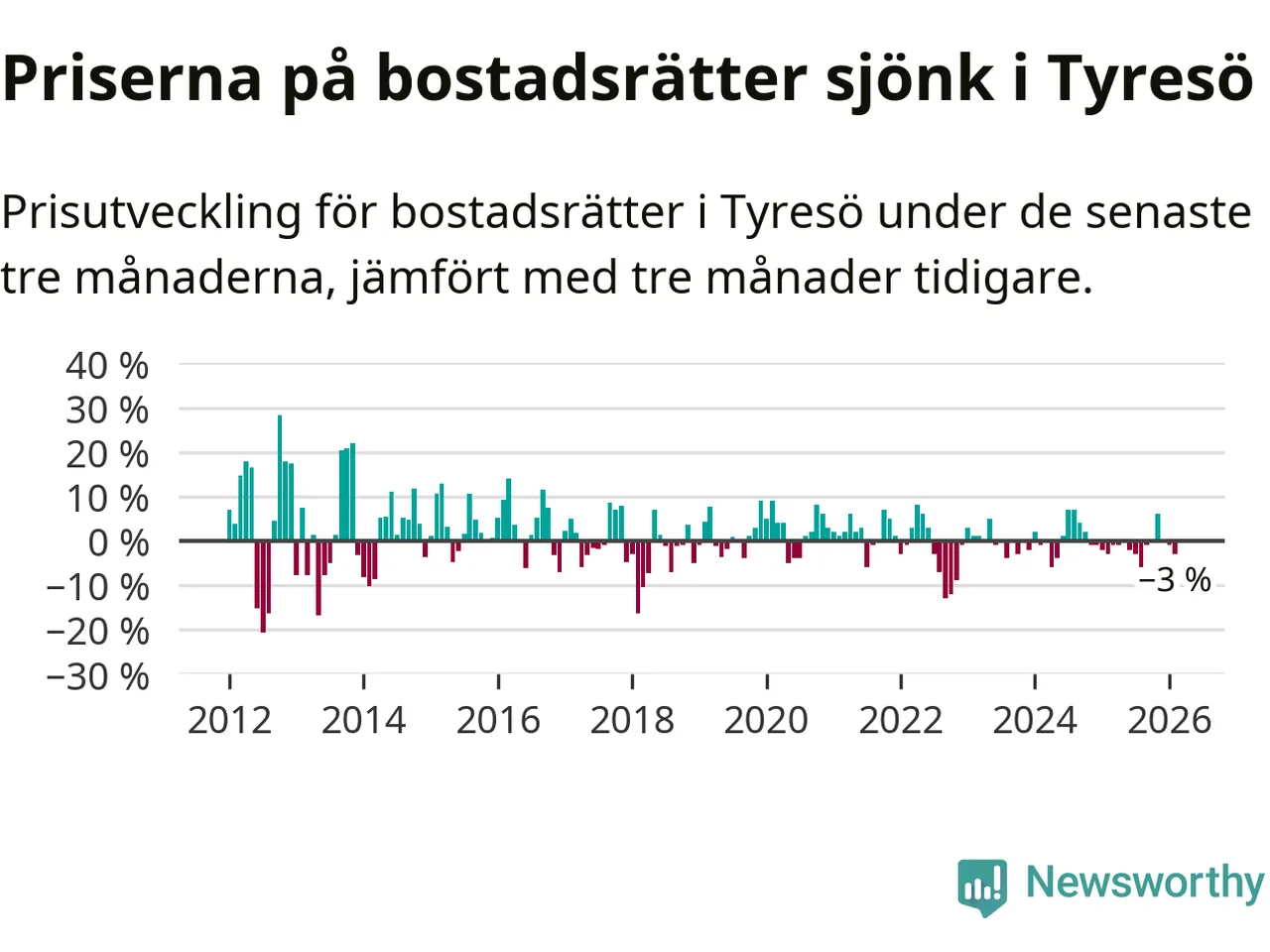 Priserna på bostadsrätter har gått ner i Tyresö kommun. Medelpriset på försäljningarna under de senaste tre månaderna visar på en nedgång med 3 procent.