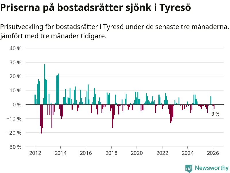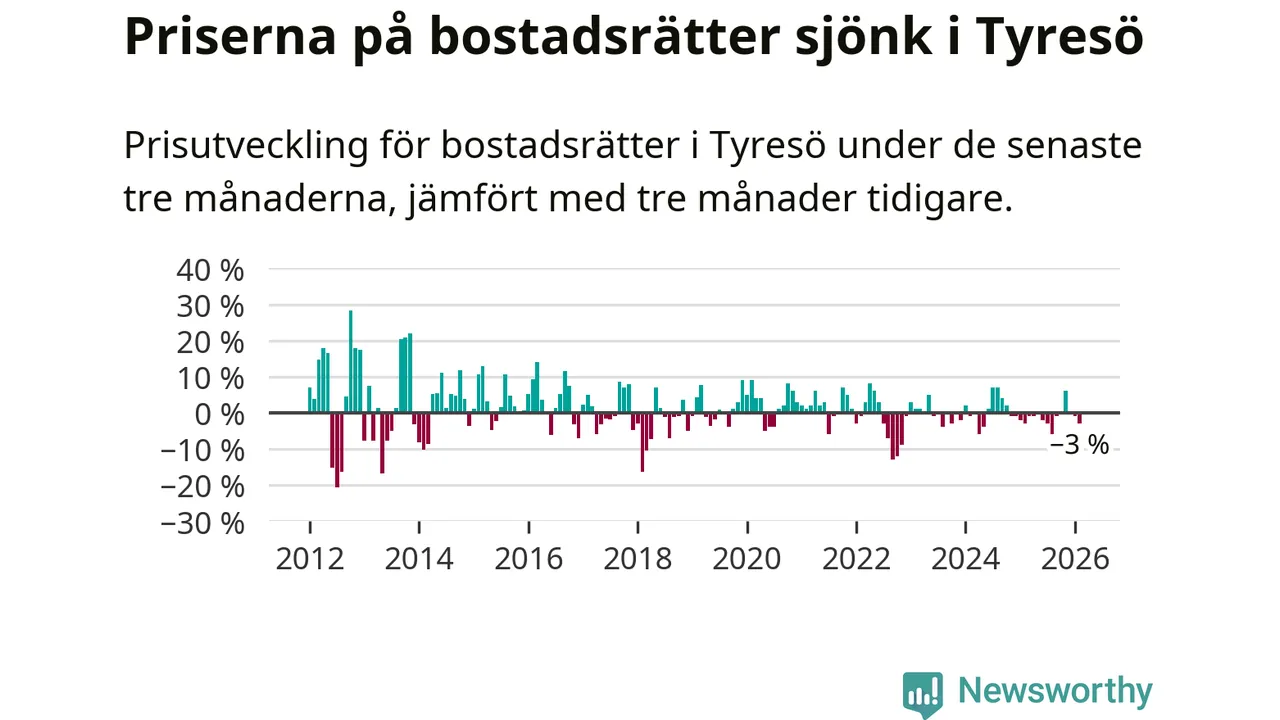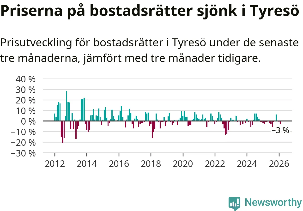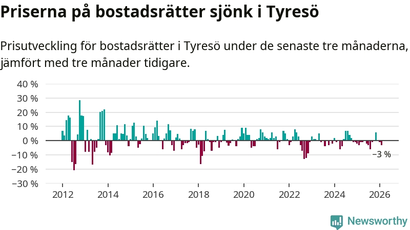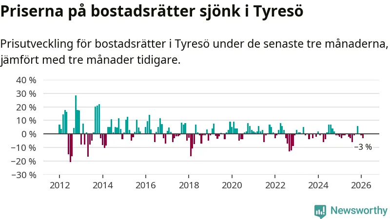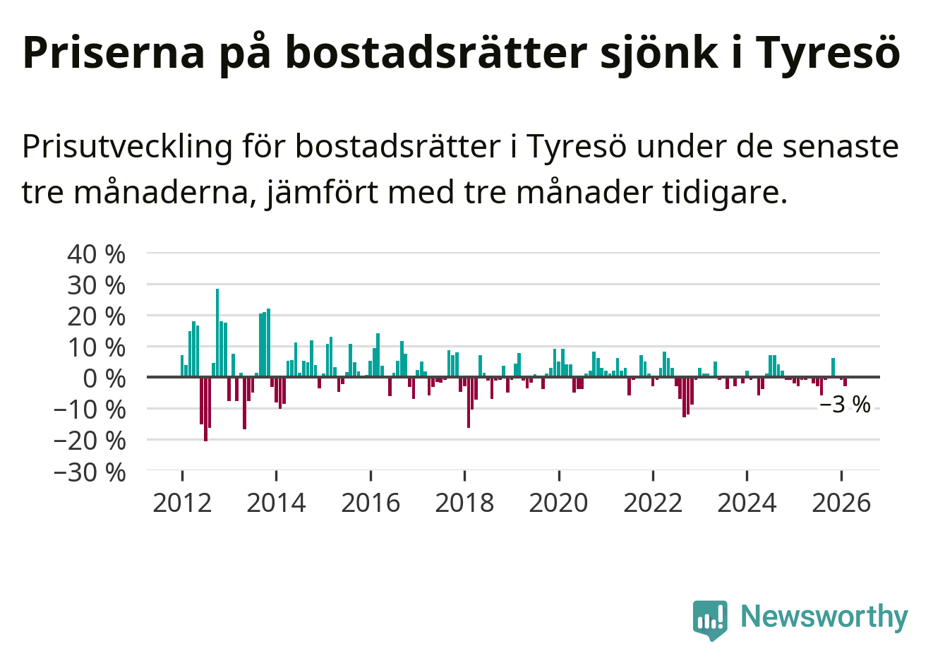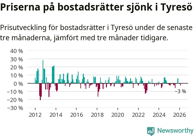 Priserna på bostadsrätter har gått ner i Tyresö kommun. Medelpriset på försäljningarna under de senaste tre månaderna visar på en nedgång med 3 procent.