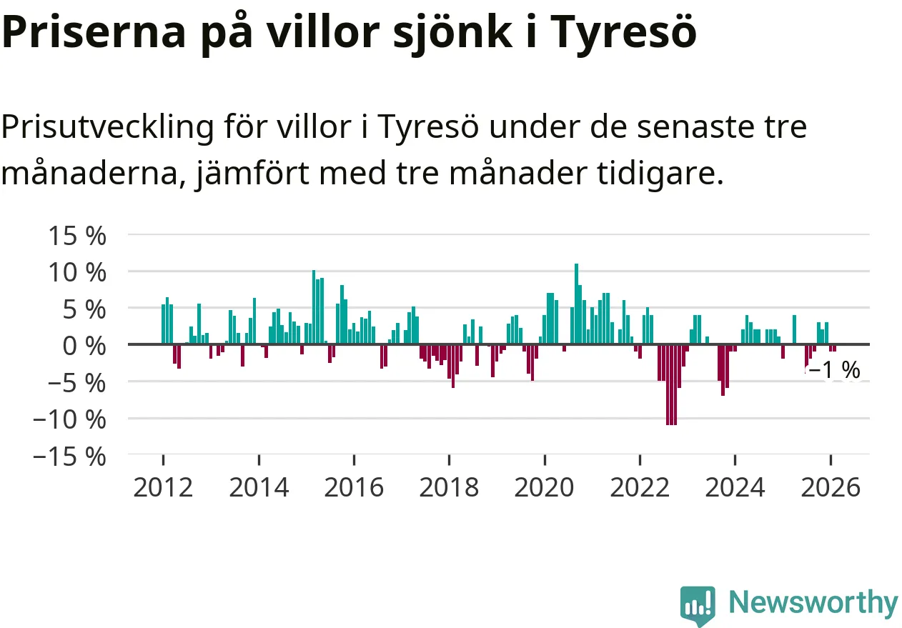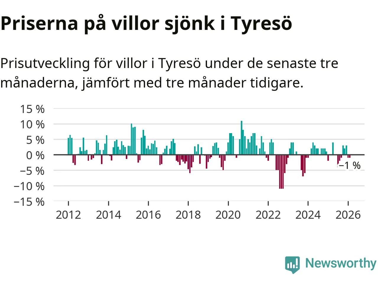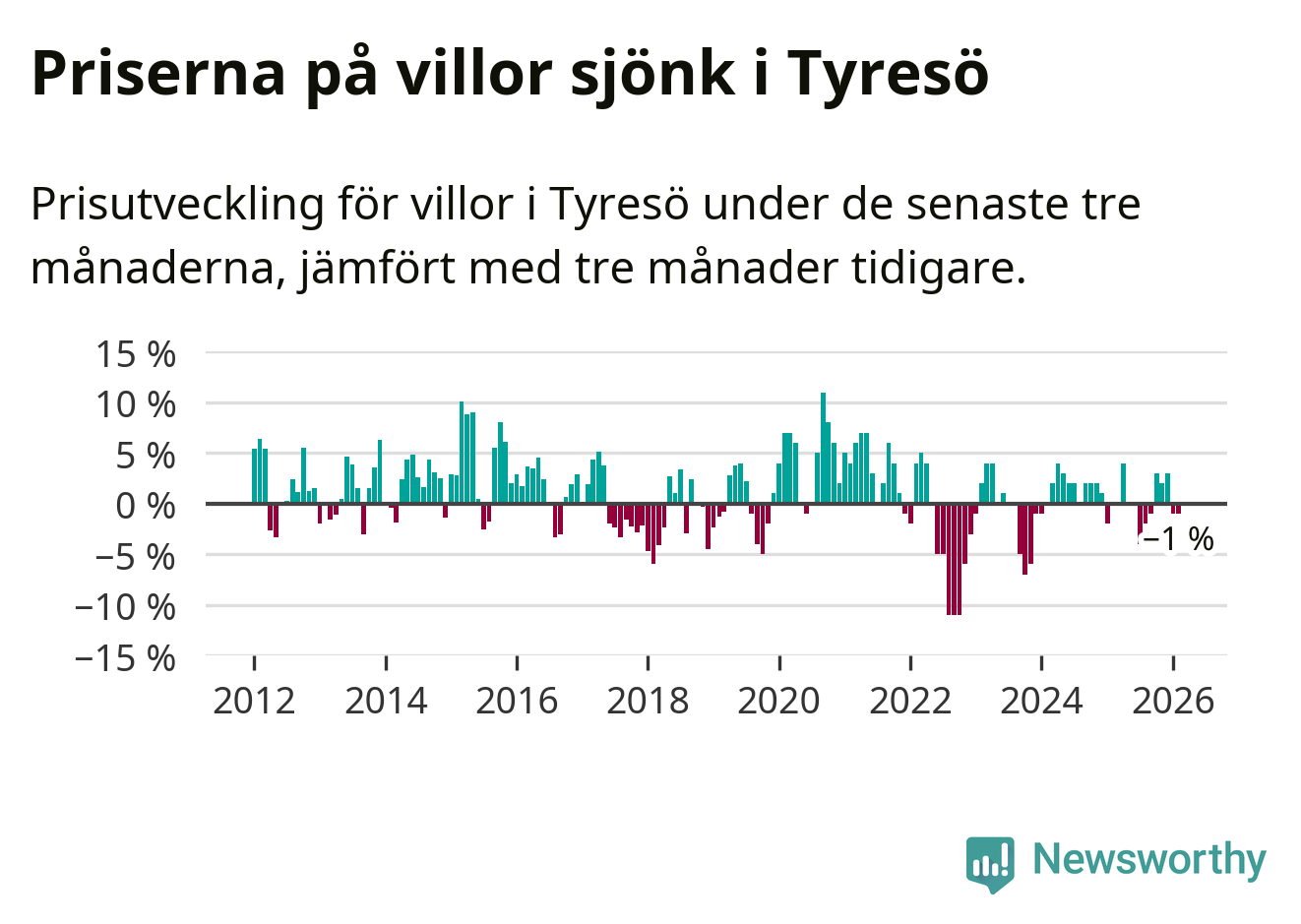 Villapriserna har gått ner i Tyresö kommun. Medelpriset på försäljningarna under de senaste tre månaderna visar på en nedgång med 1 procent.