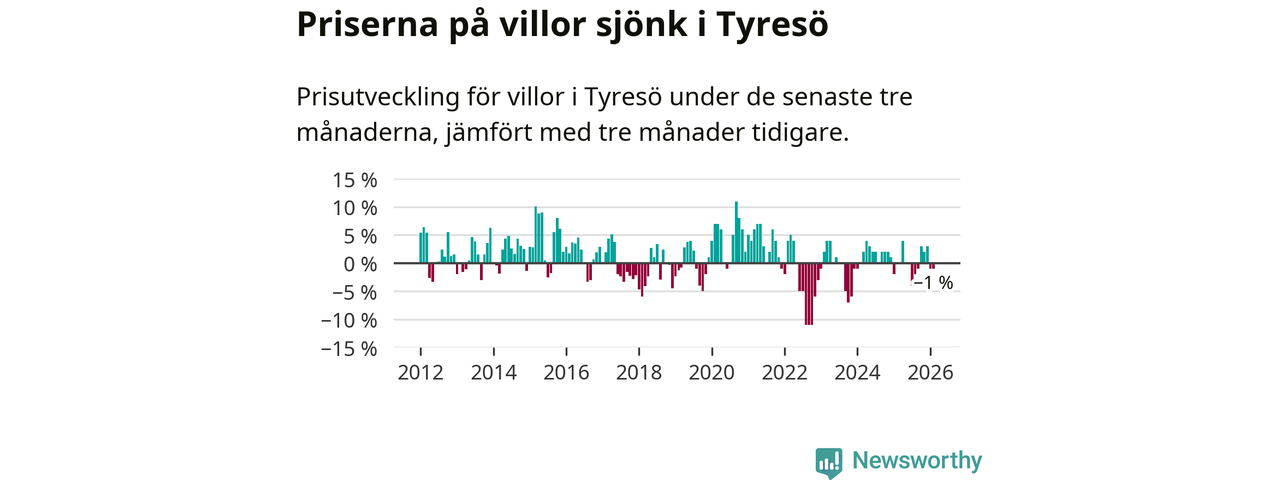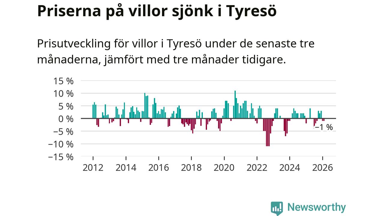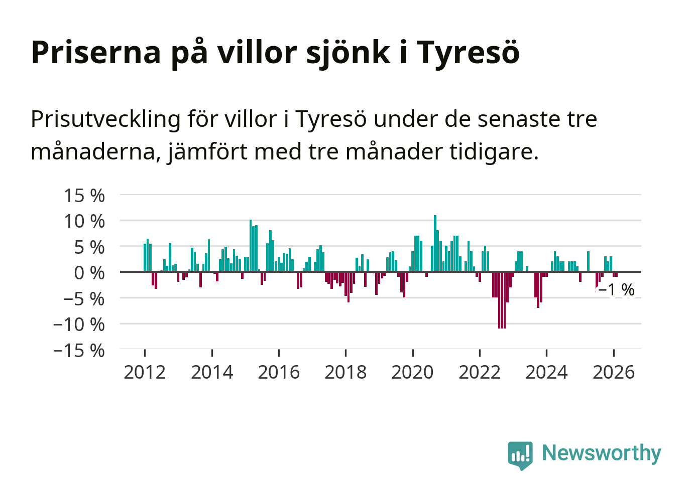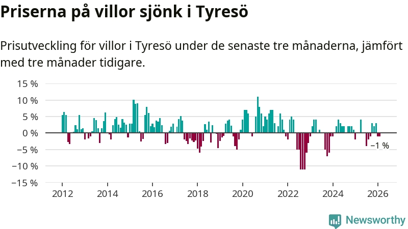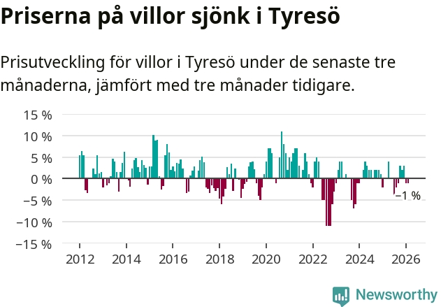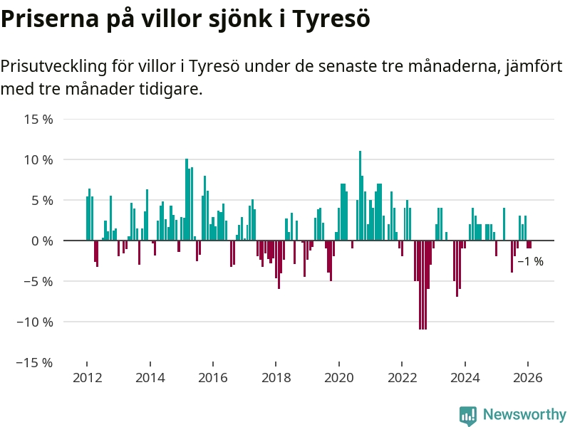 Villapriserna har gått ner i Tyresö kommun. Medelpriset på försäljningarna under de senaste tre månaderna visar på en nedgång med 1 procent.