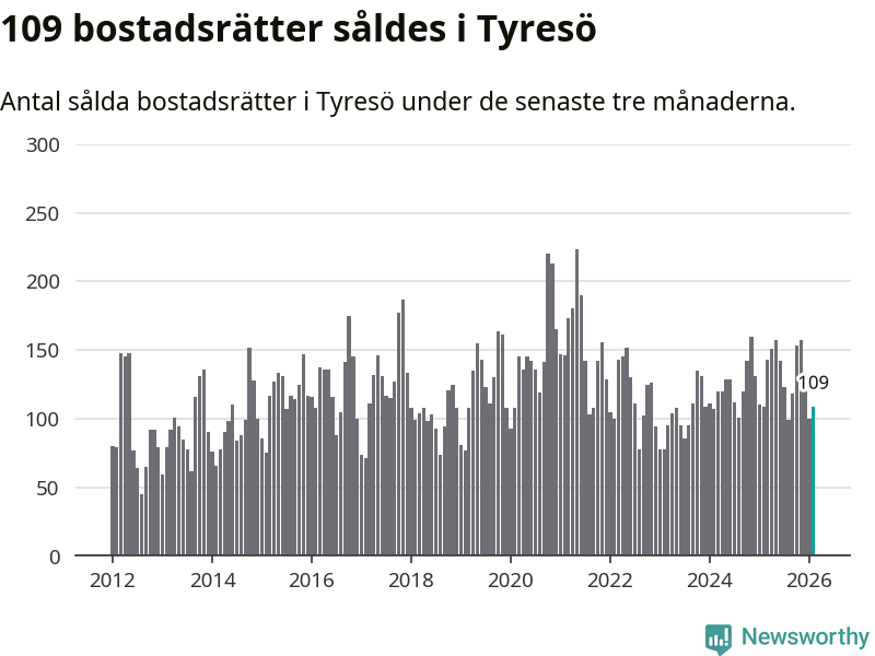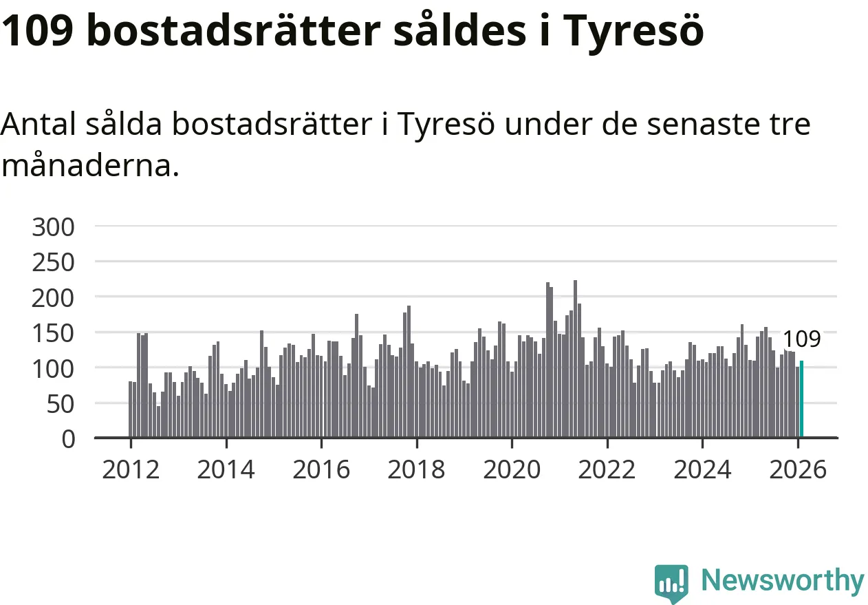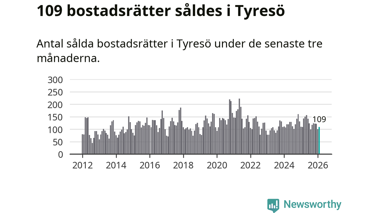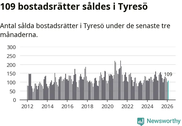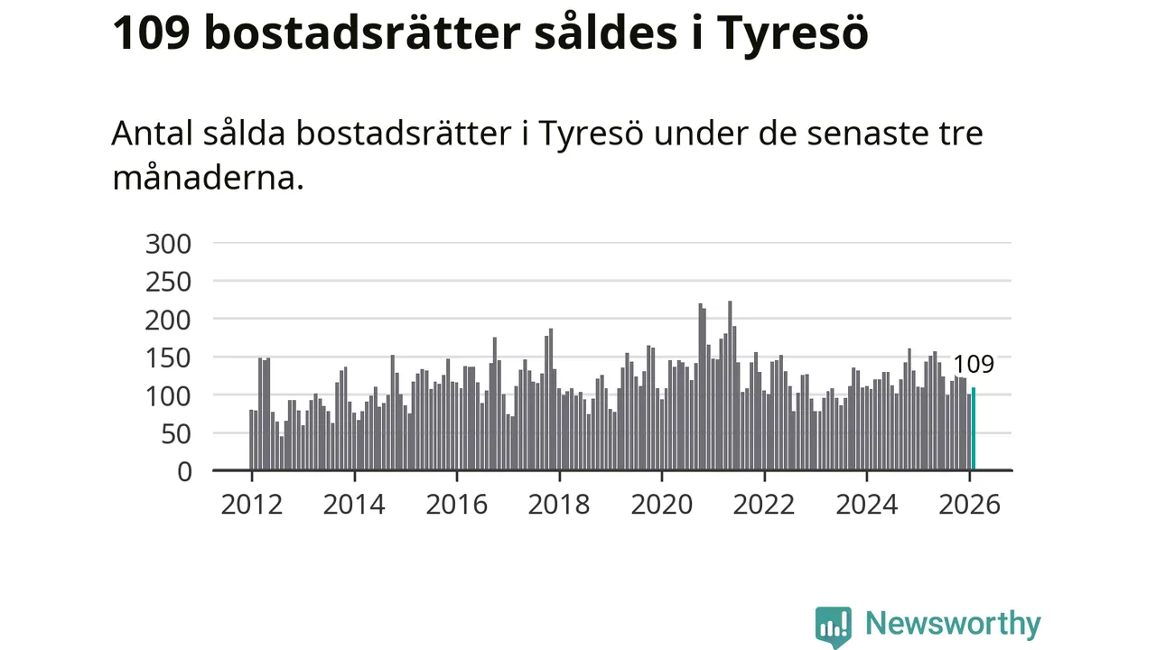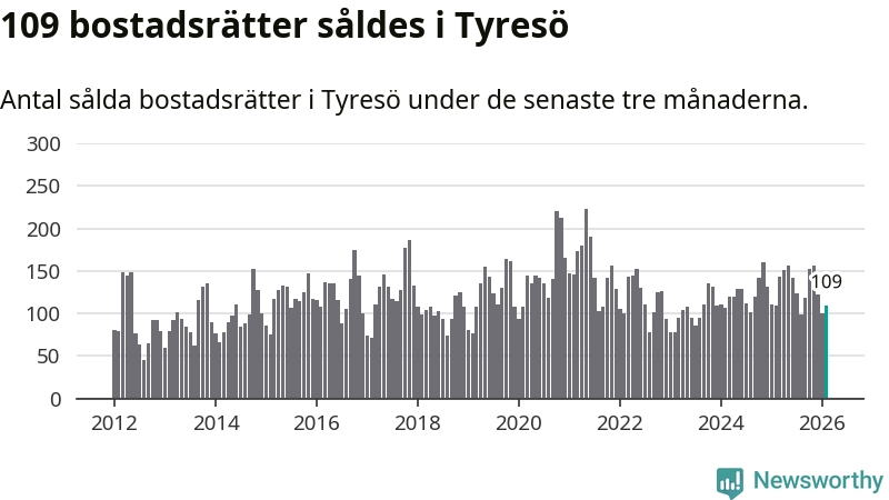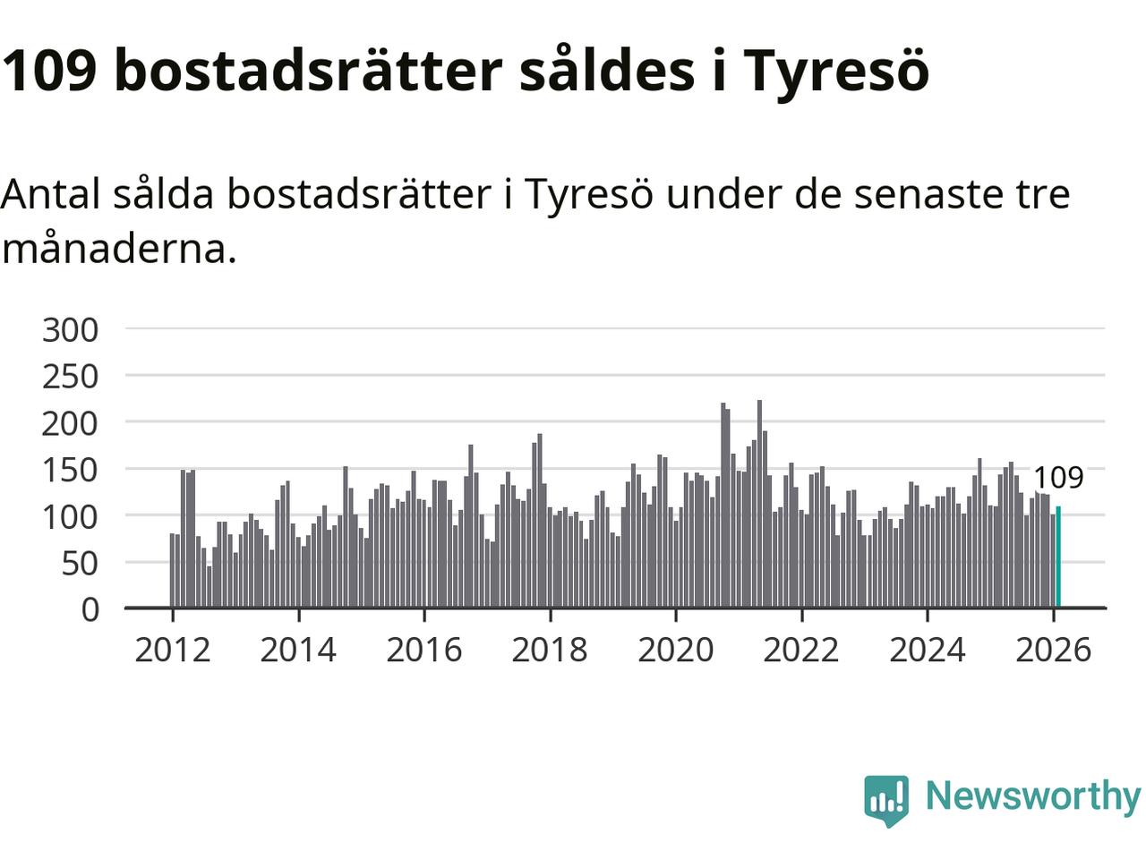 Sammanlagt såldes 109 bostadsrätter i Tyresö kommun mellan december och februari till ett genomsnittligt pris på 2,8 miljoner kronor. I fjol gjordes 109 affärer vid den här tiden på året.