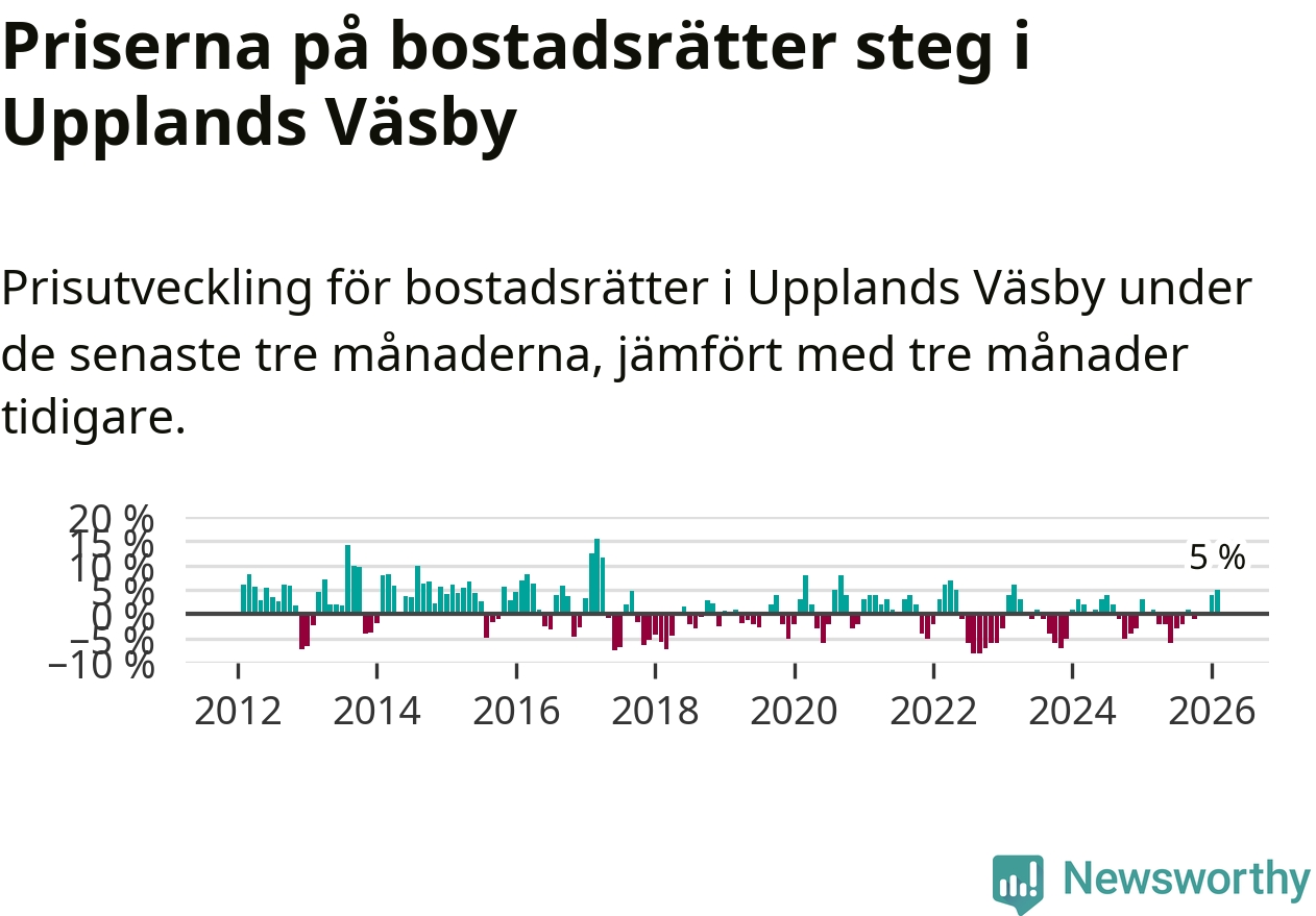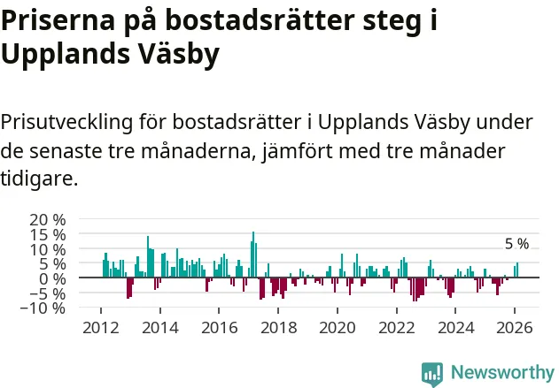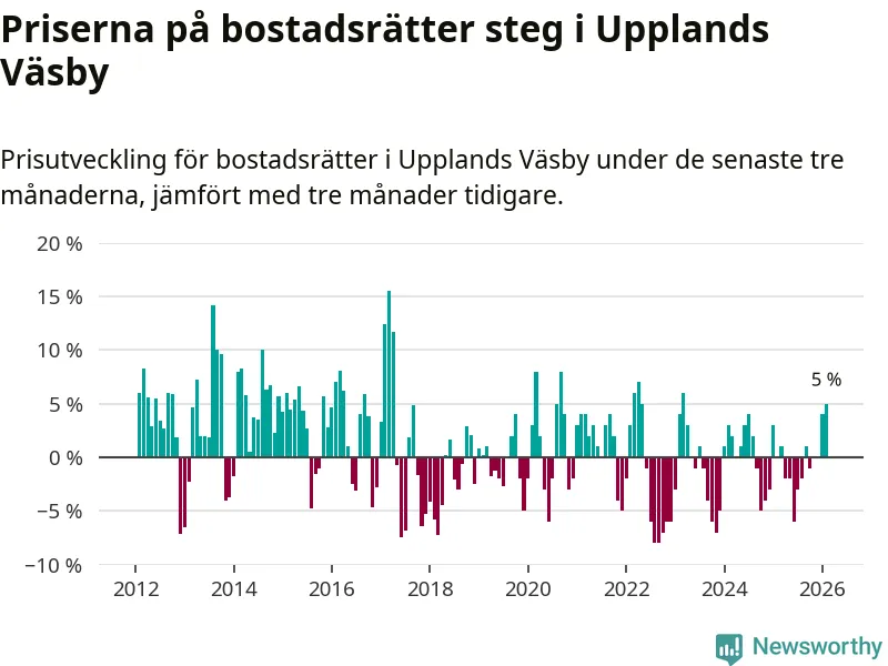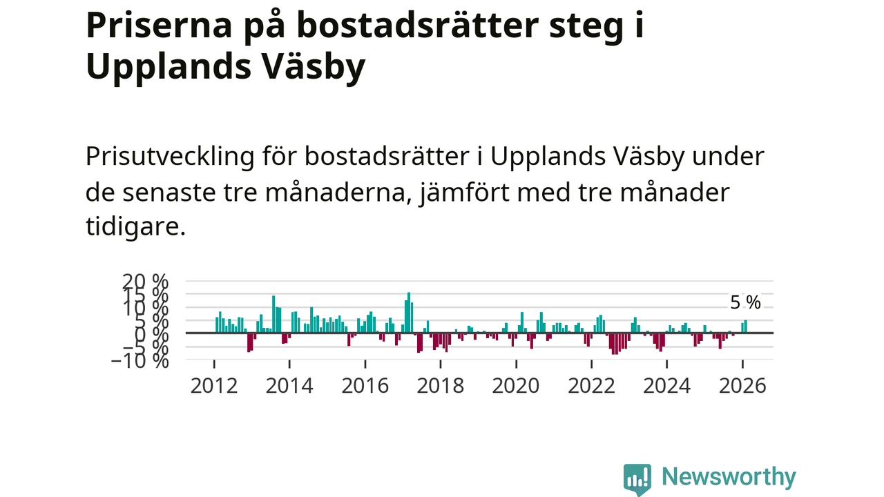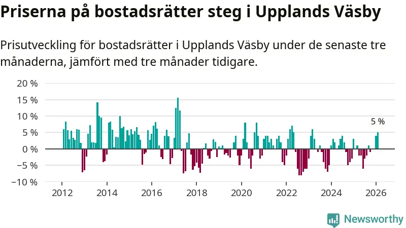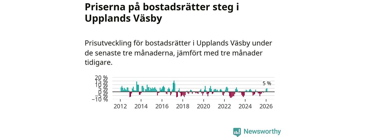 Statistiken visar även på en kännbar prisuppgång i Upplands Väsby kommun. Medelpriset på försäljningarna av bostadsrätter i kommunen var 5 procent högre än för tre månader sedan. I hela Stockholms län däremot ligger priserna på bostadsrätter stilla.