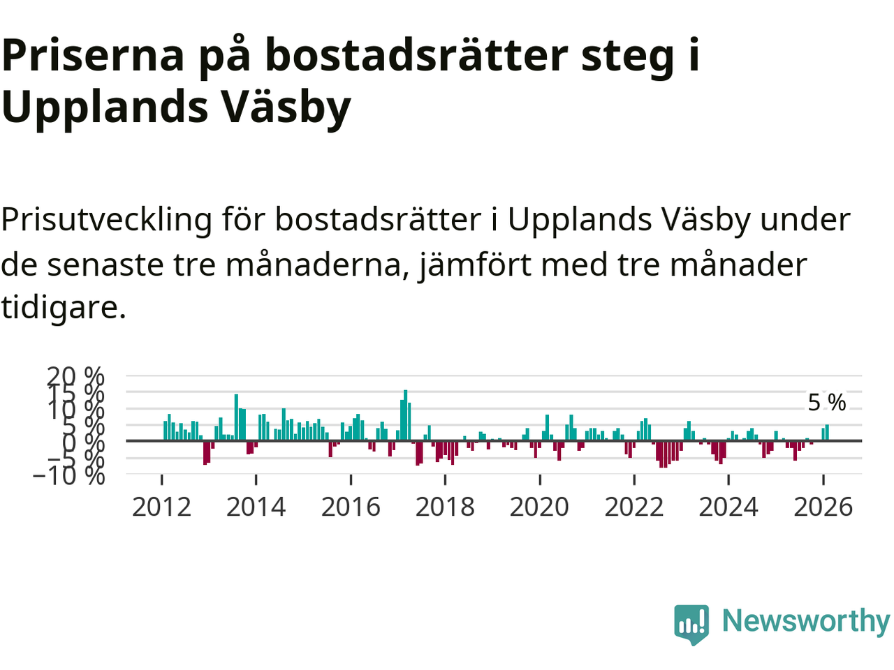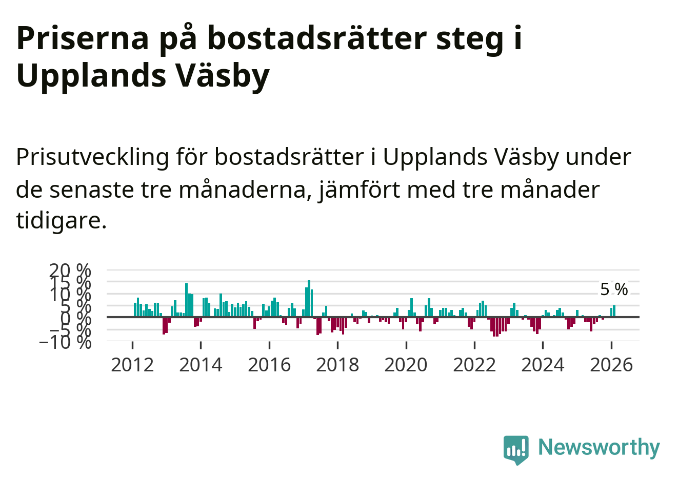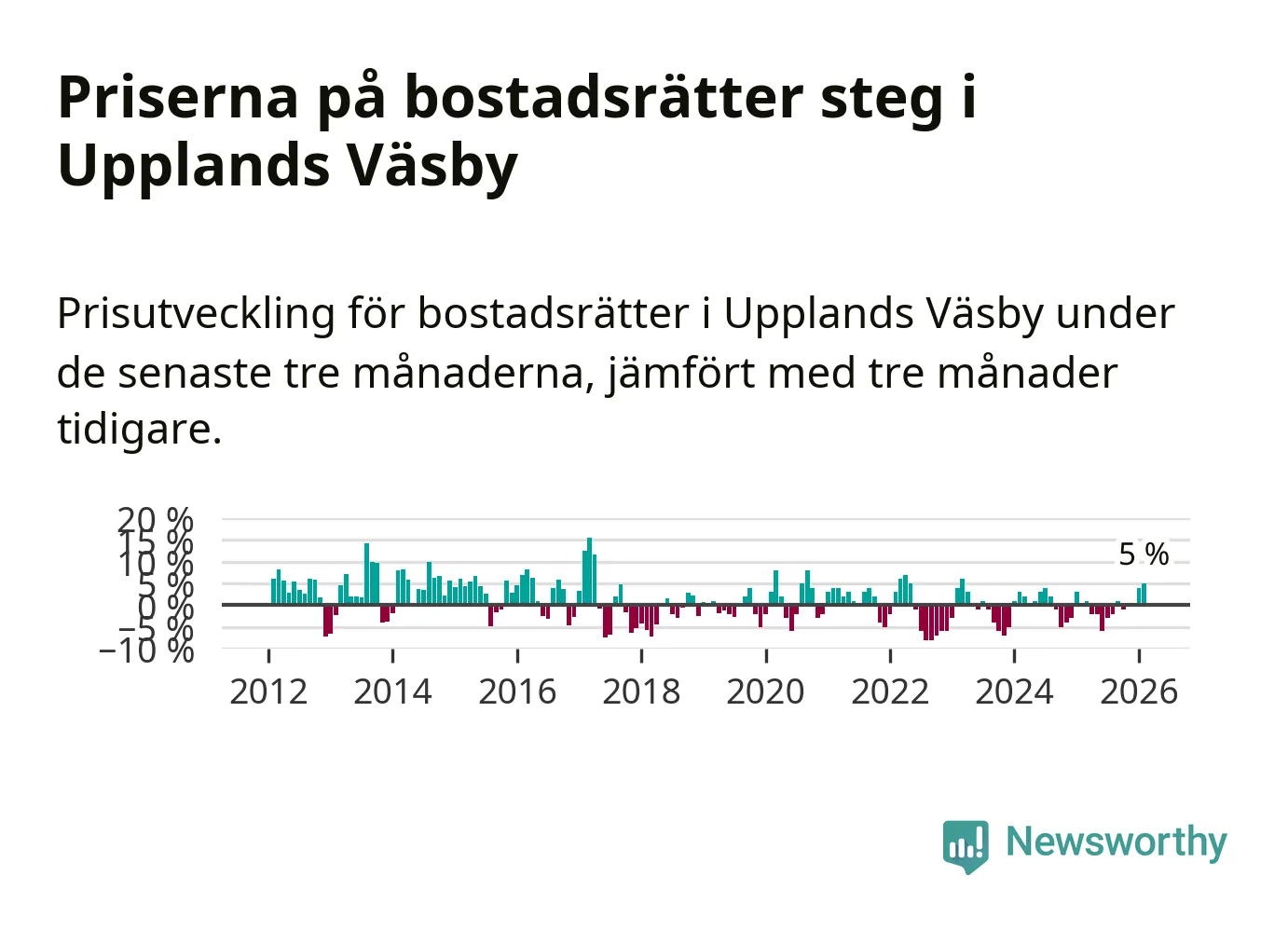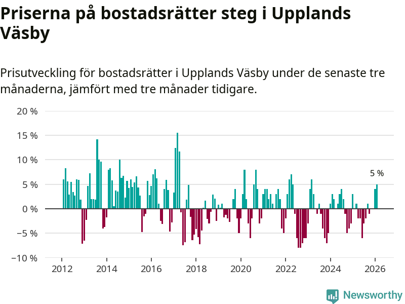 Statistiken visar även på en kännbar prisuppgång i Upplands Väsby kommun. Medelpriset på försäljningarna av bostadsrätter i kommunen var 5 procent högre än för tre månader sedan. I hela Stockholms län däremot ligger priserna på bostadsrätter stilla.