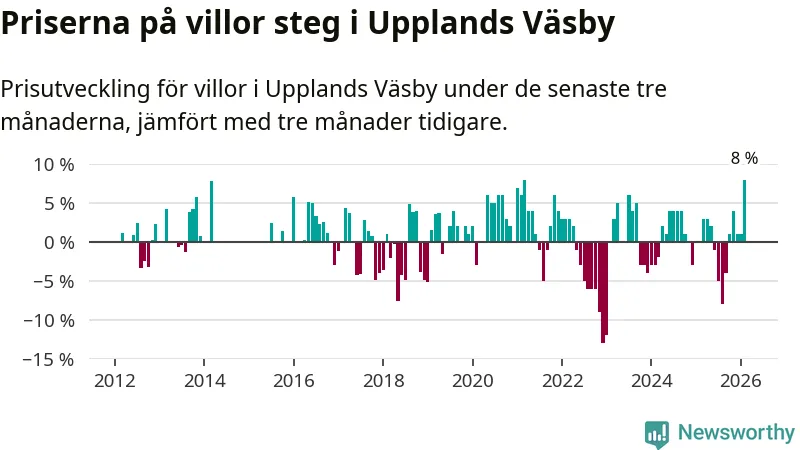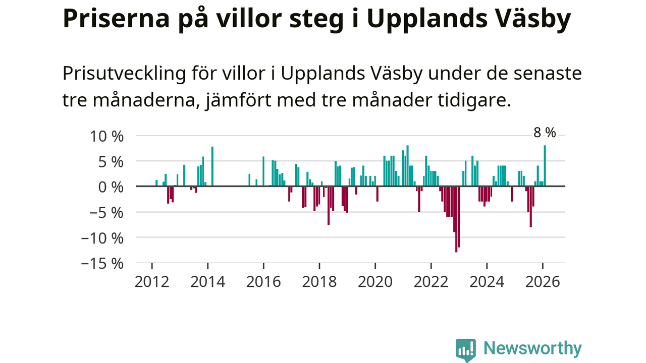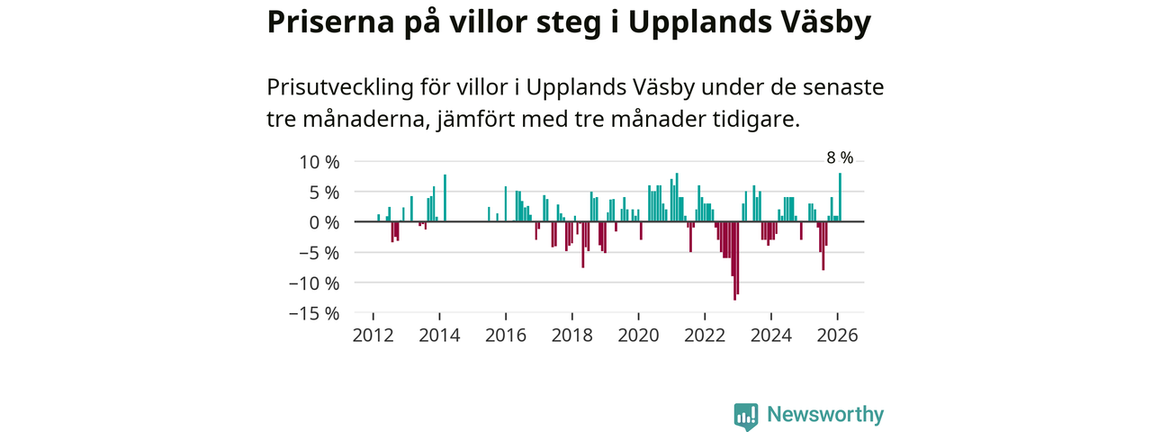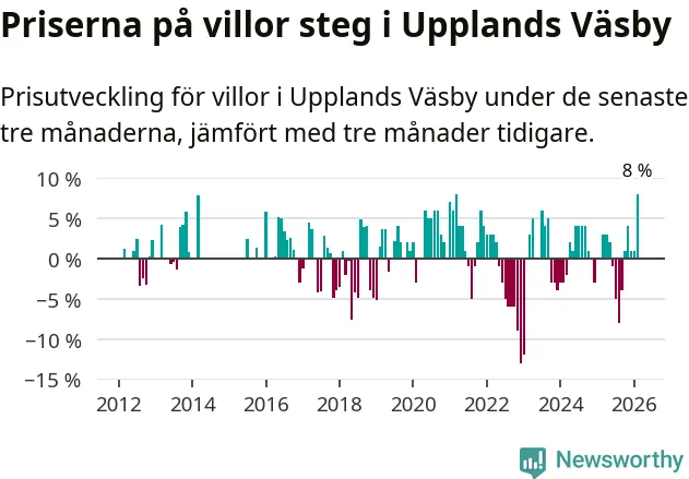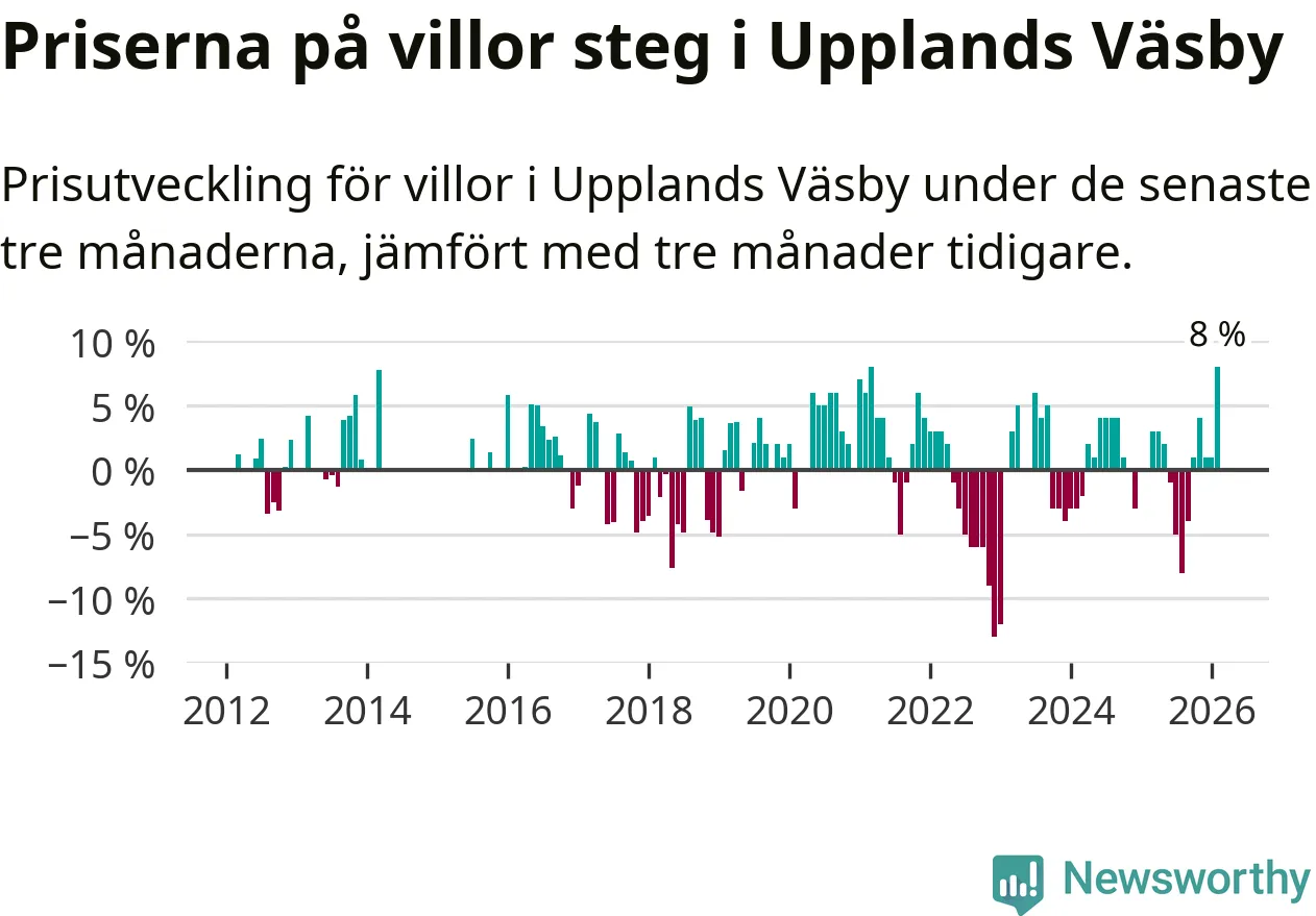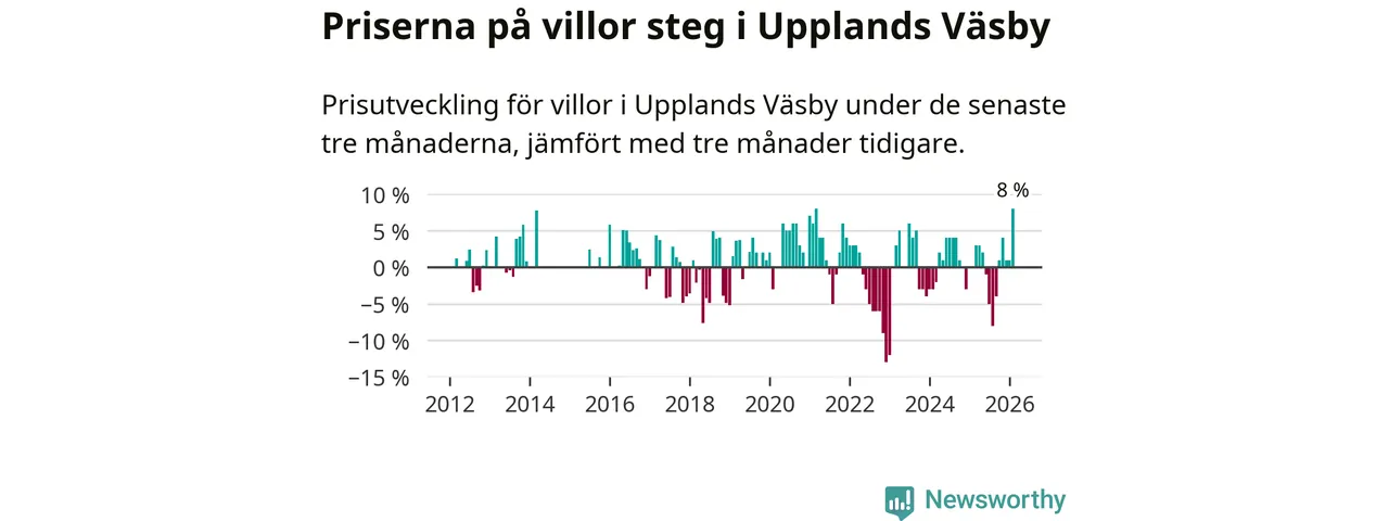 Villapriserna steg med åtta procent i Upplands Väsby kommun under de senaste tre månaderna. Det är den starkaste prisutvecklingen sedan 2021.