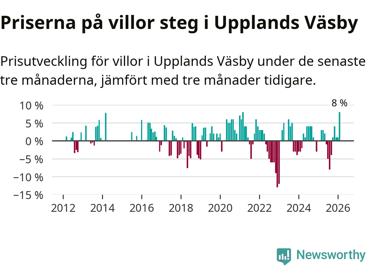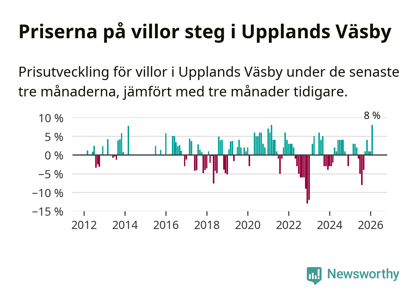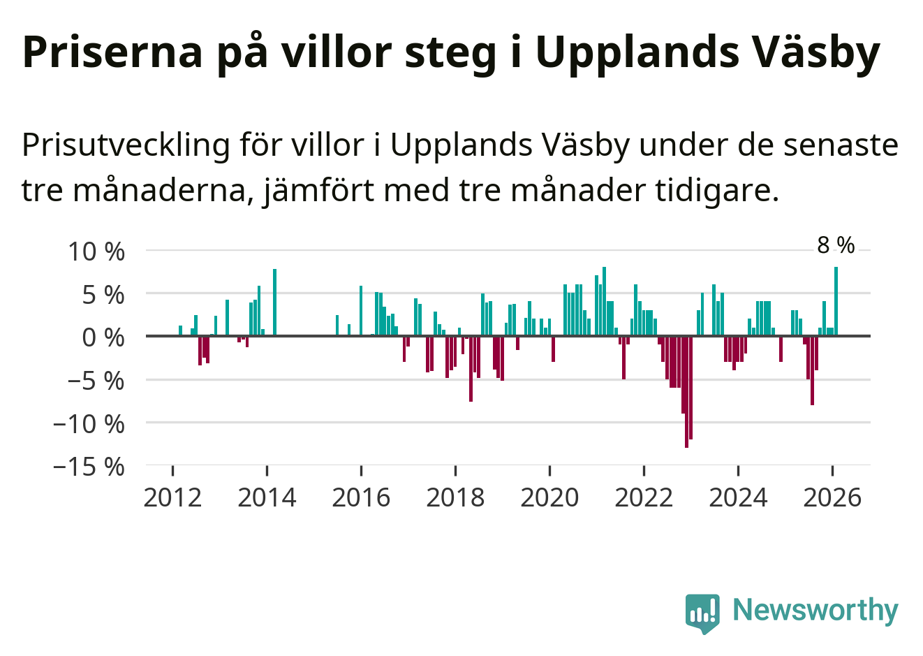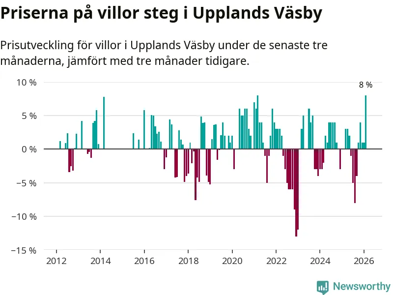Villapriserna steg med åtta procent i Upplands Väsby kommun under de senaste tre månaderna. Det är den starkaste prisutvecklingen sedan 2021.