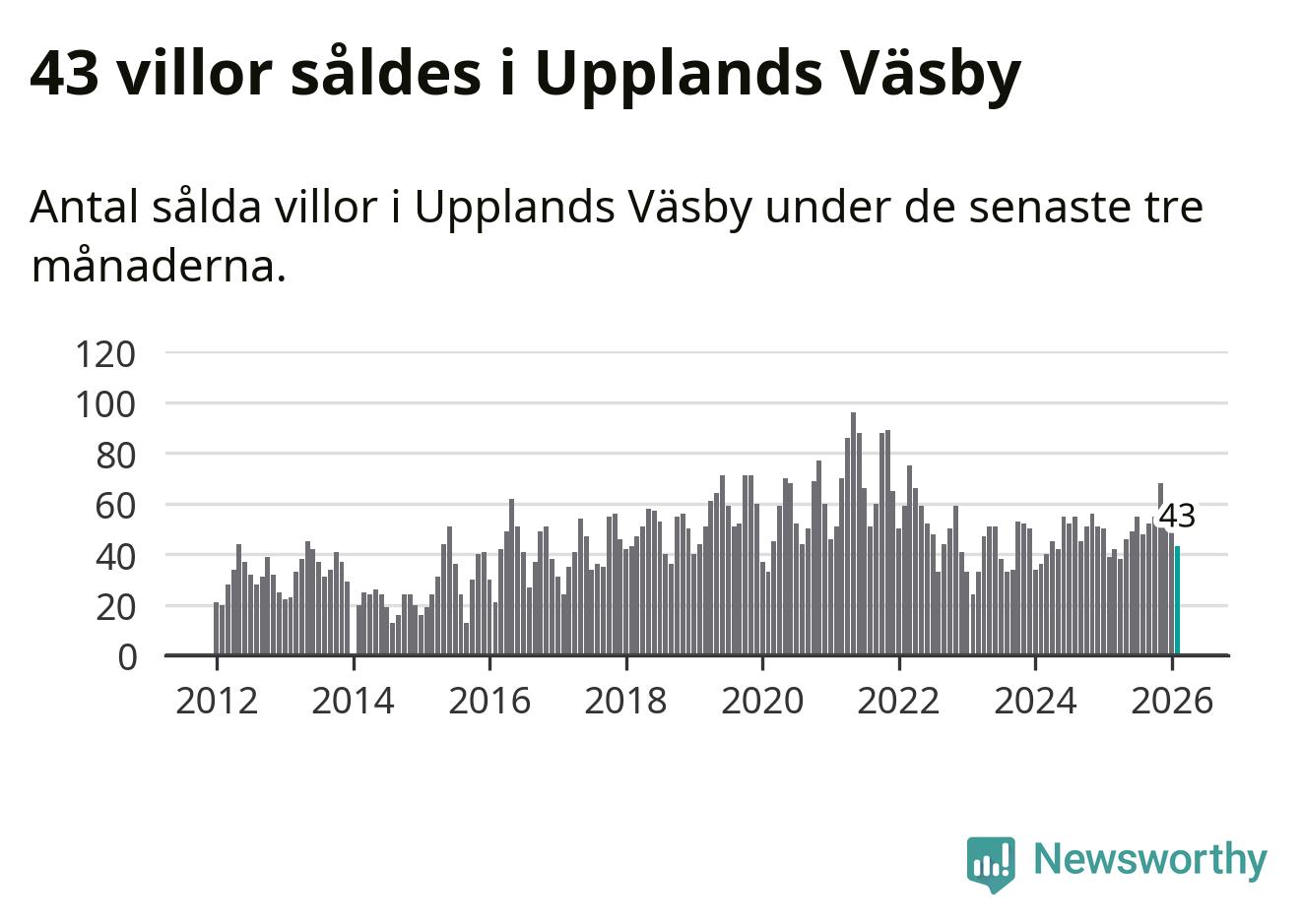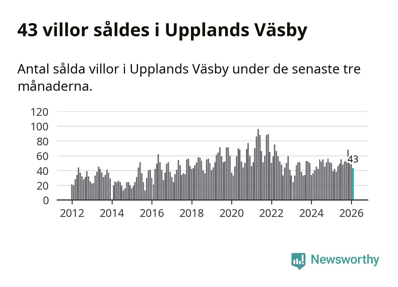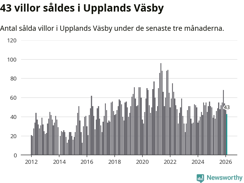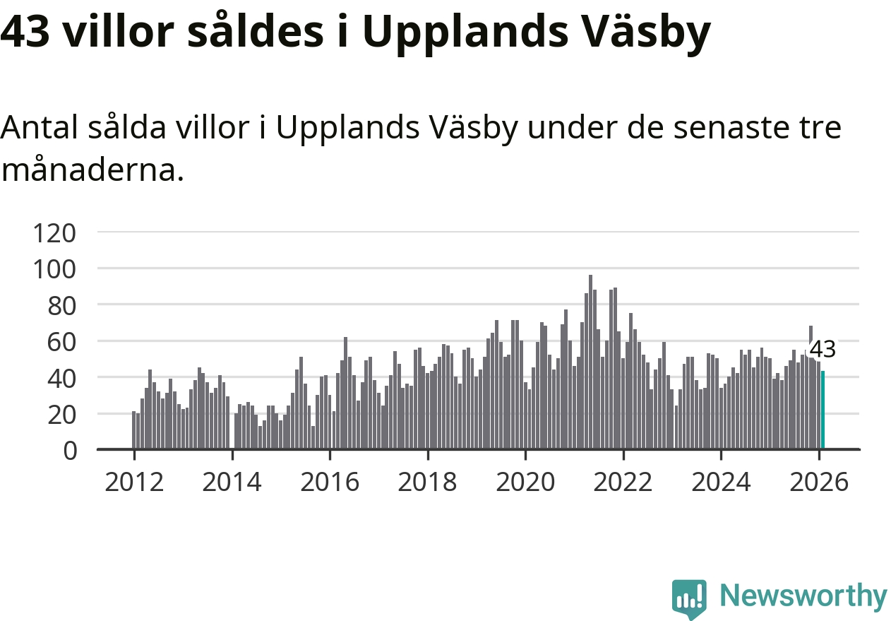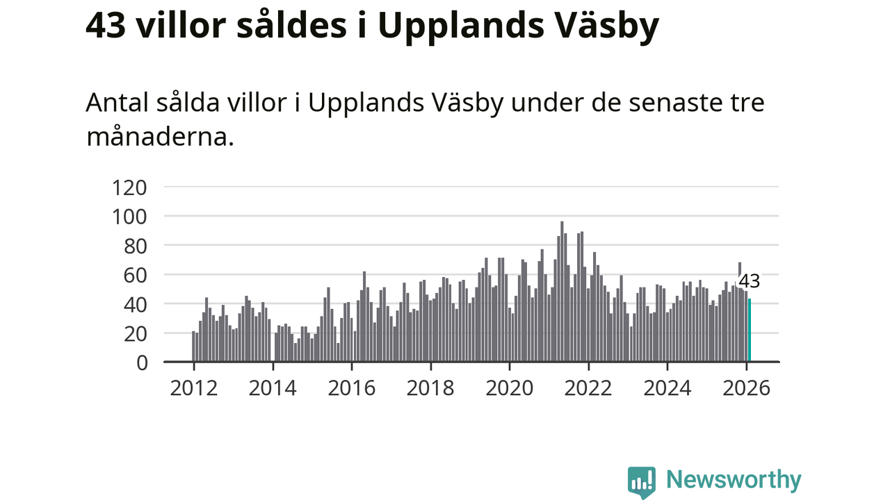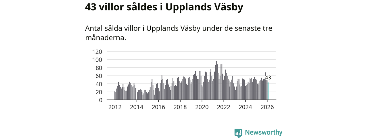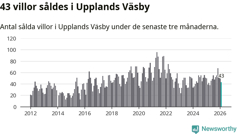 Sammanlagt såldes 43 villor i Upplands Väsby kommun mellan december och februari till ett genomsnittligt pris på 6,2 miljoner kronor. I fjol gjordes 39 affärer vid den här tiden på året.