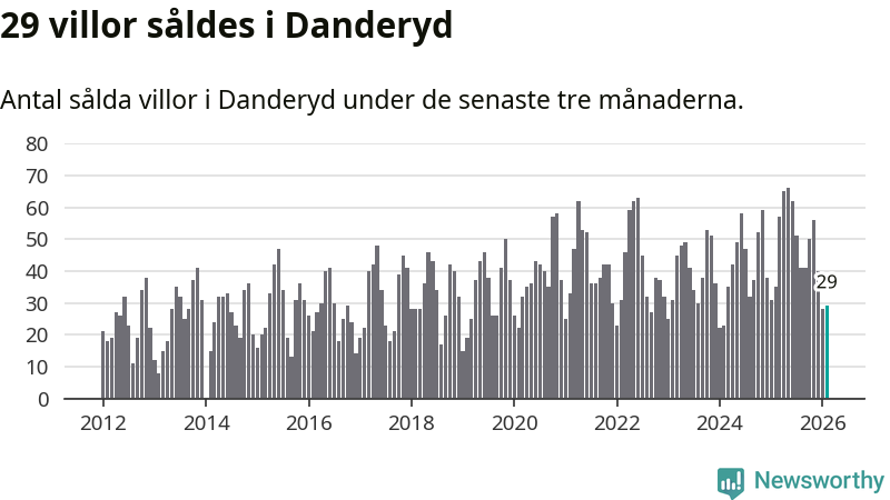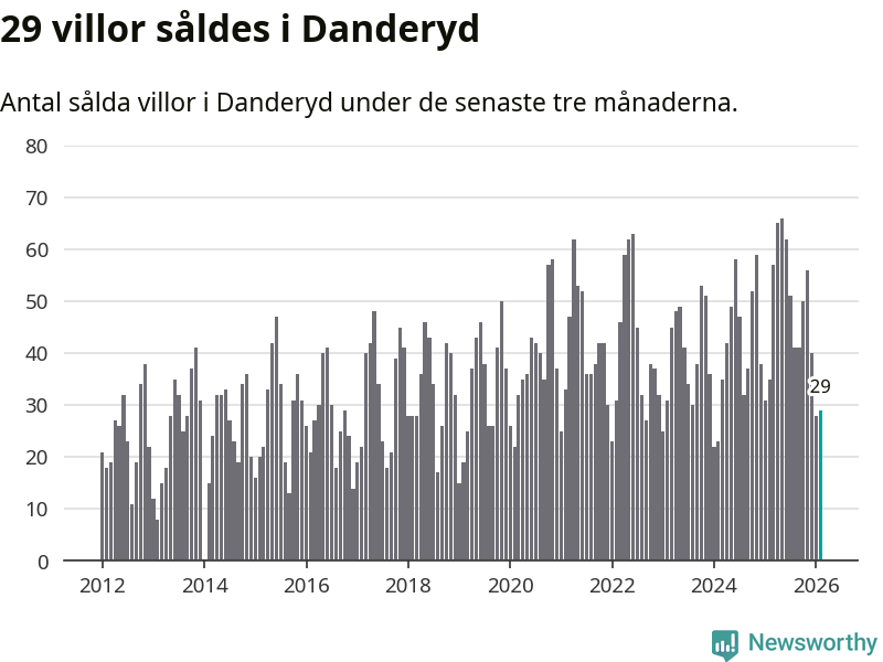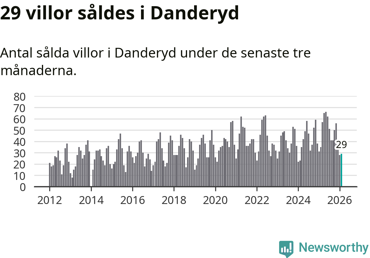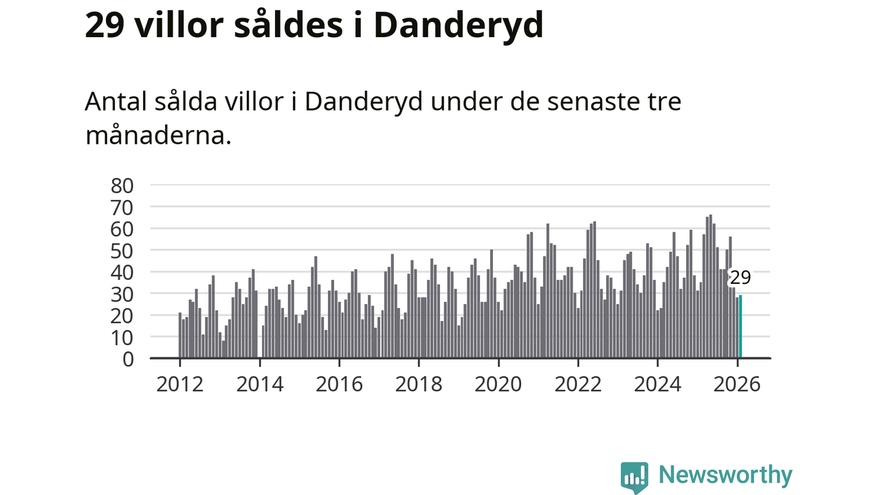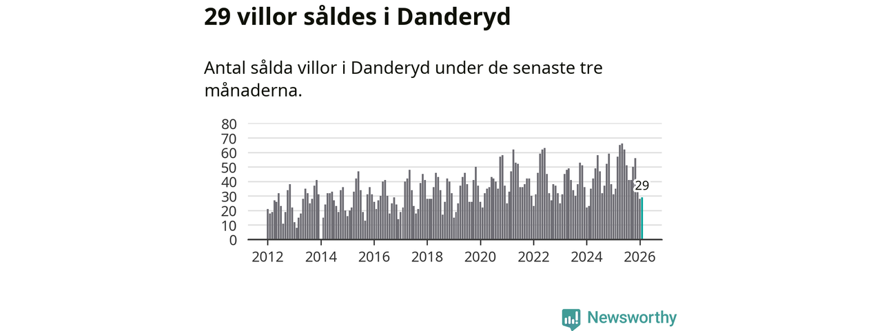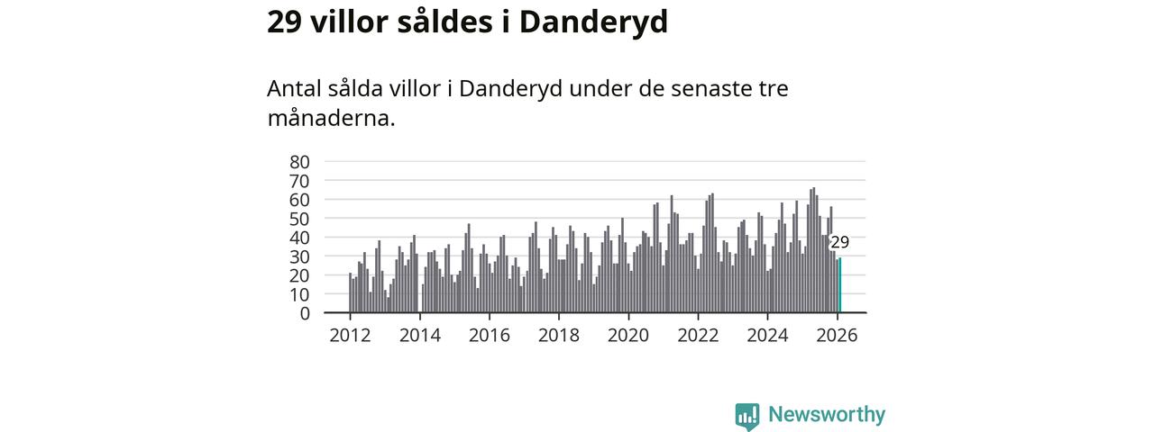 Sammanlagt såldes 29 villor i Danderyds kommun mellan december och februari till ett genomsnittligt pris på 14,1 miljoner kronor. I fjol gjordes 35 affärer vid den här tiden på året.