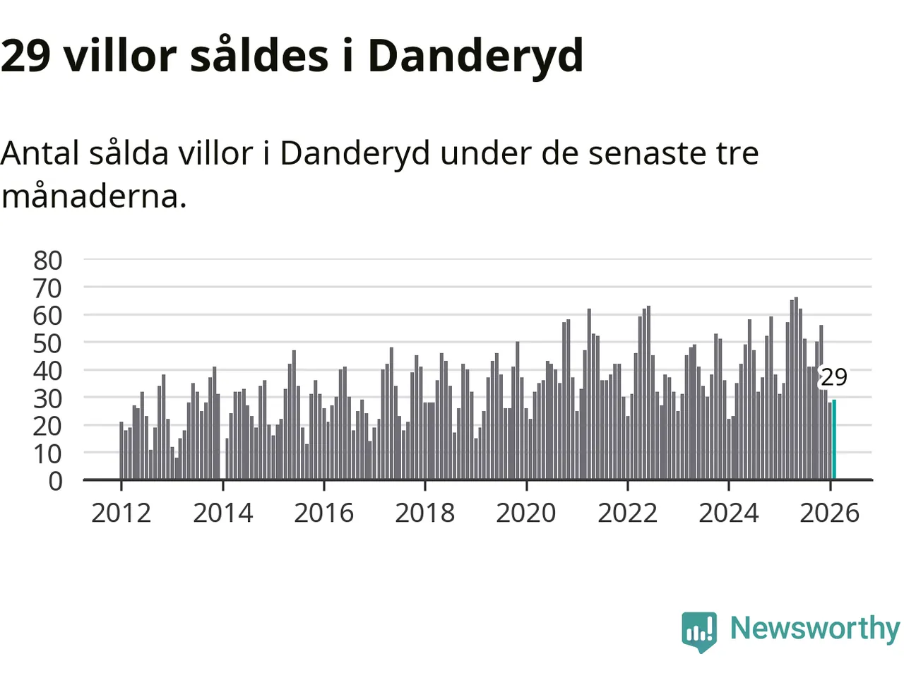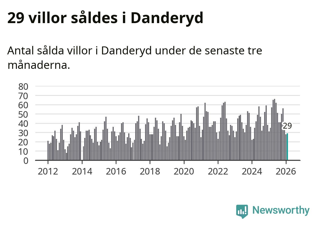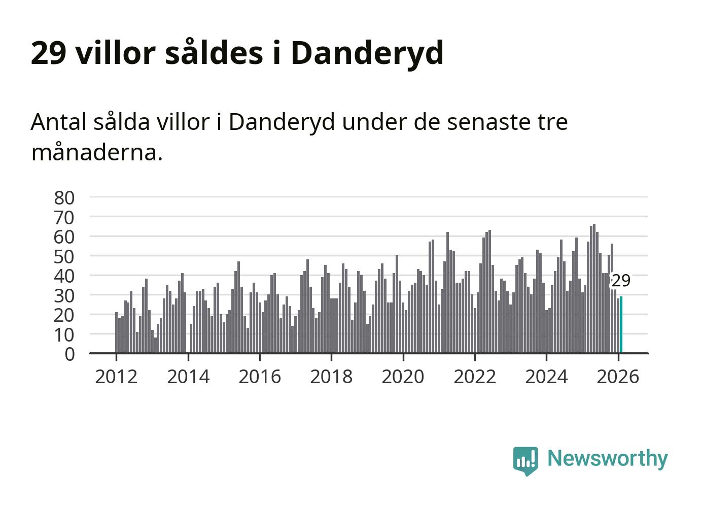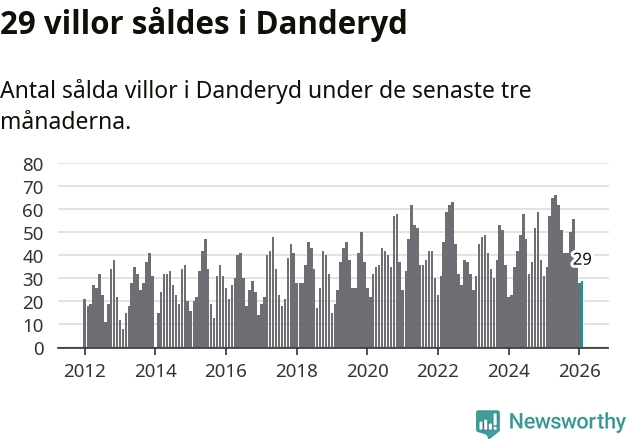 Sammanlagt såldes 29 villor i Danderyds kommun mellan december och februari till ett genomsnittligt pris på 14,1 miljoner kronor. I fjol gjordes 35 affärer vid den här tiden på året.