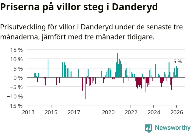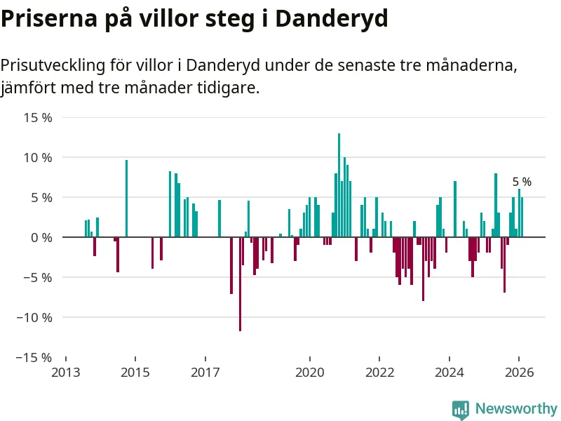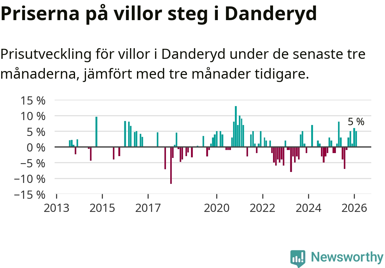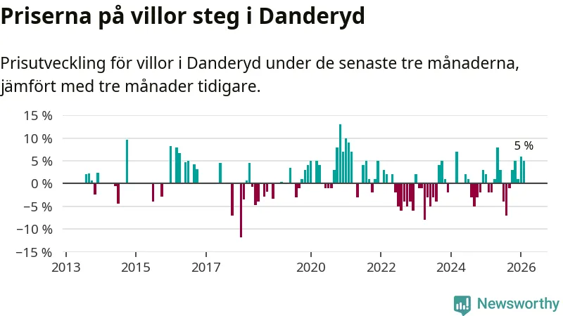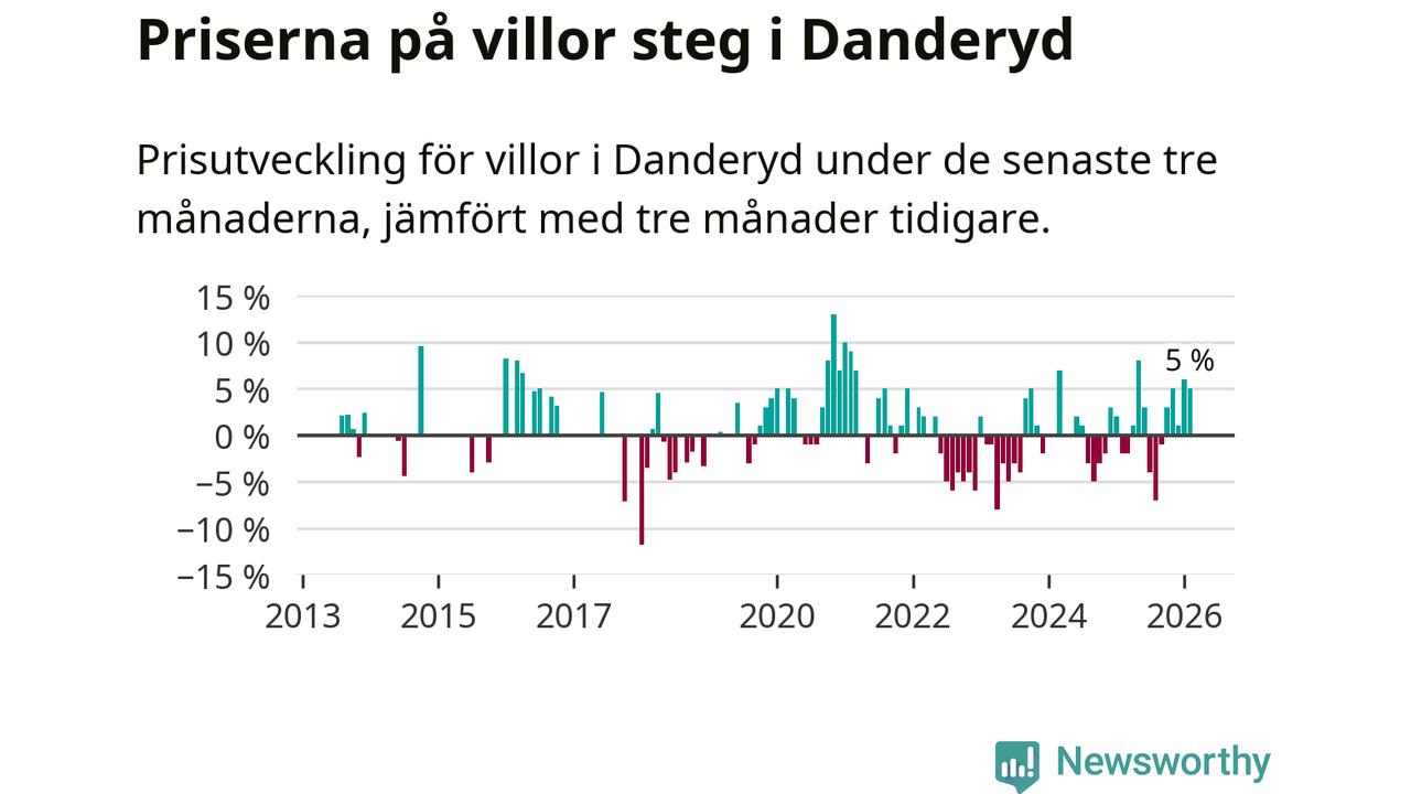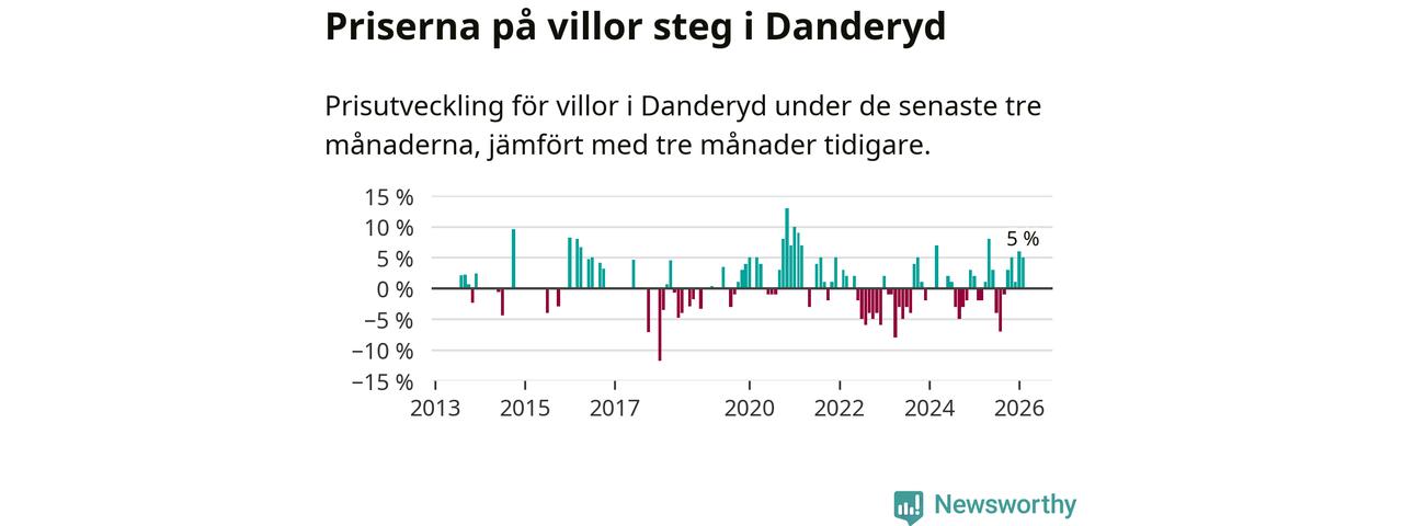 Villapriserna har gått upp i Danderyds kommun. Medelpriset på försäljningarna under de senaste tre månaderna visar på en uppgång med 5 procent.