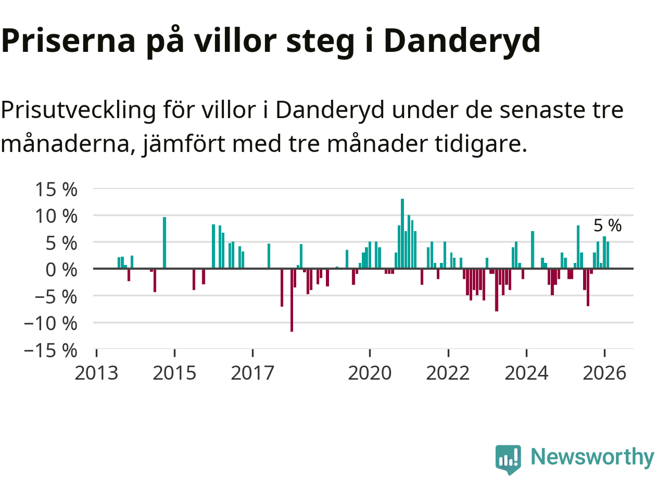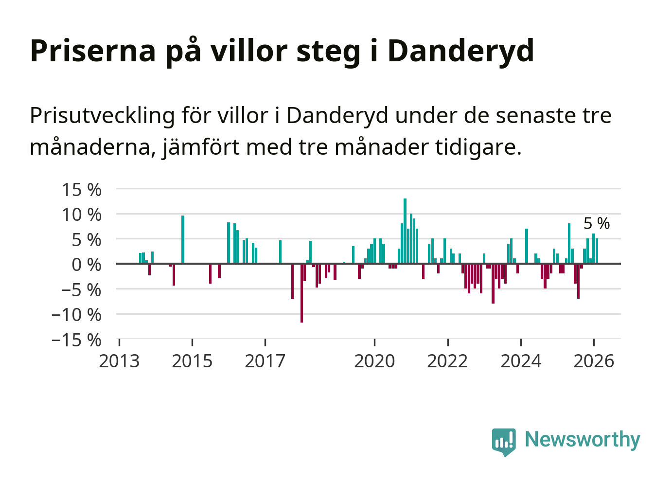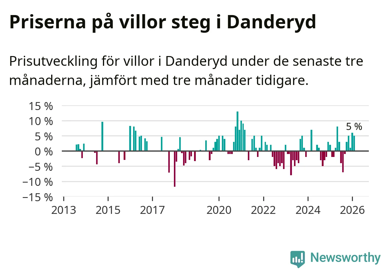 Villapriserna har gått upp i Danderyds kommun. Medelpriset på försäljningarna under de senaste tre månaderna visar på en uppgång med 5 procent.