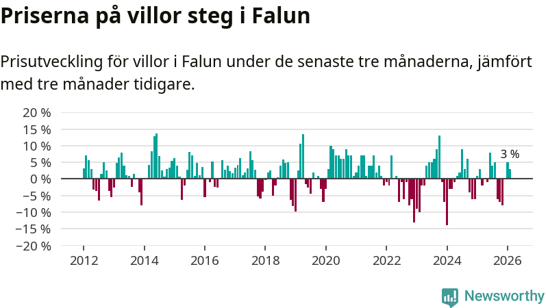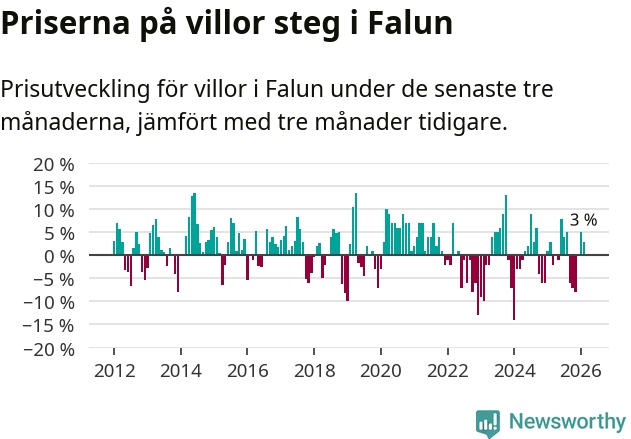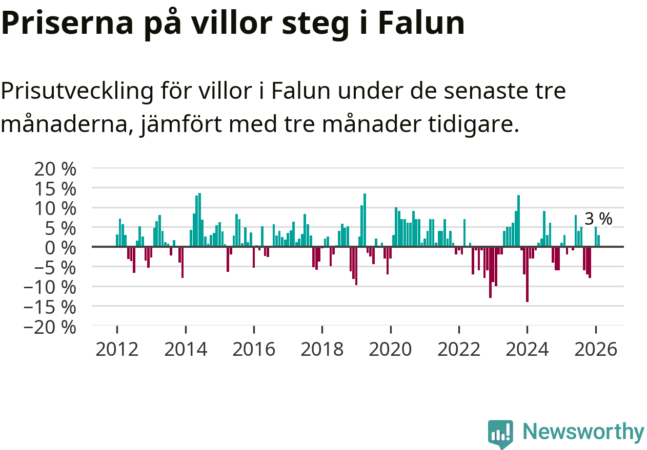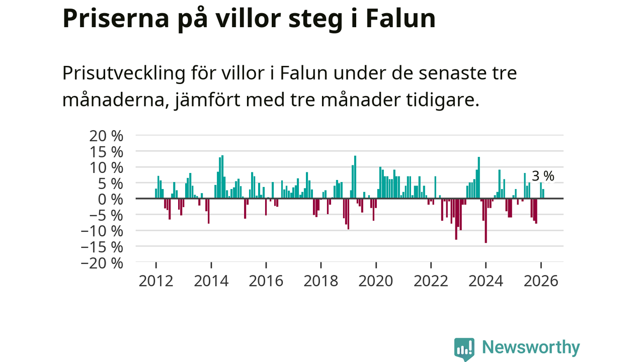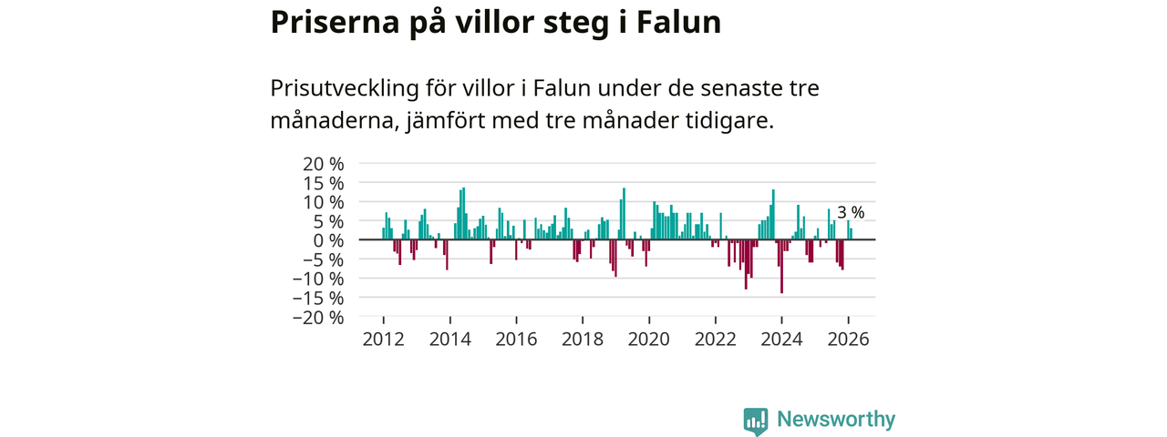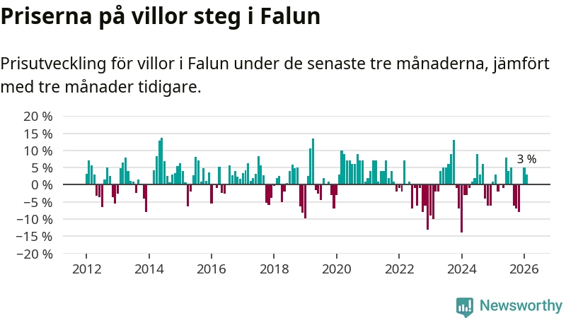 Statistiken visar även på en prisuppgång i Falu kommun. Medelpriset på försäljningarna av villor i kommunen var 3 procent högre än för tre månader sedan. I hela Dalarna däremot sjunker villapriserna. I hela länet noterades en prisnedgång på 2 procent.