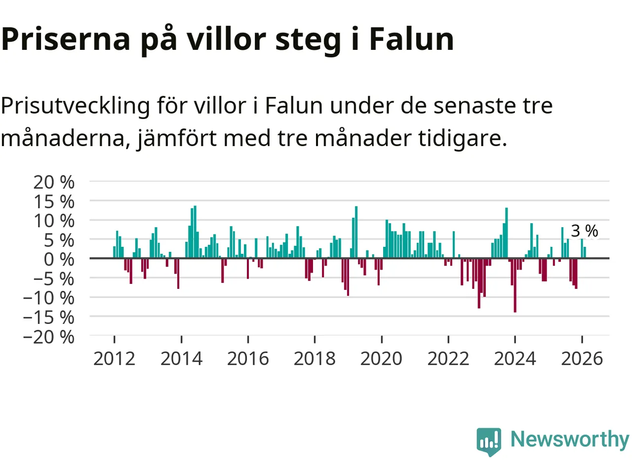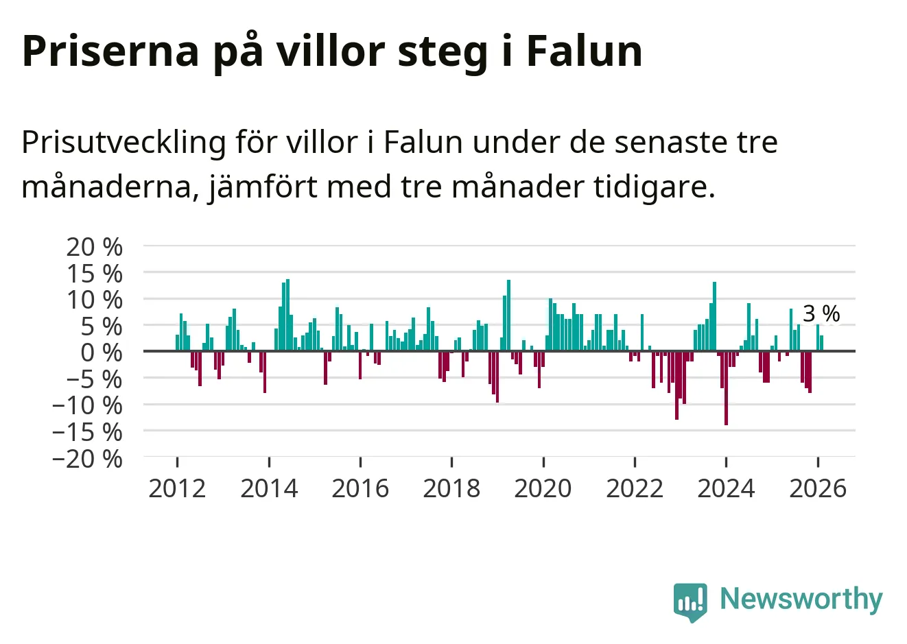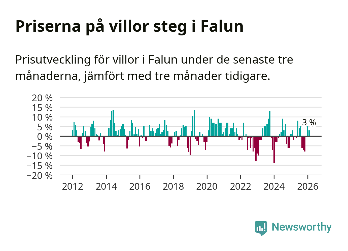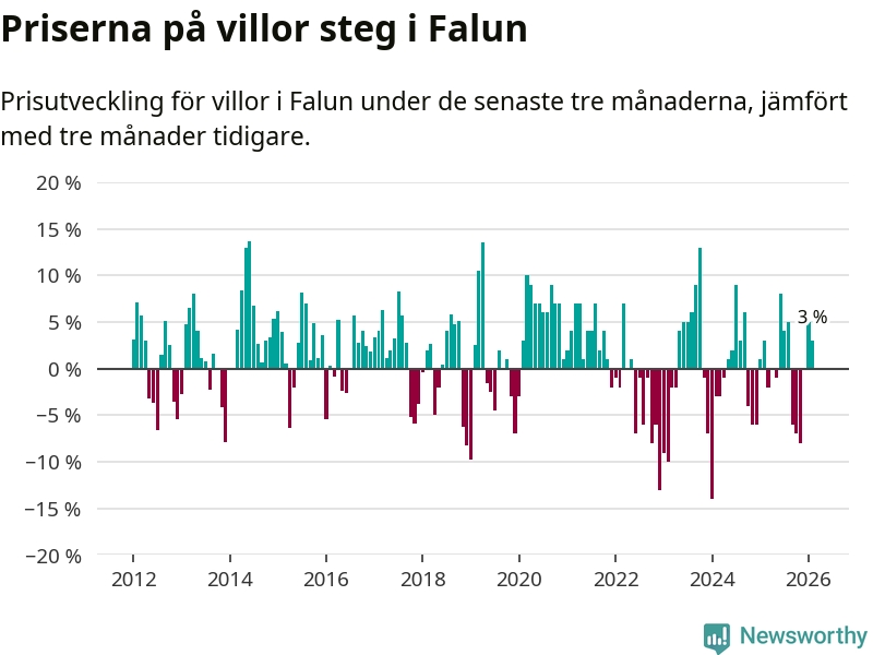 Statistiken visar även på en prisuppgång i Falu kommun. Medelpriset på försäljningarna av villor i kommunen var 3 procent högre än för tre månader sedan. I hela Dalarna däremot sjunker villapriserna. I hela länet noterades en prisnedgång på 2 procent.