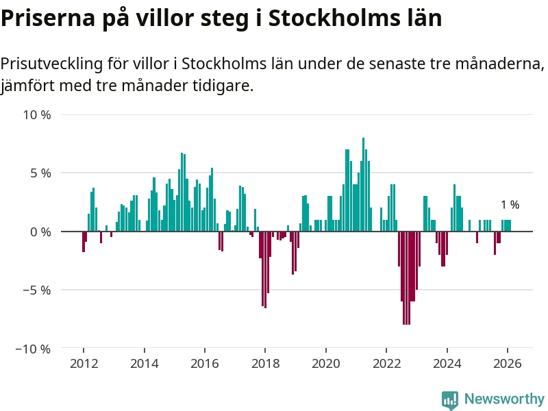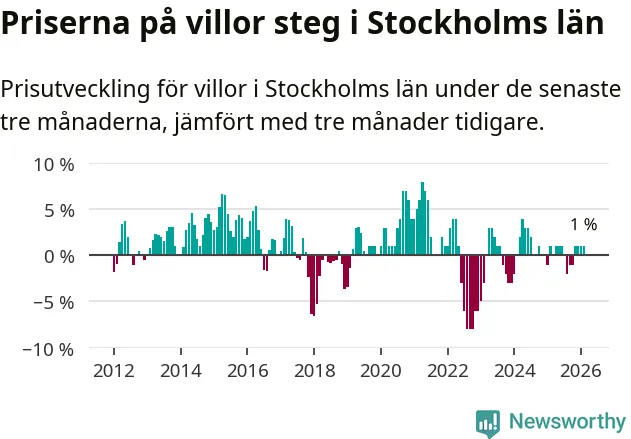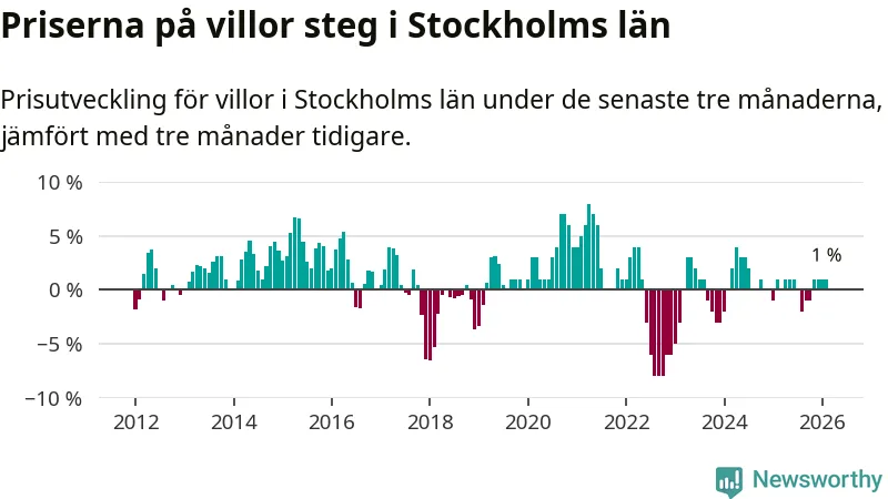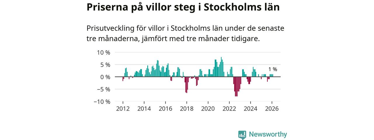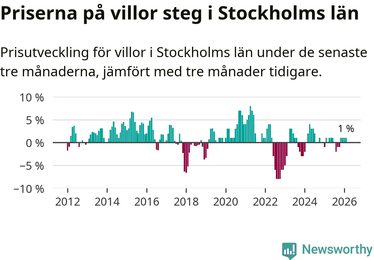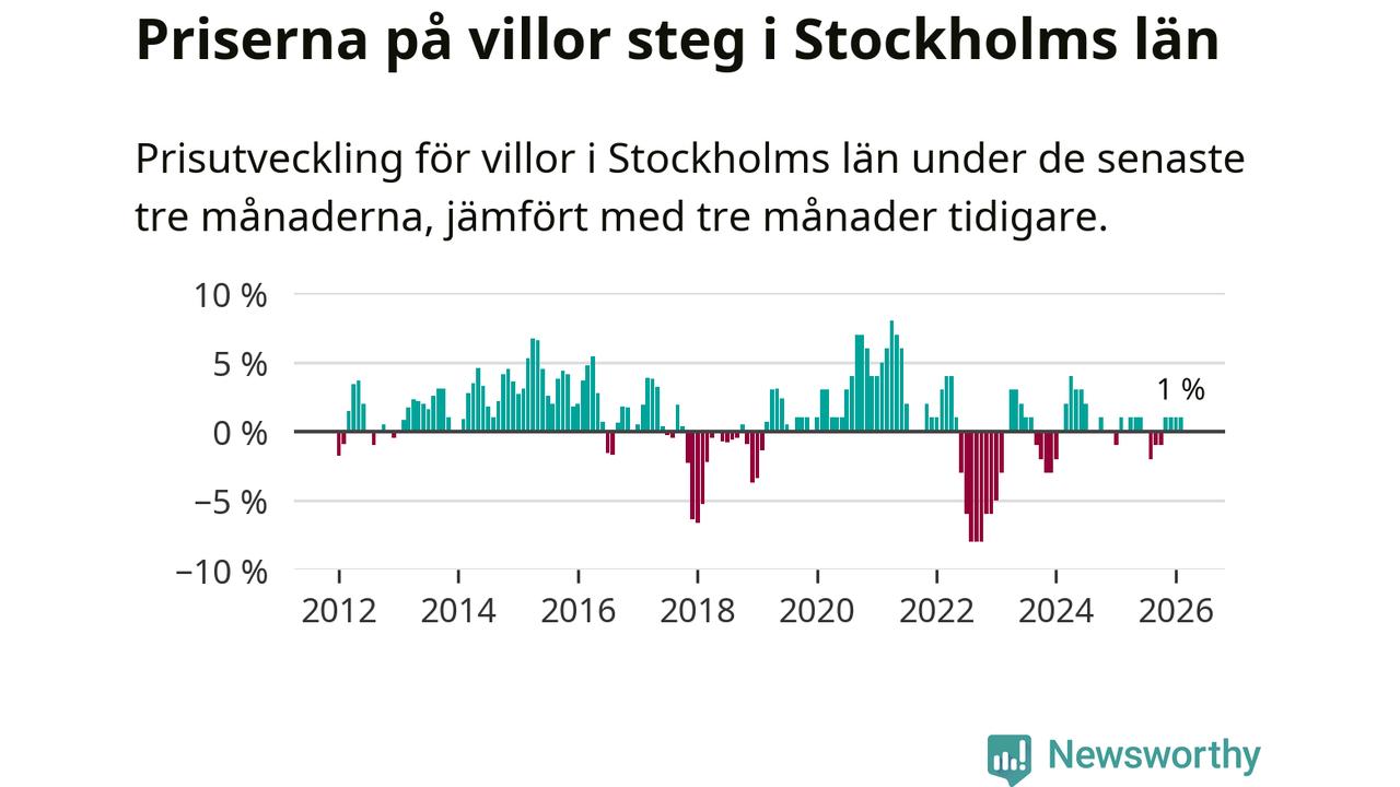 Villapriserna har gått upp i Stockholms län. Medelpriset på försäljningarna under de senaste tre månaderna visar på en uppgång med 1 procent.