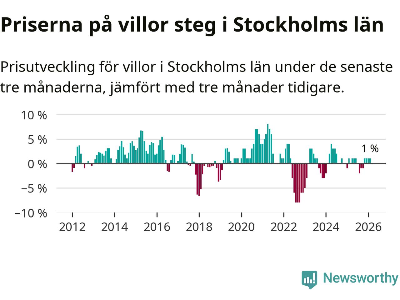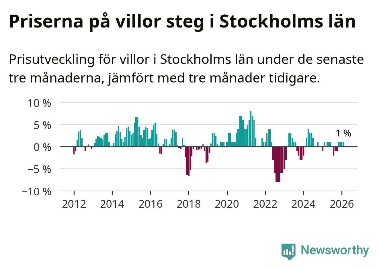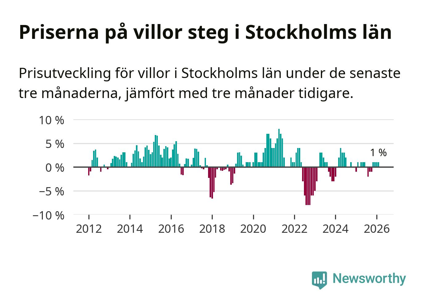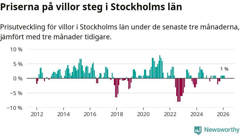 Villapriserna har gått upp i Stockholms län. Medelpriset på försäljningarna under de senaste tre månaderna visar på en uppgång med 1 procent.