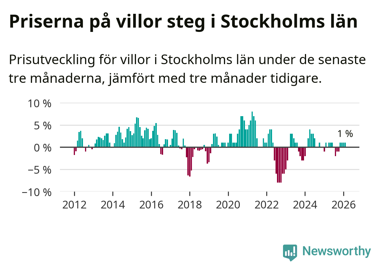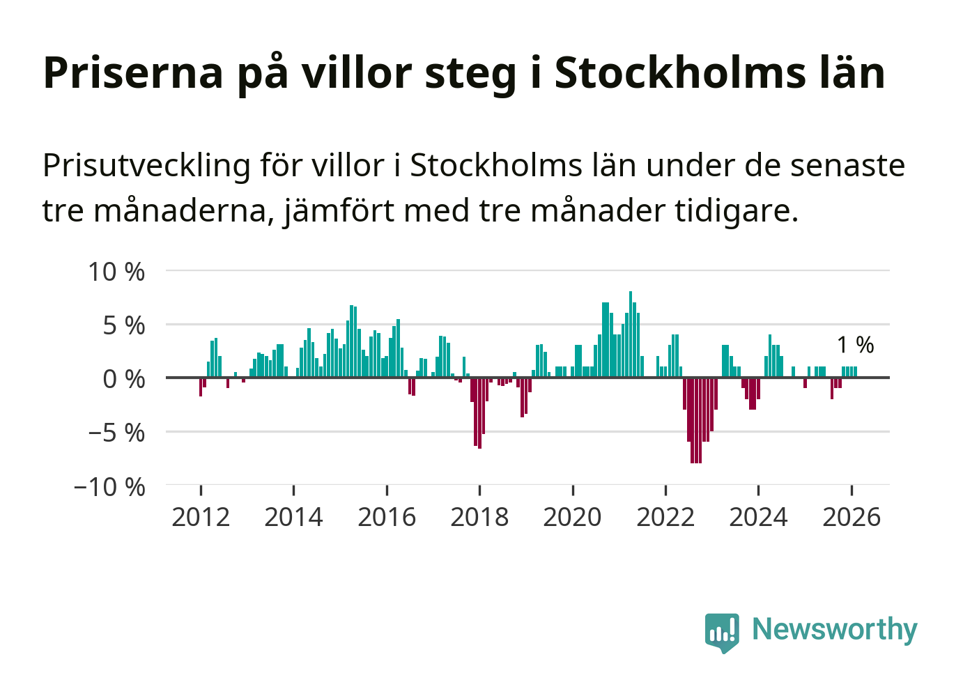 I hela Sverige däremot sjunker villapriserna. I hela riket noterades en prisnedgång på 1 procent.