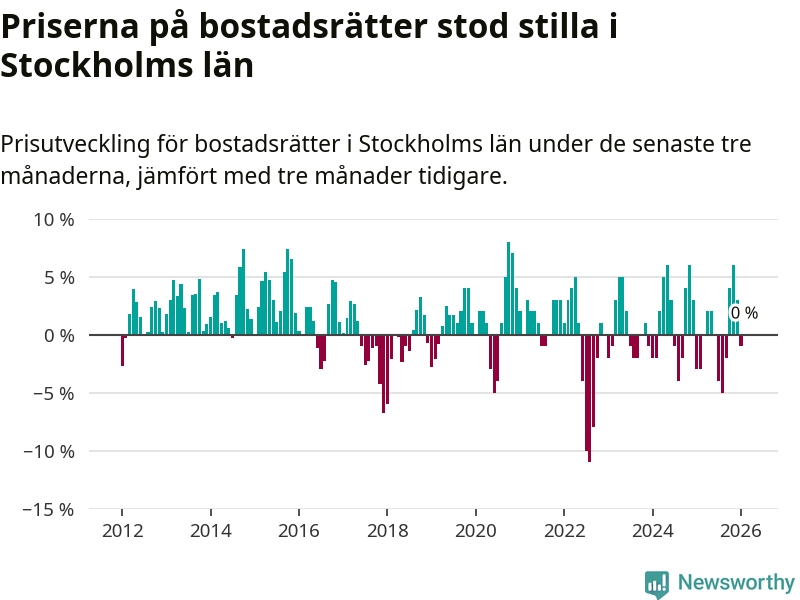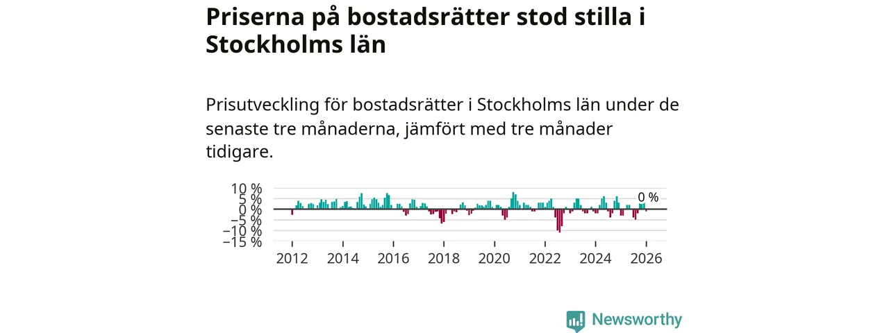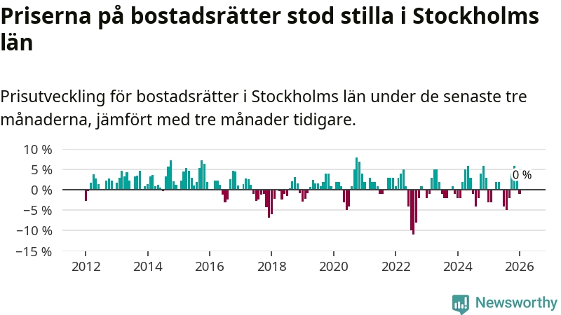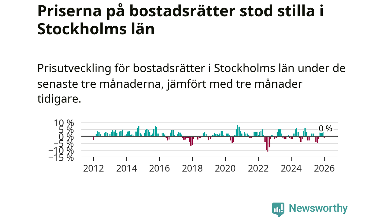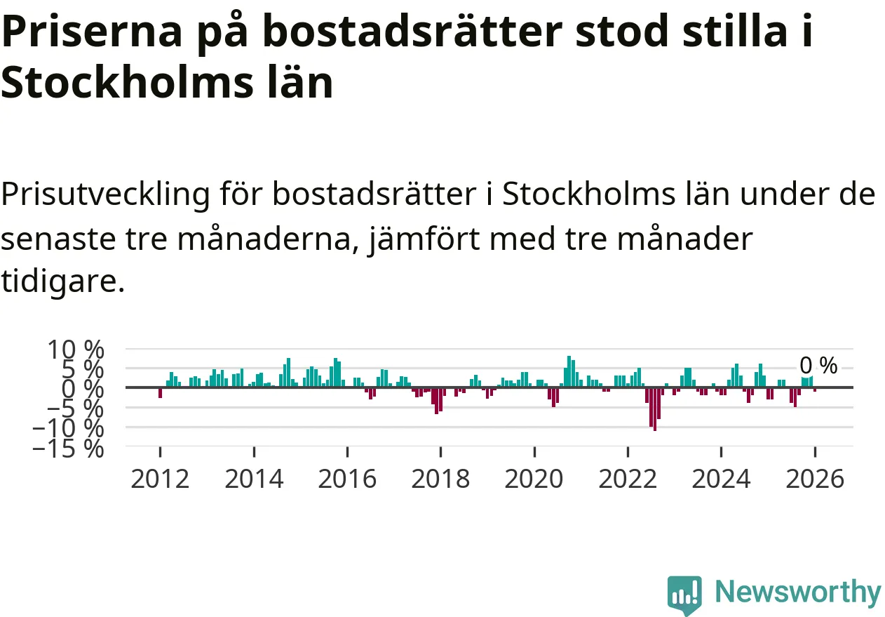 Priserna på bostadsrätter står i stort sett stilla i Stockholms län. Medelpriset på de på försäljningarna under de senaste tre månaderna låg på samma nivå som för tre månader sedan.