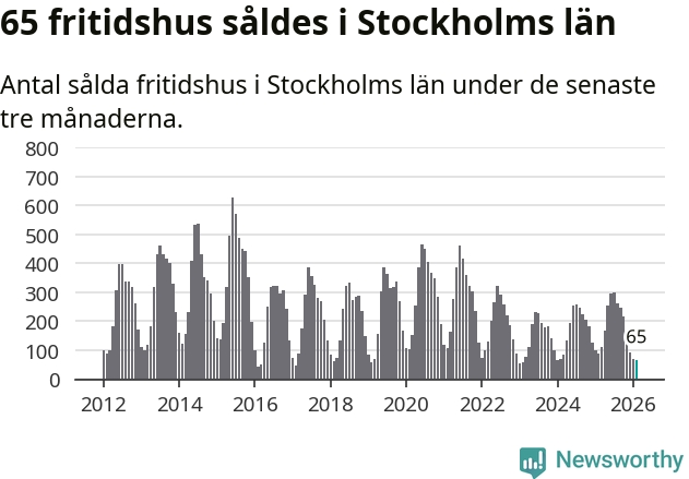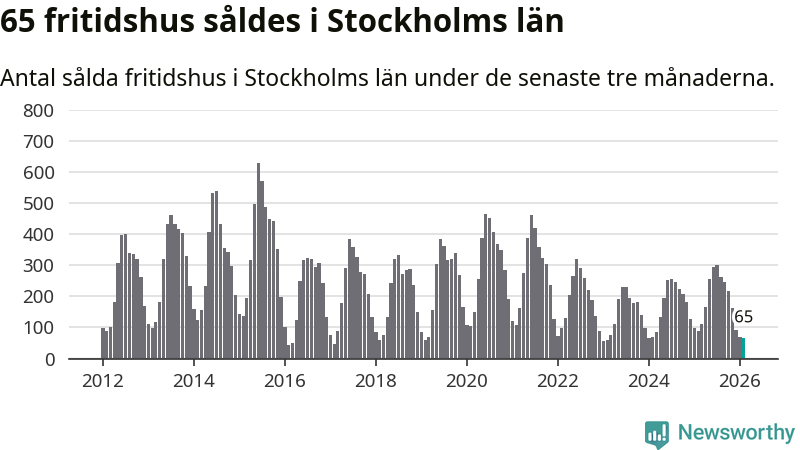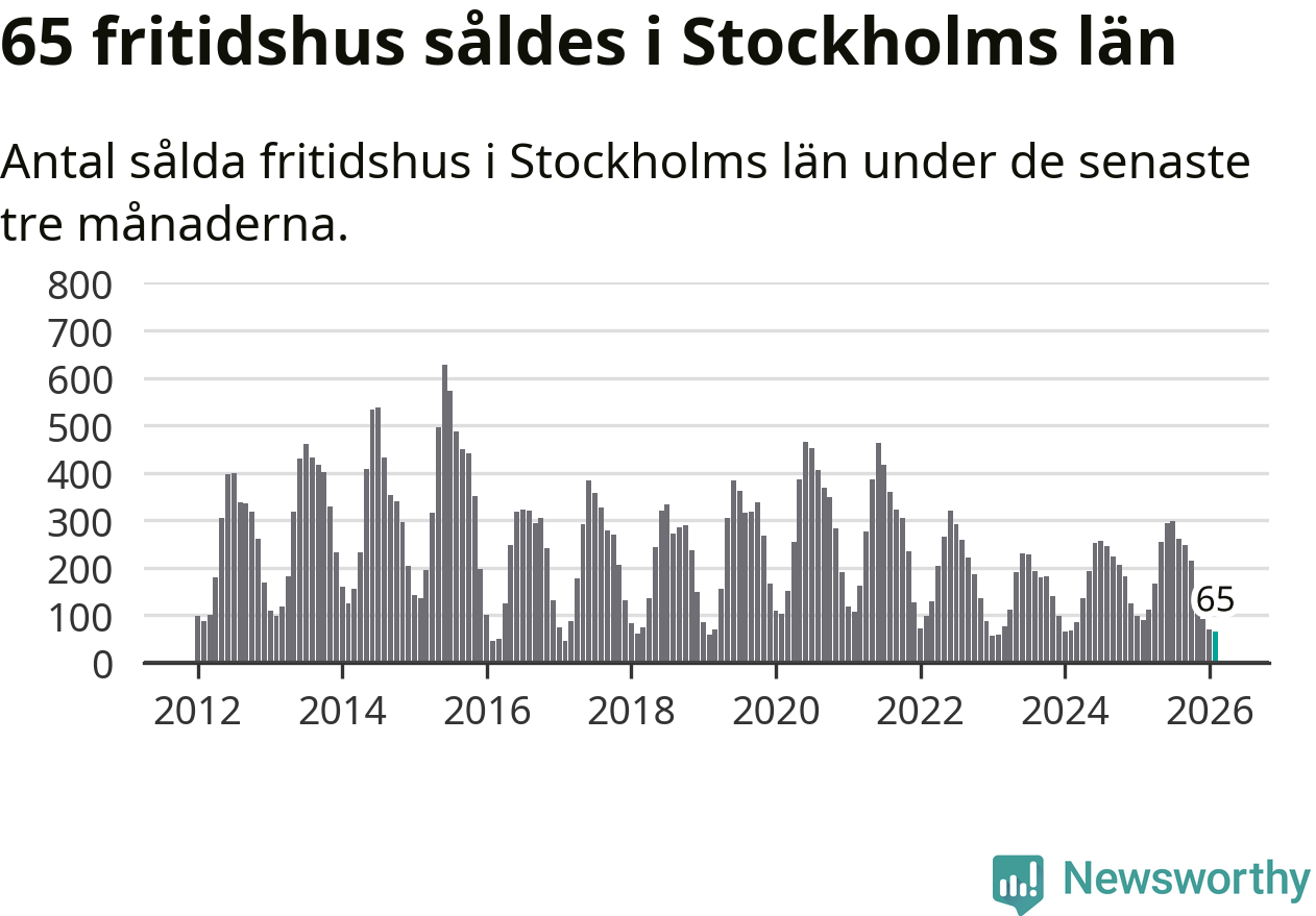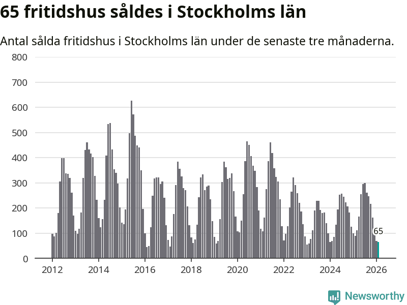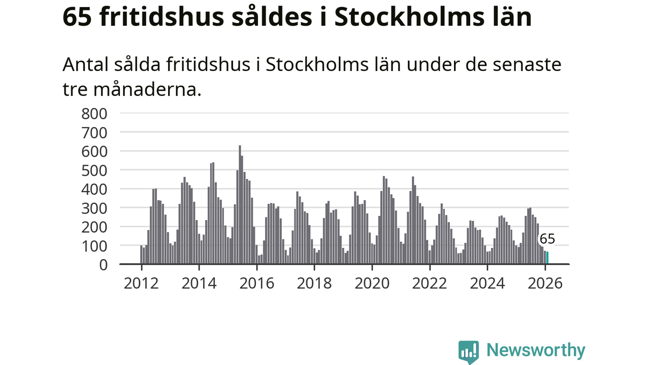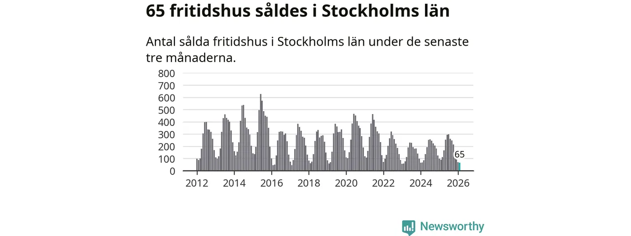 Sammanlagt såldes 65 fritidshus i Stockholms län mellan december 2025 och februari till ett genomsnittligt pris på 2,9 miljoner kronor. I fjol gjordes 89 affärer vid den här tiden på året.