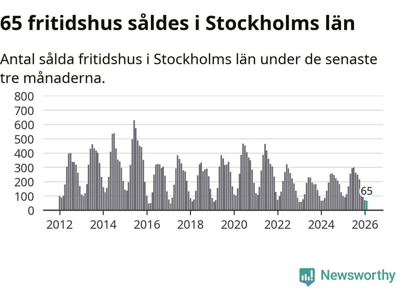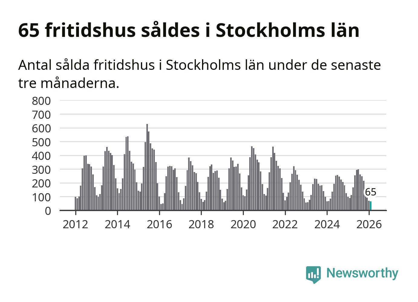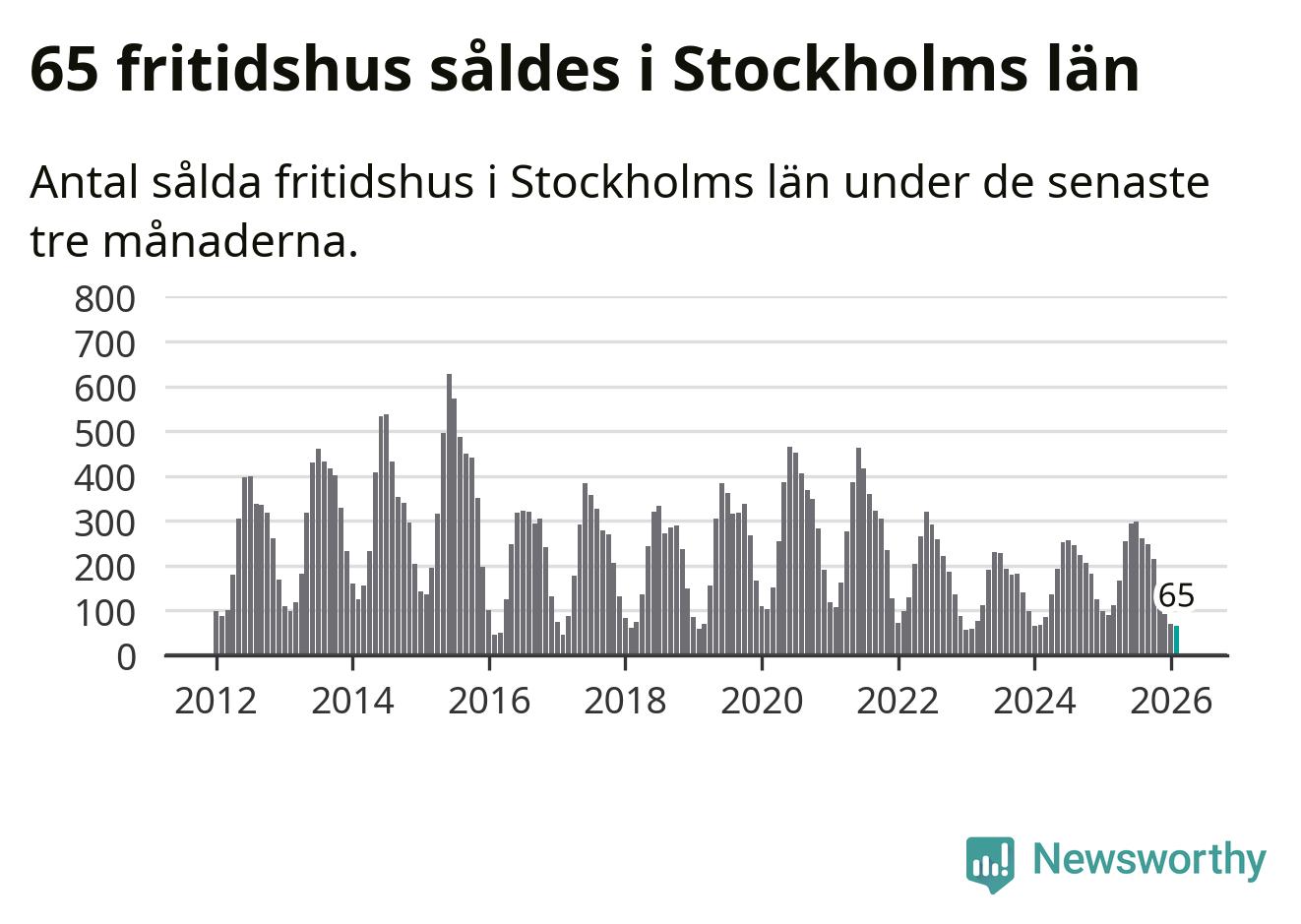 Sammanlagt såldes 65 fritidshus i Stockholms län mellan december 2025 och februari till ett genomsnittligt pris på 2,9 miljoner kronor. I fjol gjordes 89 affärer vid den här tiden på året.