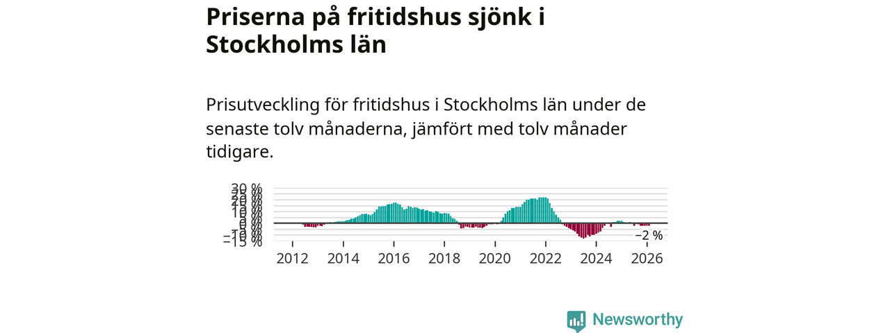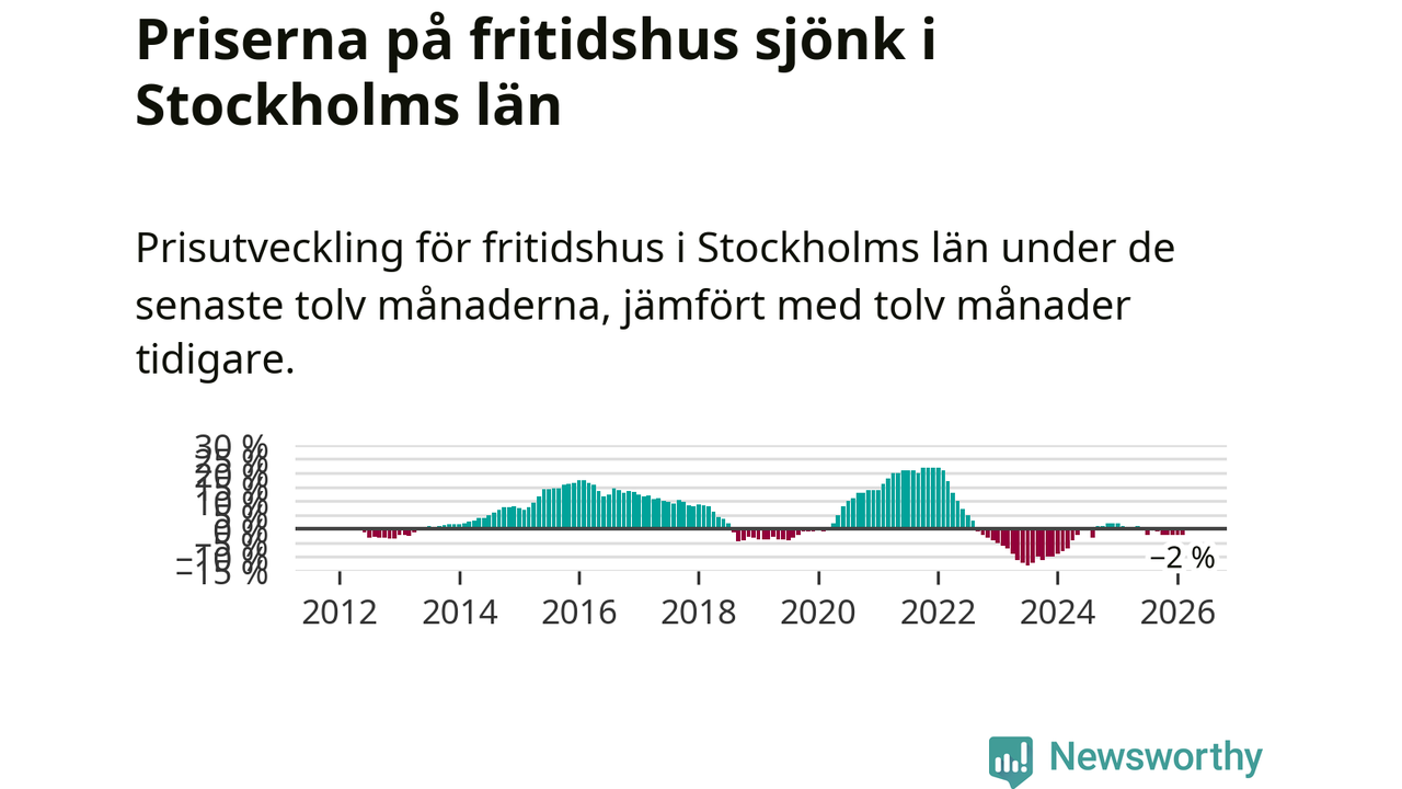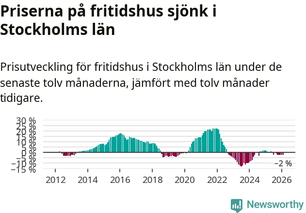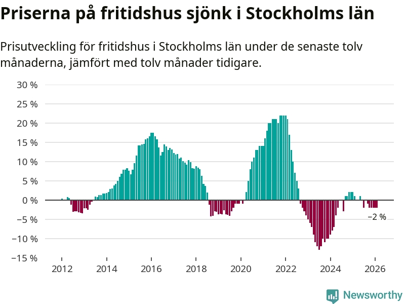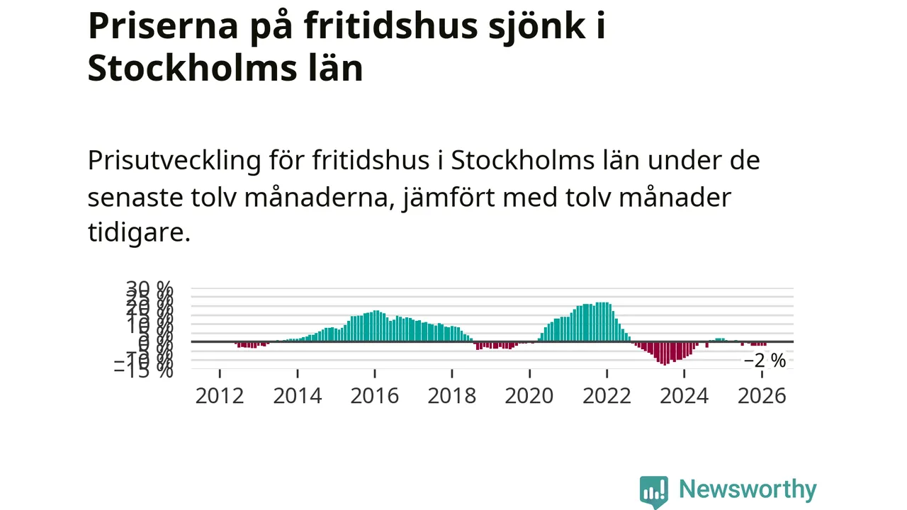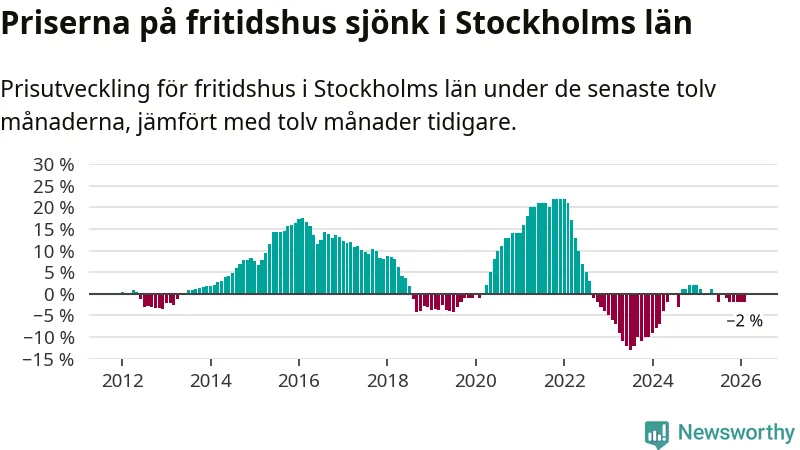 Priserna på fritidshus har gått ner i Stockholms län. Medelpriset på försäljningarna under de senaste tolv månaderna visar på en nedgång med 2 procent.