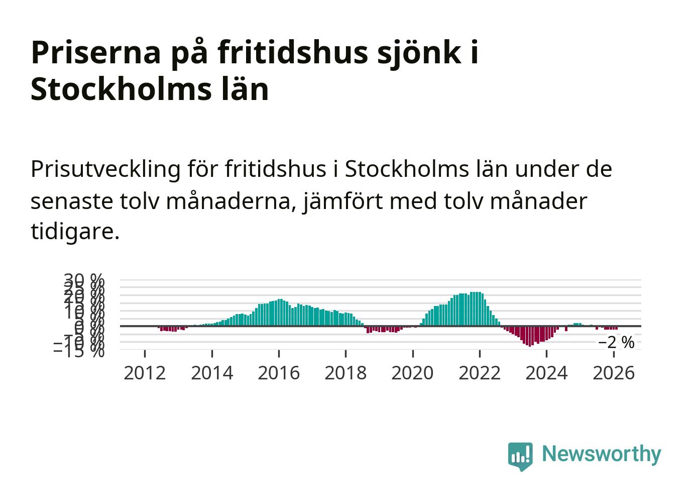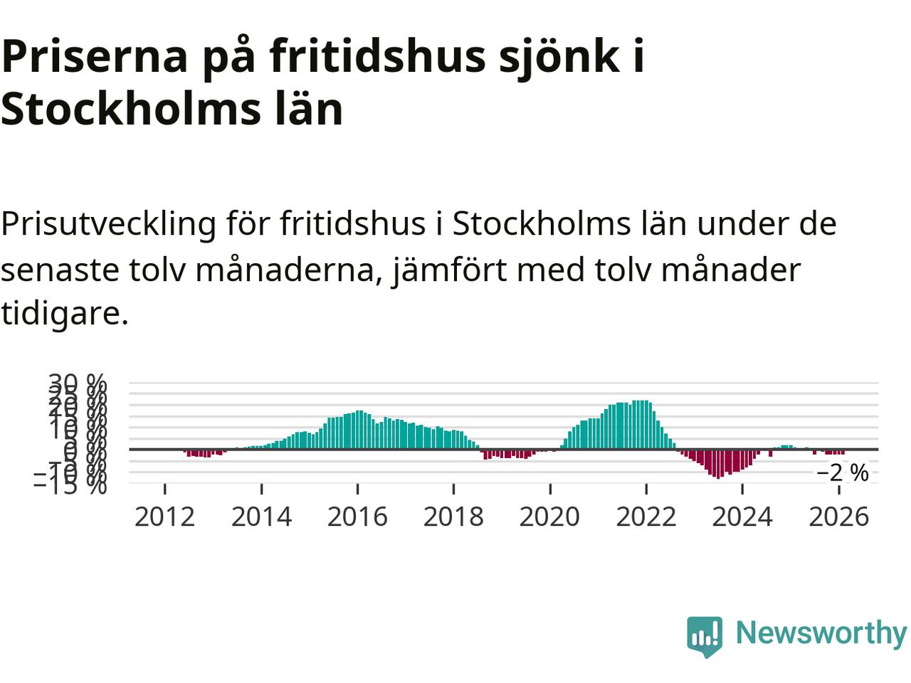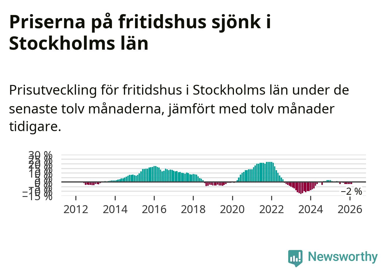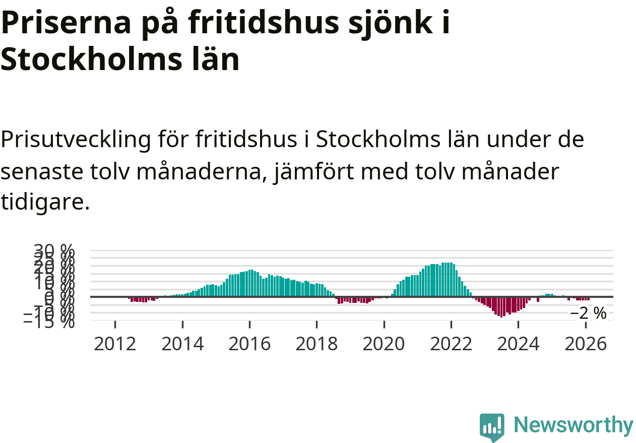Priserna på fritidshus har gått ner i Stockholms län. Medelpriset på försäljningarna under de senaste tolv månaderna visar på en nedgång med 2 procent.
