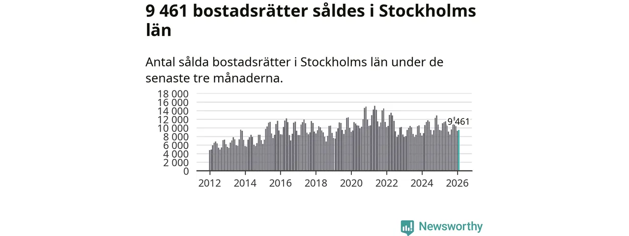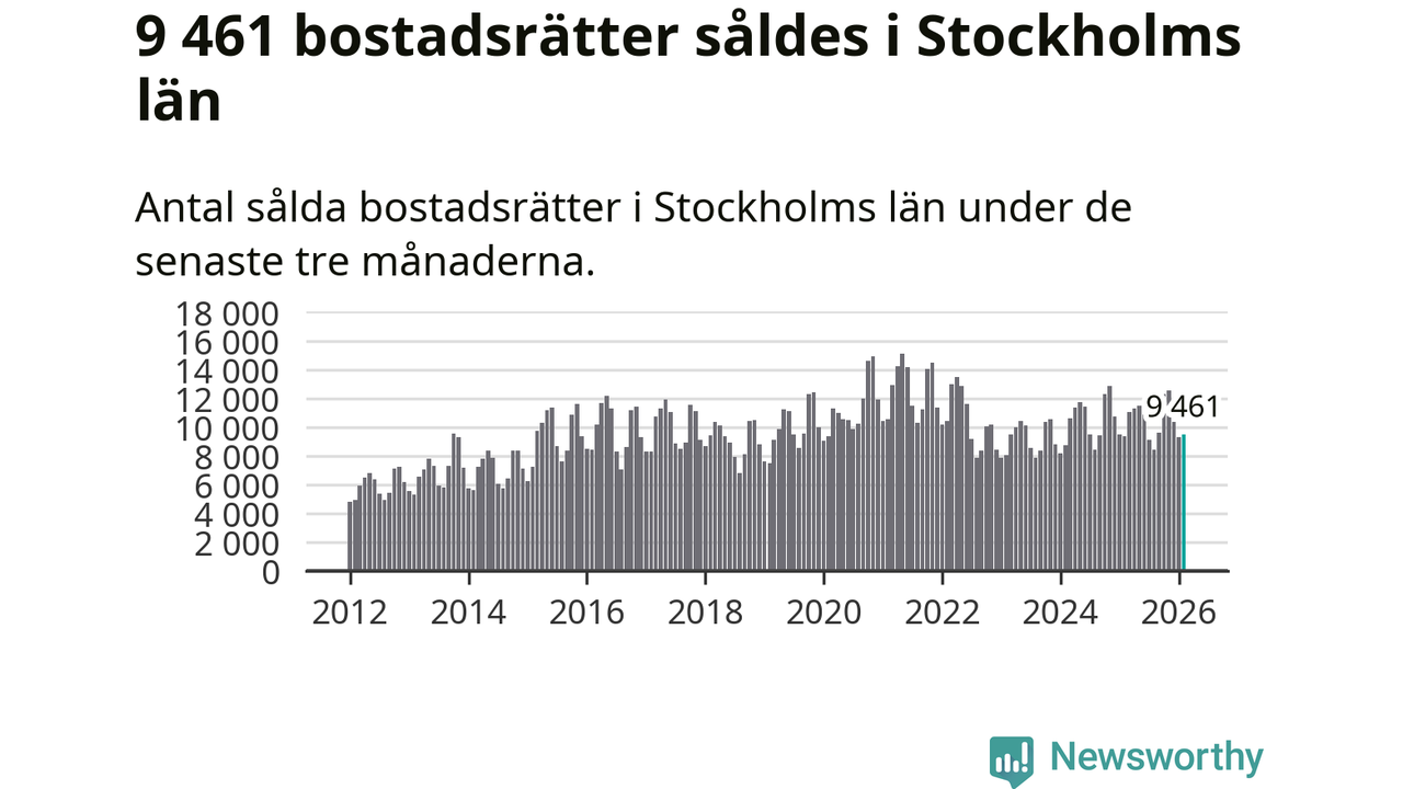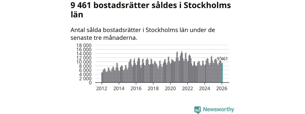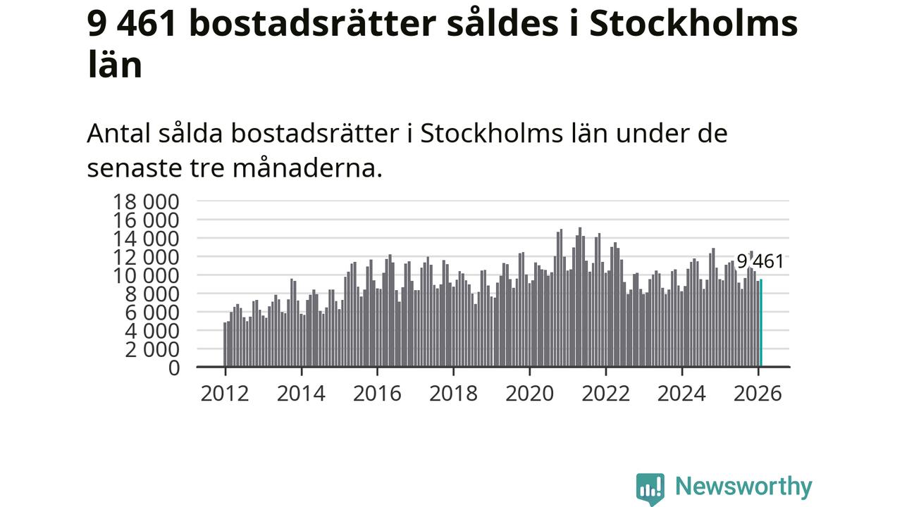 Sammanlagt såldes 9 461 bostadsrätter i Stockholms län mellan december och februari till ett genomsnittligt pris på 4,3 miljoner kronor. I fjol gjordes 9 373 affärer vid den här tiden på året.