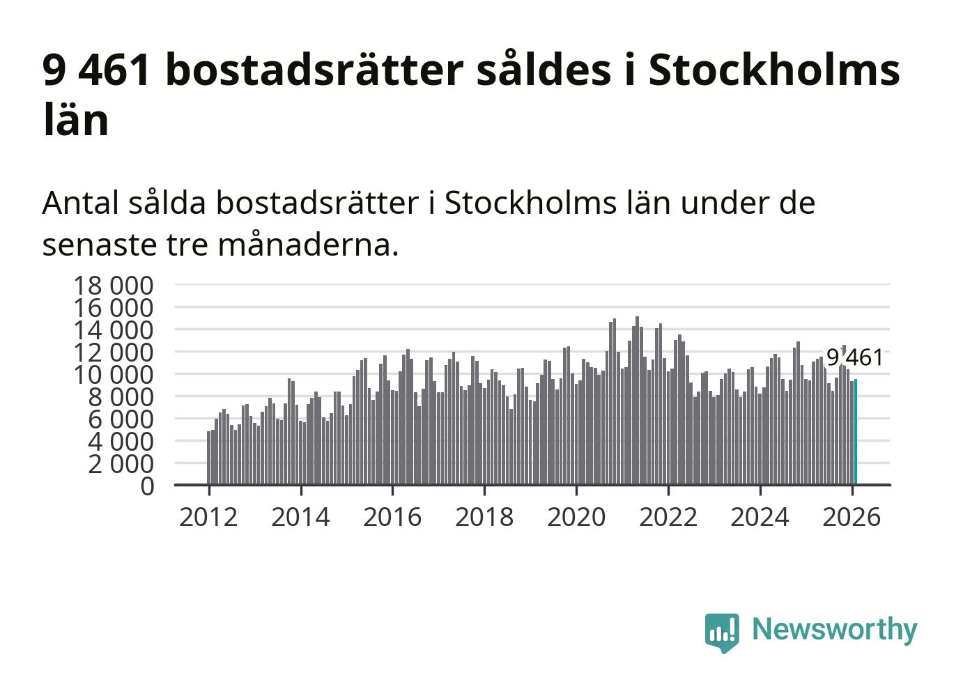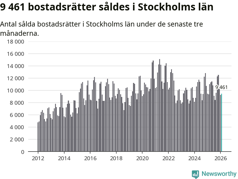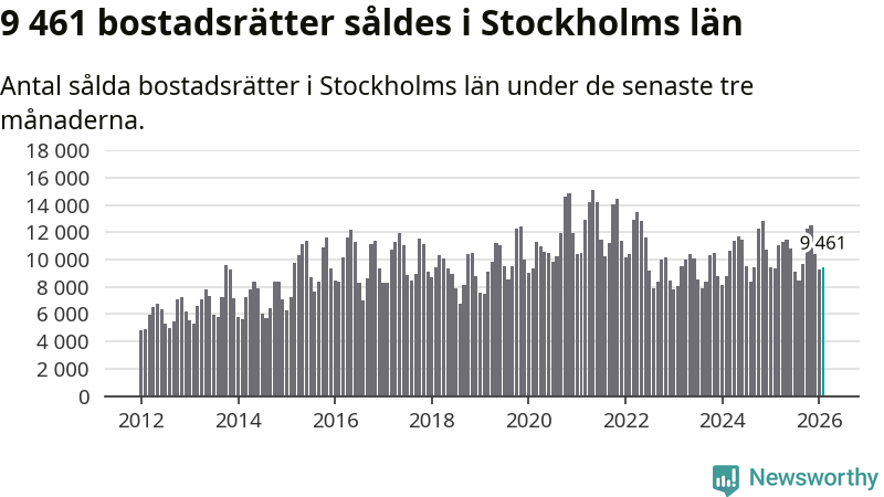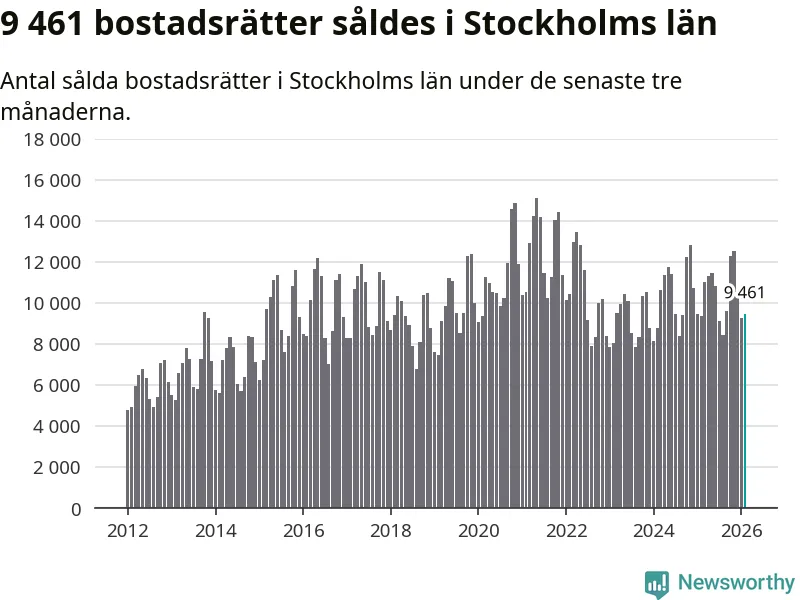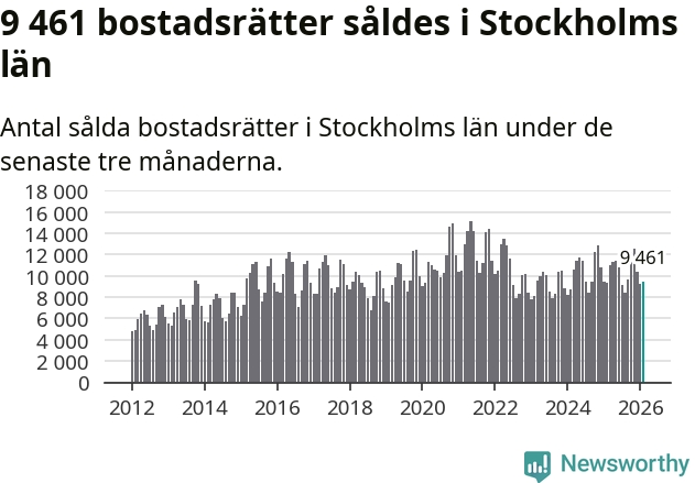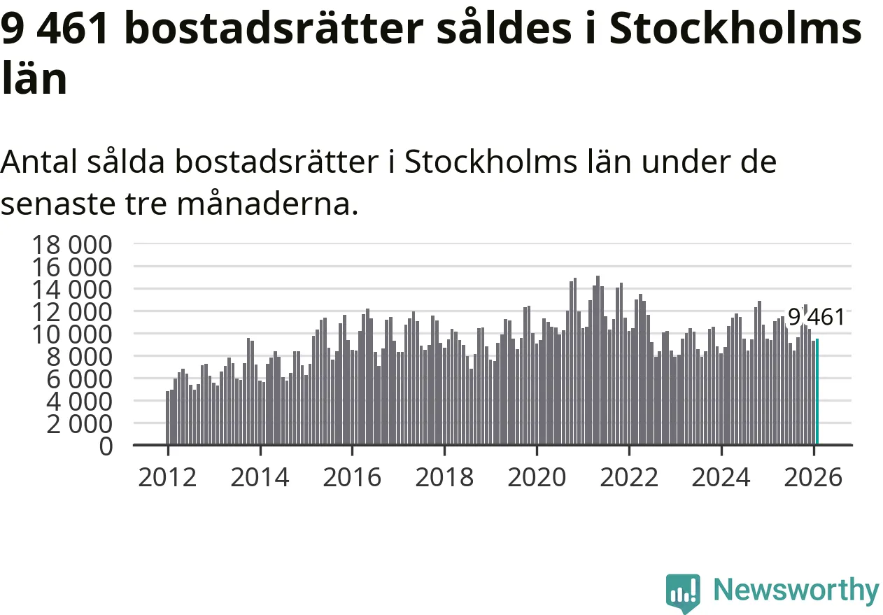 Sammanlagt såldes 9 461 bostadsrätter i Stockholms län mellan december och februari till ett genomsnittligt pris på 4,3 miljoner kronor. I fjol gjordes 9 373 affärer vid den här tiden på året.
