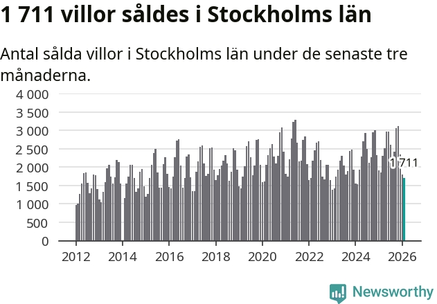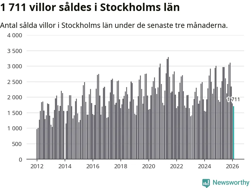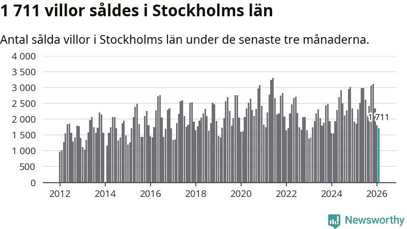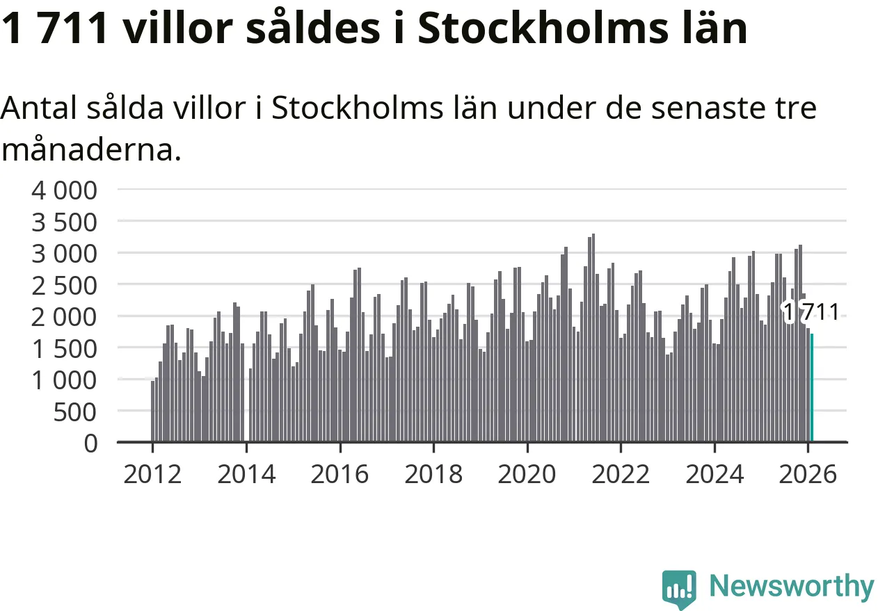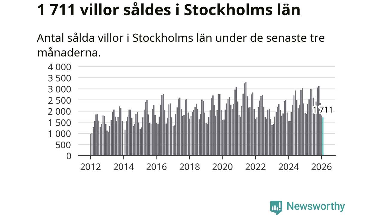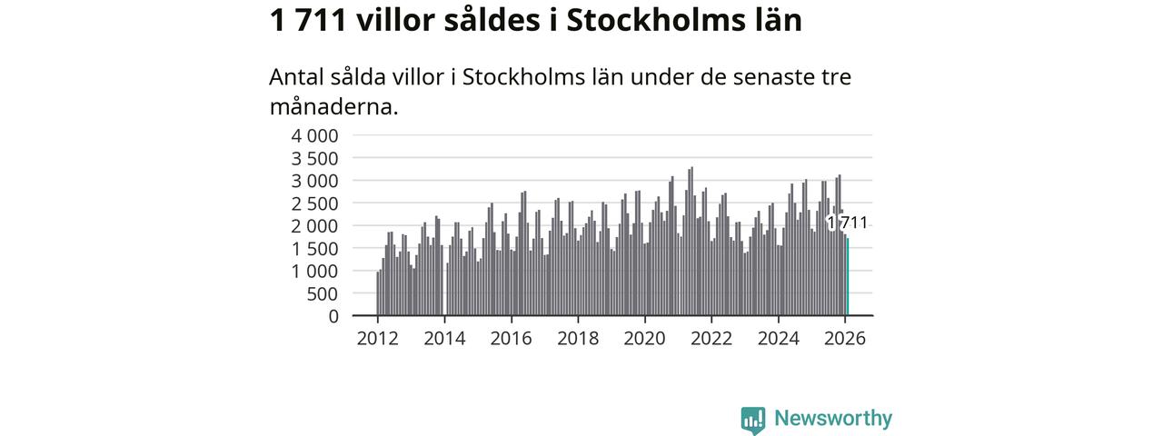 Sammanlagt såldes 1 711 villor i Stockholms län mellan december och februari till ett genomsnittligt pris på 7,2 miljoner kronor. I fjol gjordes 1 850 affärer vid den här tiden på året.