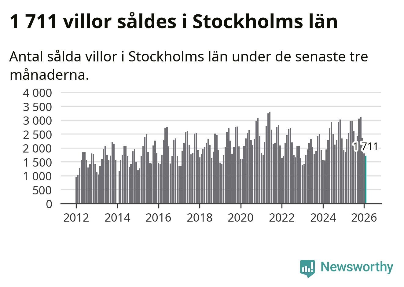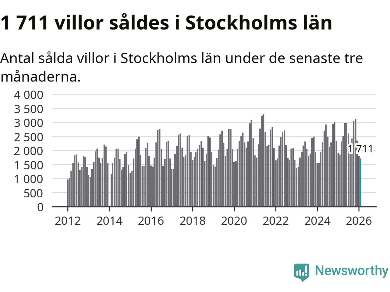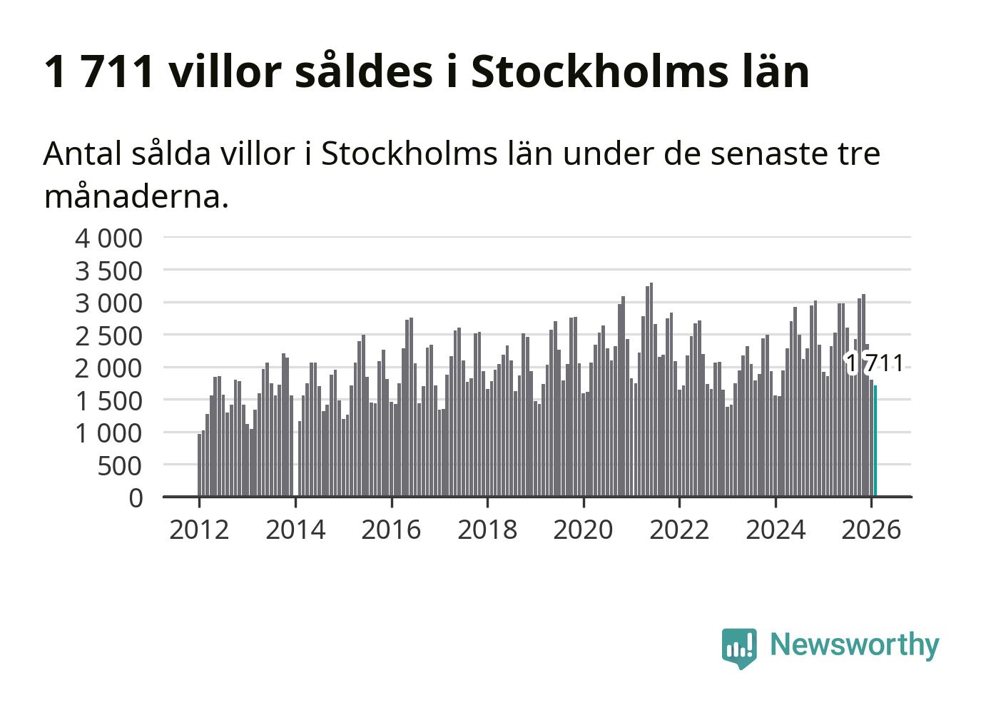 Sammanlagt såldes 1 711 villor i Stockholms län mellan december och februari till ett genomsnittligt pris på 7,2 miljoner kronor. I fjol gjordes 1 850 affärer vid den här tiden på året.