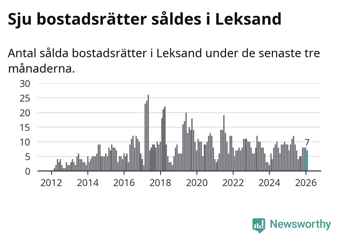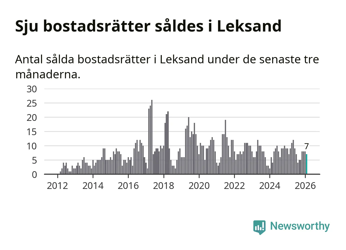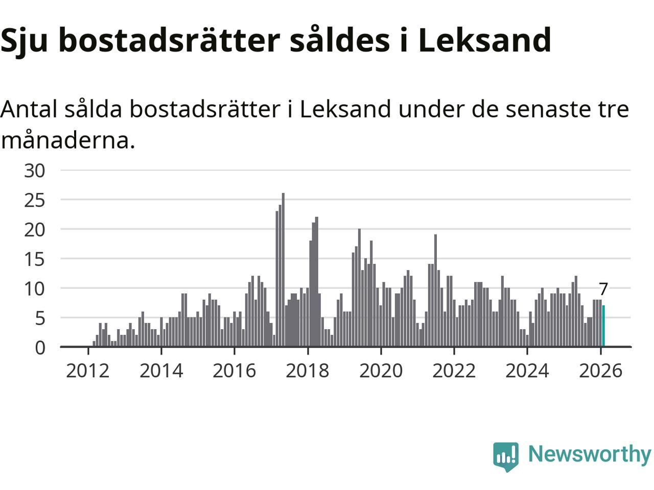 Mellan december och februari gjordes sammanlagt sju affärer med bostadsrätter i Leksands kommun. Det är lika många affärer som vid motsvarande tid i fjol.