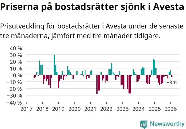 Statistiken visar även på en prisnedgång i Avesta kommun. Medelpriset på försäljningarna av bostadsrätter i kommunen var 3 procent lägre än för tre månader sedan. Även i hela Dalarna sjunker priserna på bostadsrätter. I hela länet noterades en prisnedgång på 4 procent.