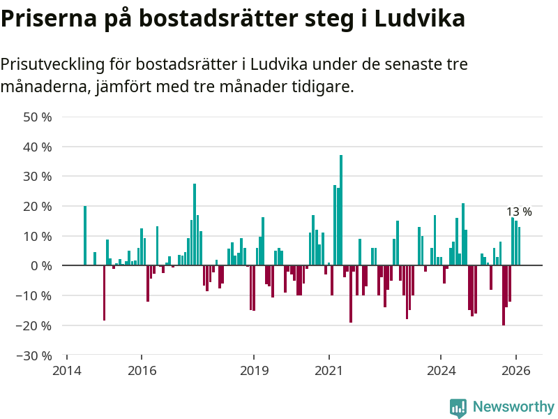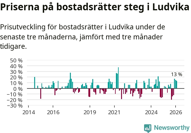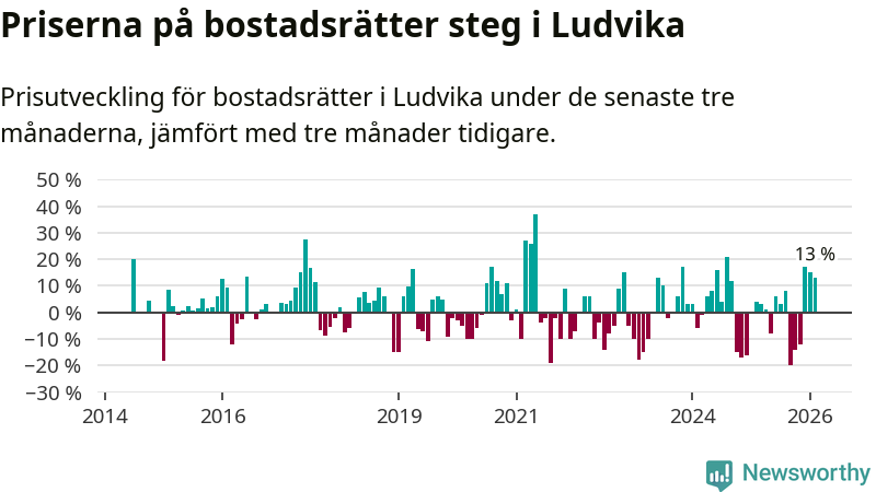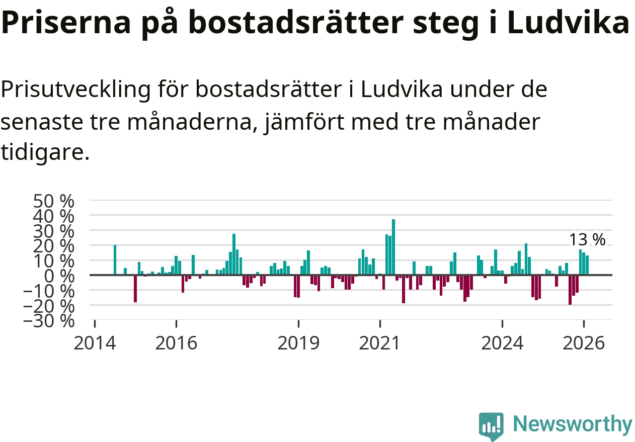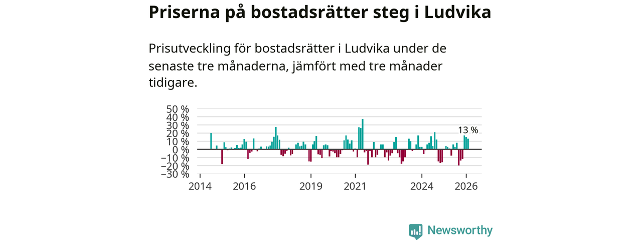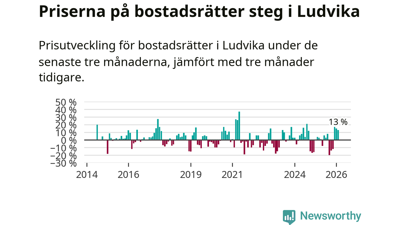 Priserna på bostadsrätter har gått upp i Ludvika kommun. Medelpriset på försäljningarna under de senaste tre månaderna visar på en uppgång med 13 procent.