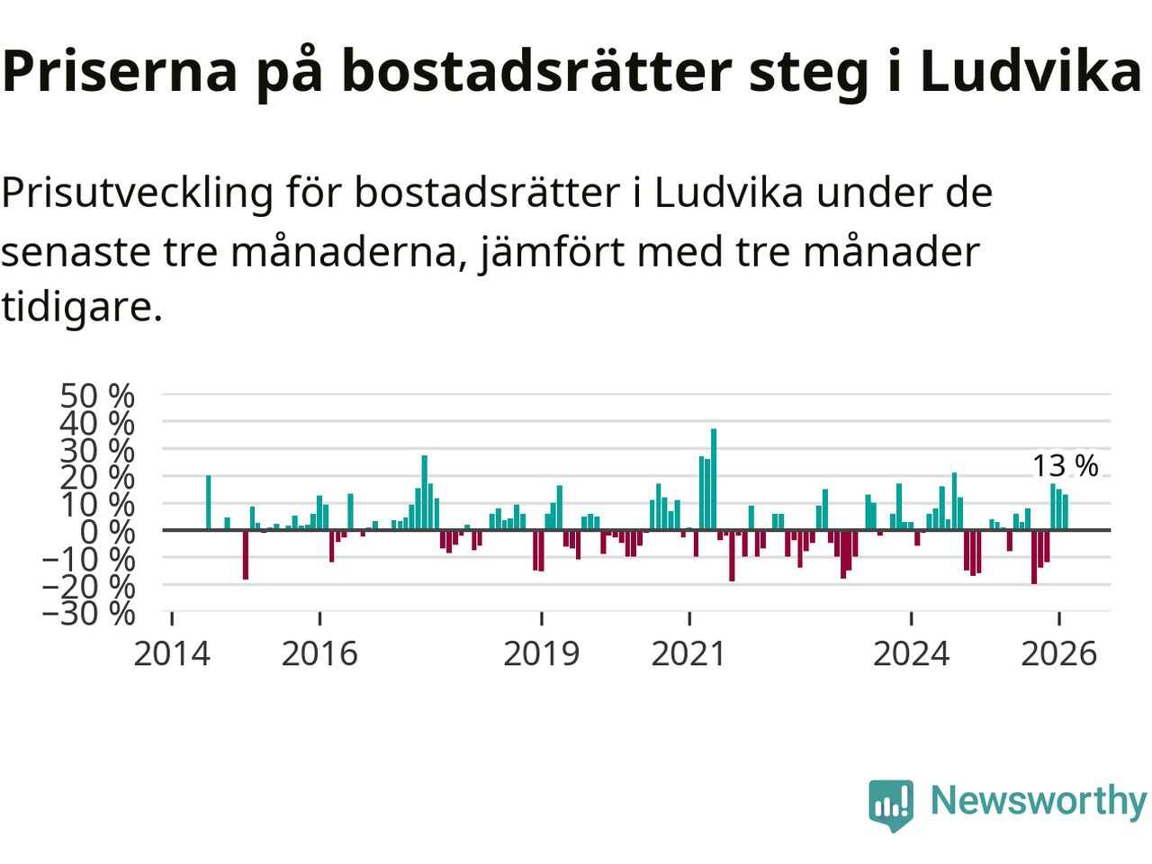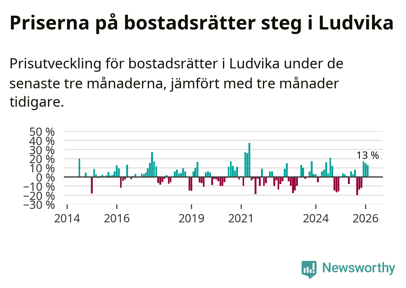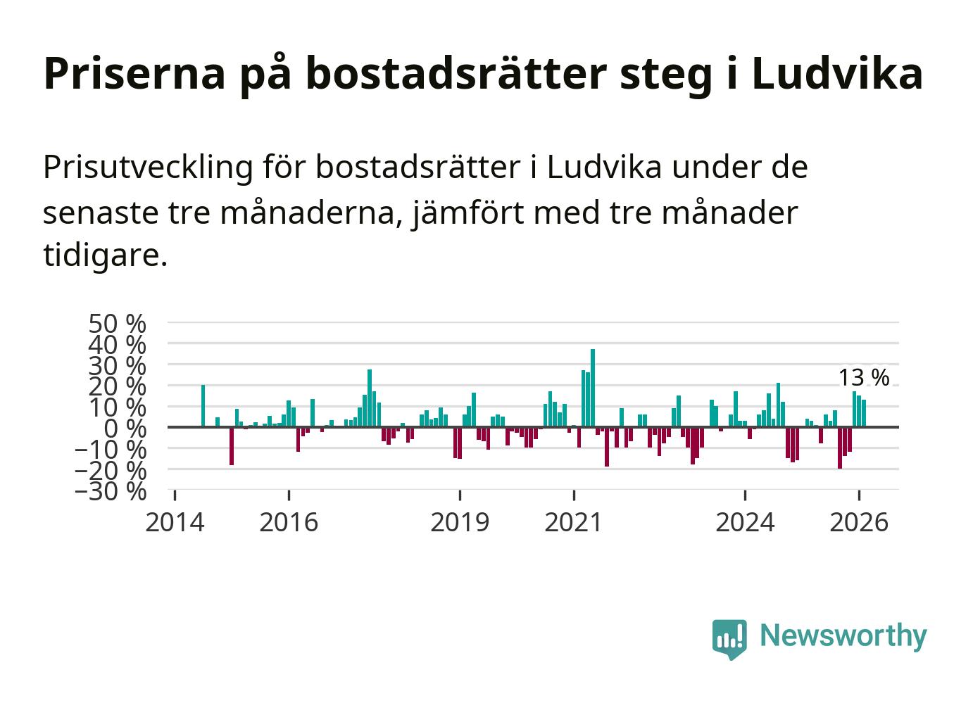 Priserna på bostadsrätter har gått upp i Ludvika kommun. Medelpriset på försäljningarna under de senaste tre månaderna visar på en uppgång med 13 procent.
