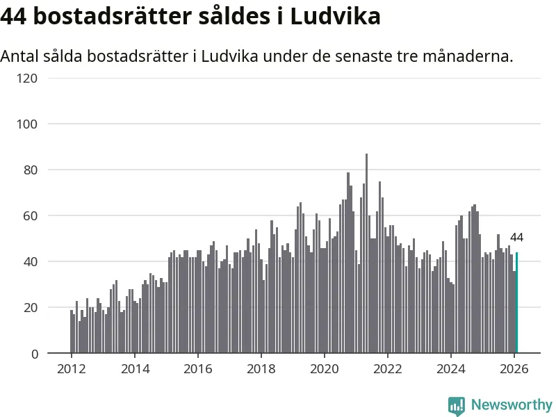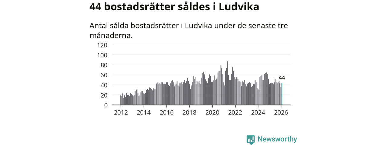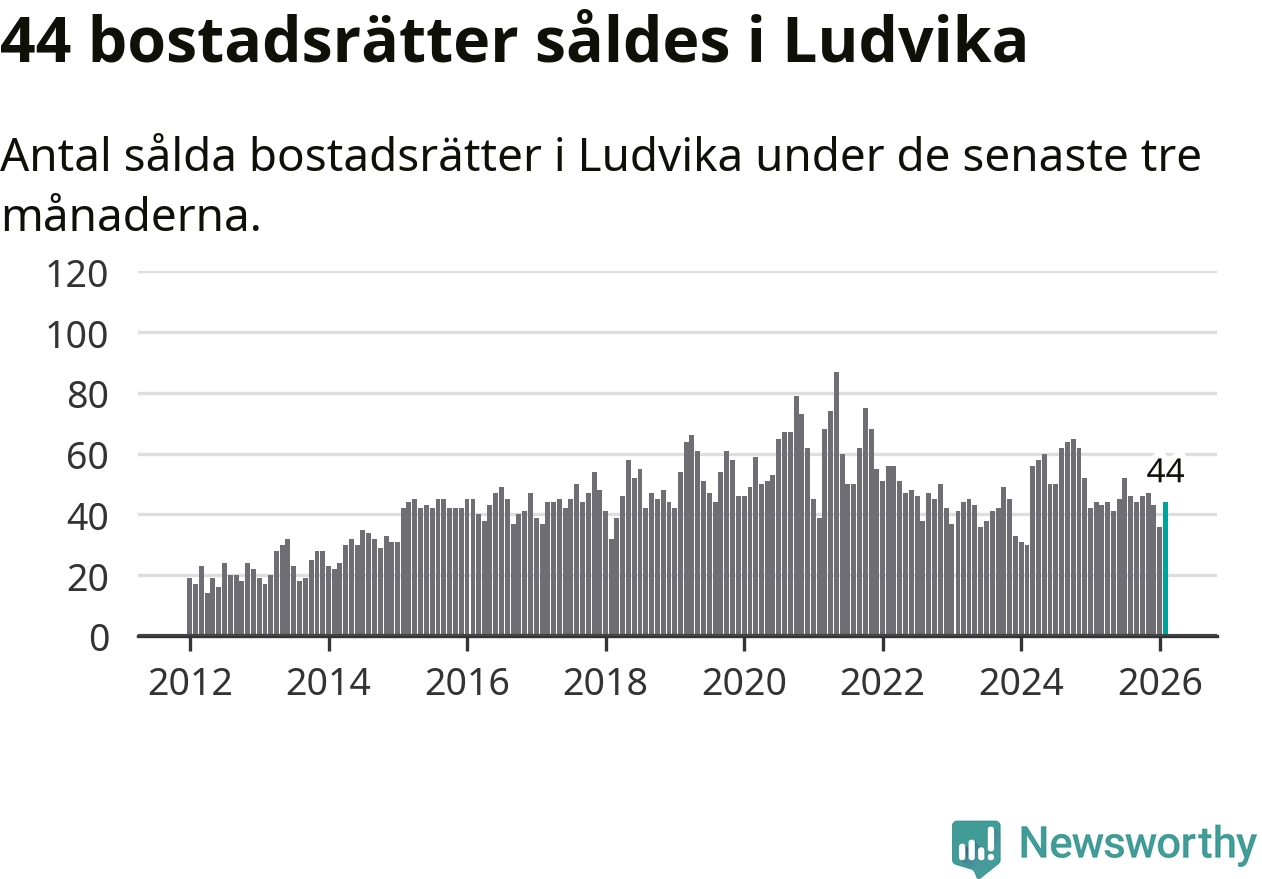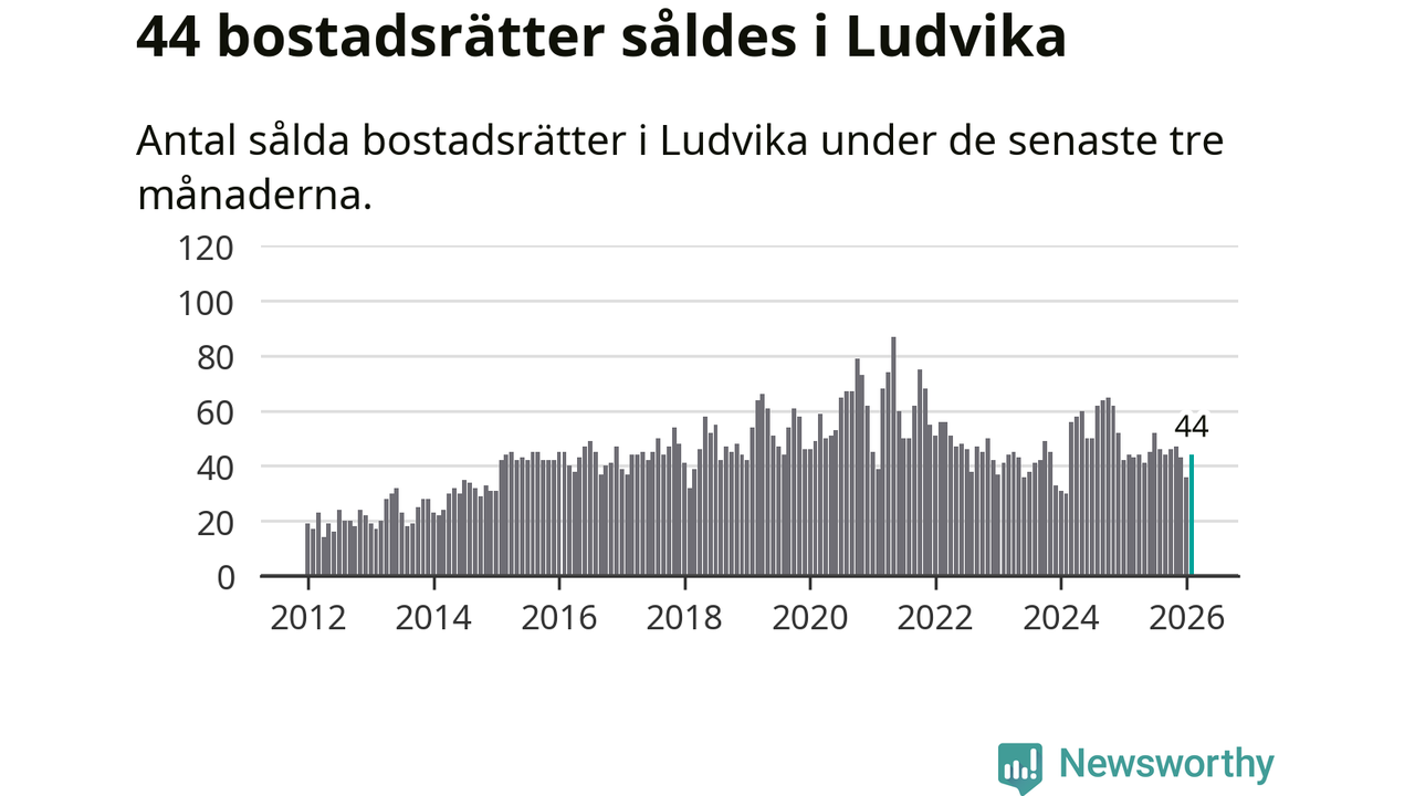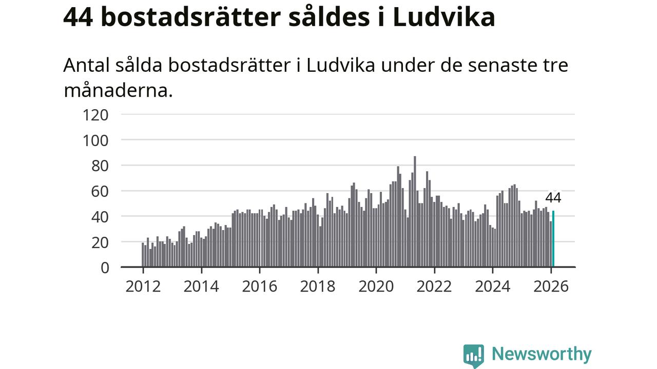 Sammanlagt såldes 44 bostadsrätter i Ludvika kommun mellan december och februari till ett genomsnittligt pris på 0,7 miljoner kronor. I fjol gjordes 44 affärer vid den här tiden på året.