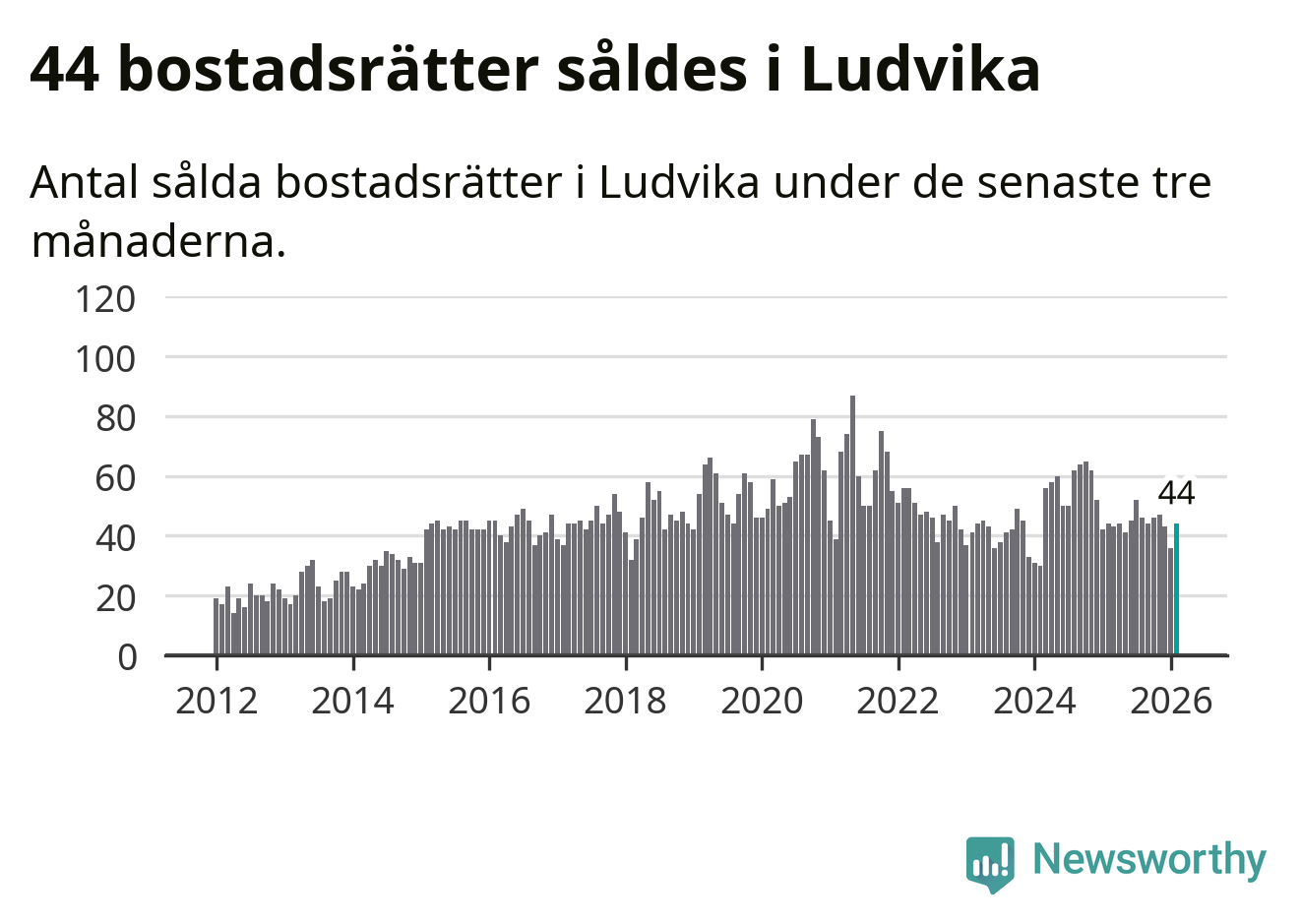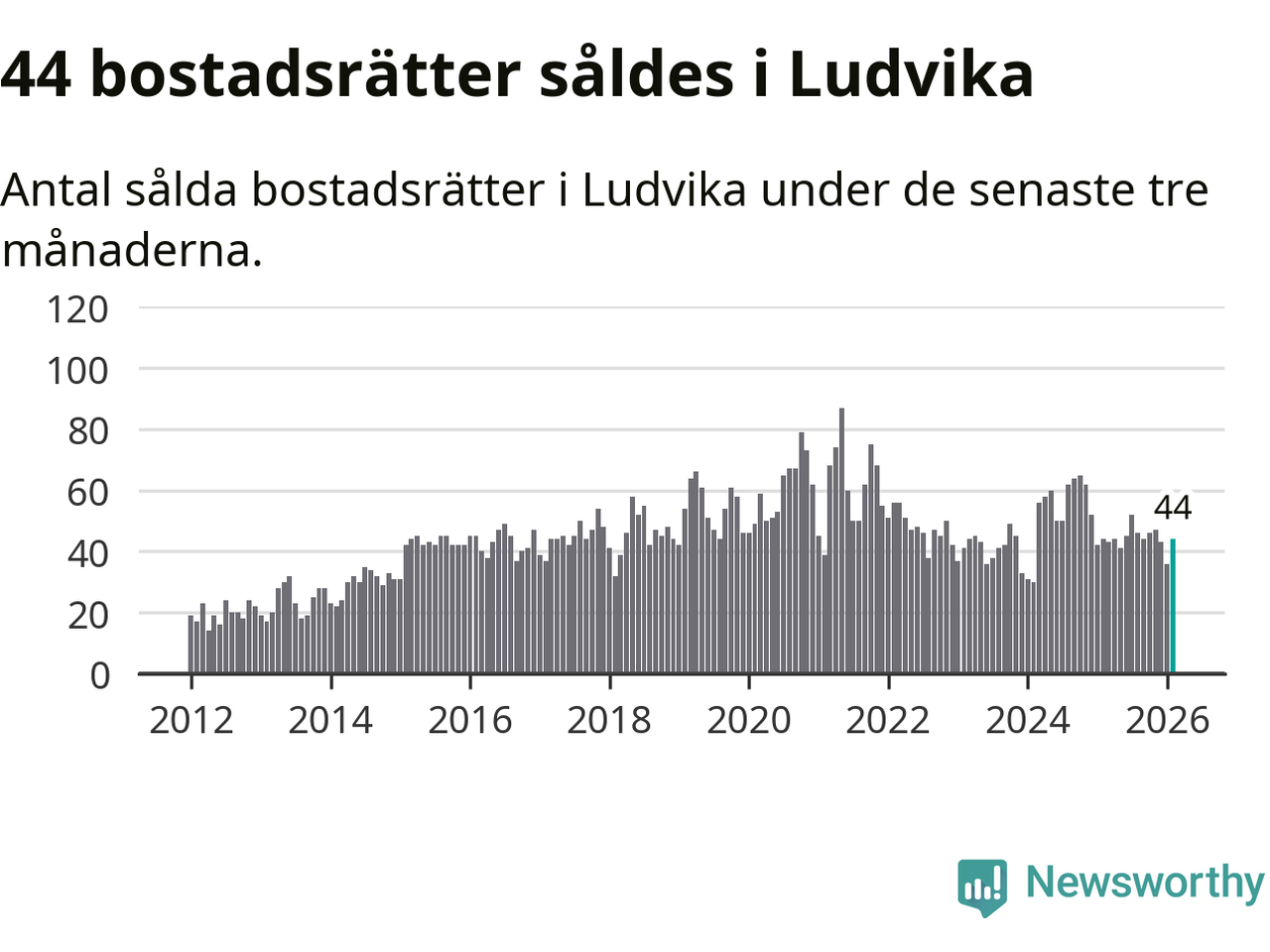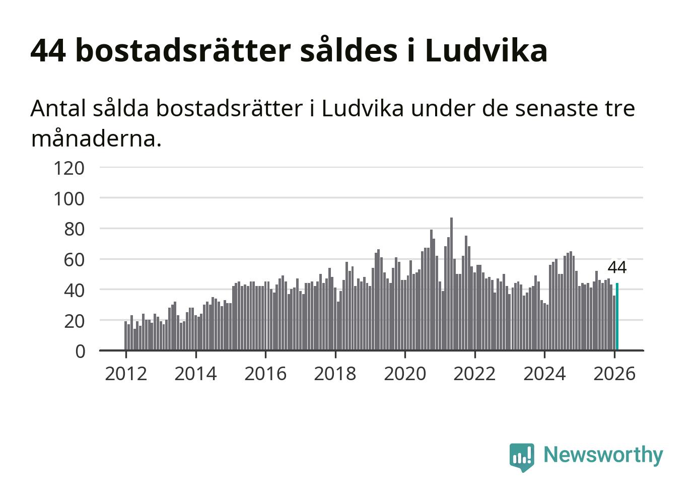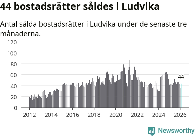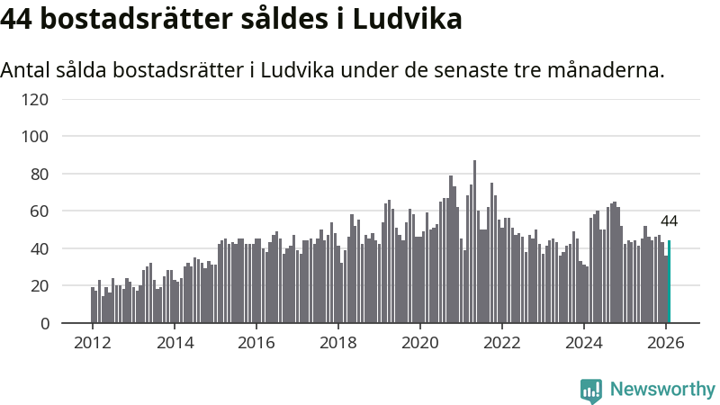 Sammanlagt såldes 44 bostadsrätter i Ludvika kommun mellan december och februari till ett genomsnittligt pris på 0,7 miljoner kronor. I fjol gjordes 44 affärer vid den här tiden på året.