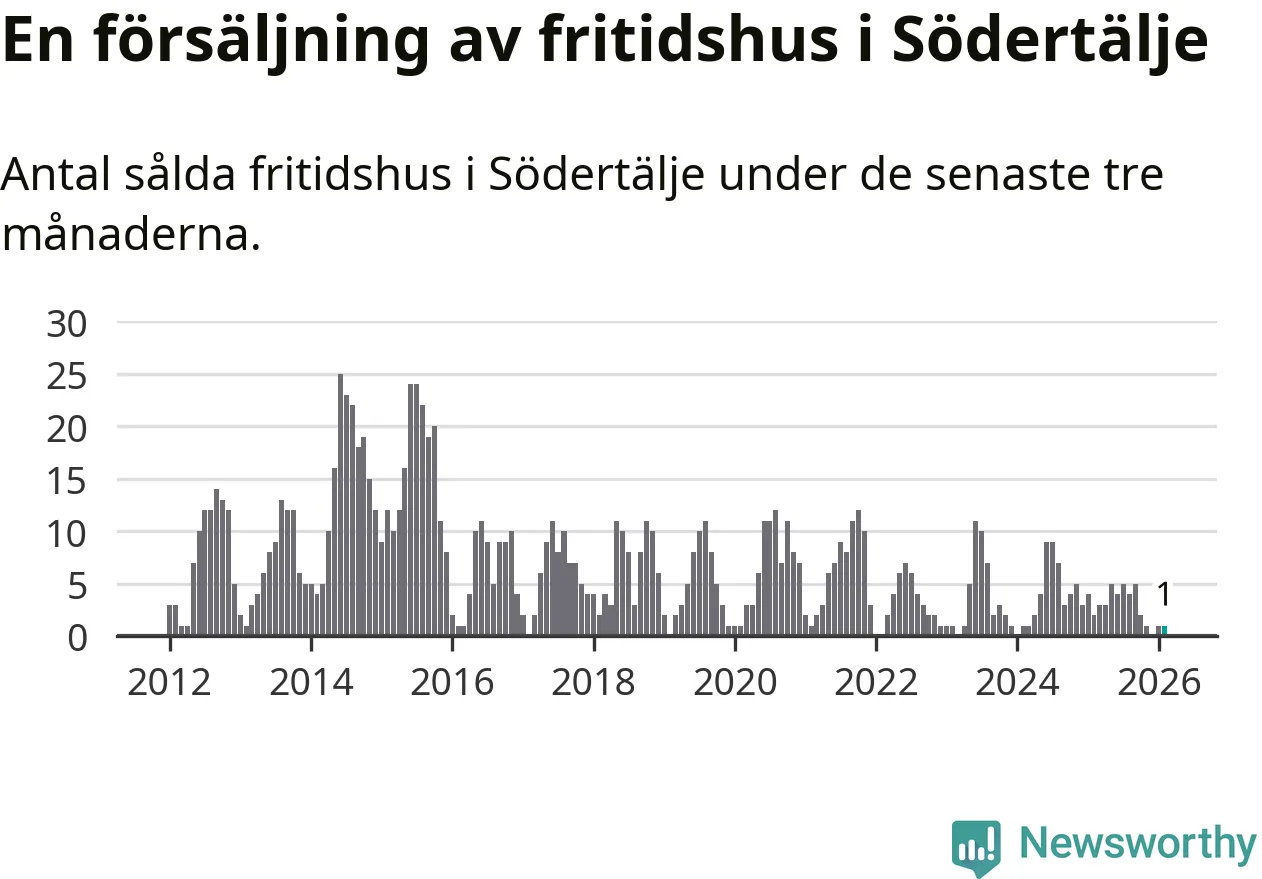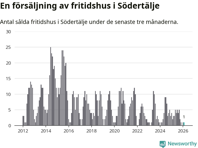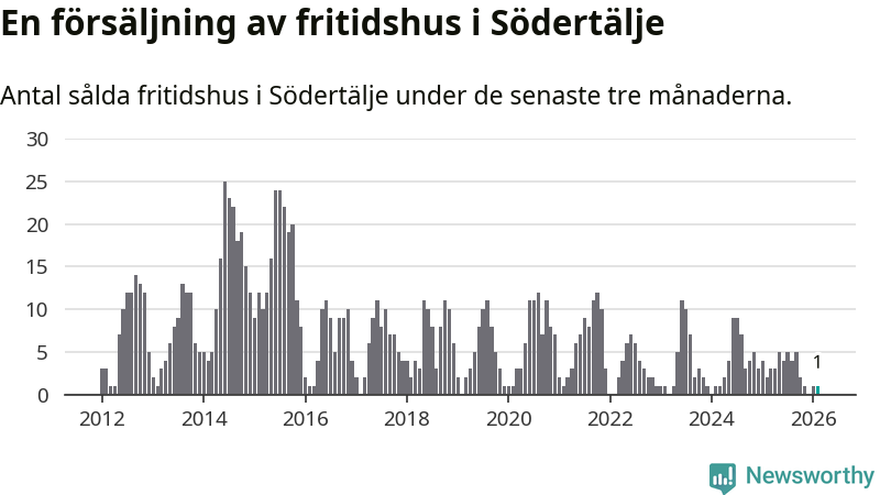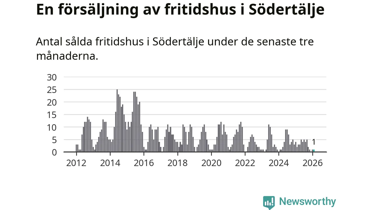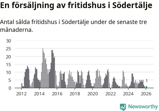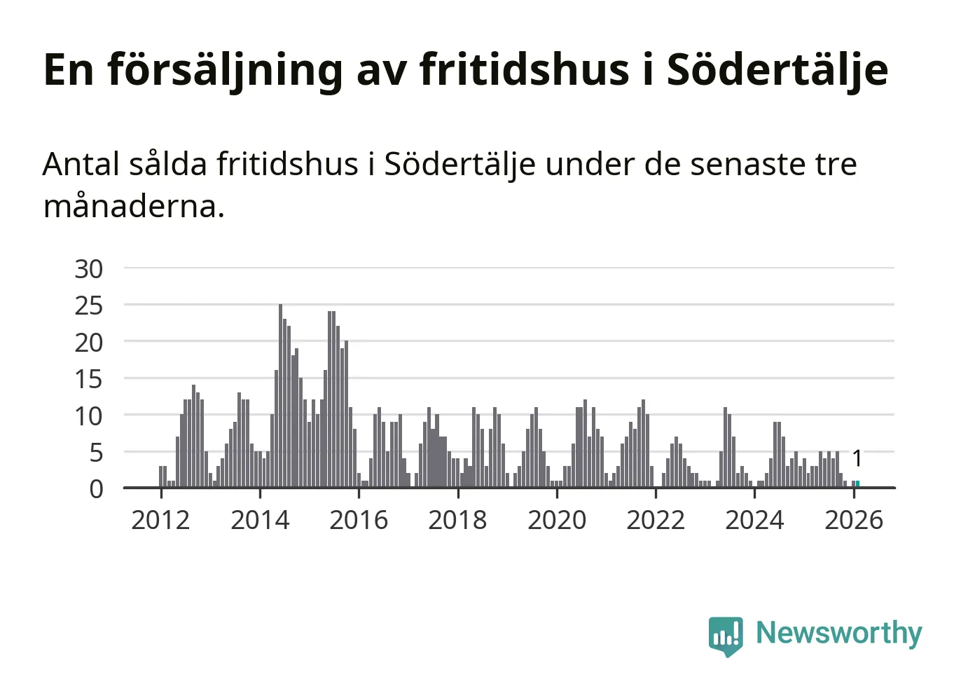 Mellan december och februari gjordes sammanlagt en affär med fritidshus i Södertälje kommun. Det kan jämföras med två vid motsvarande tid i fjol.