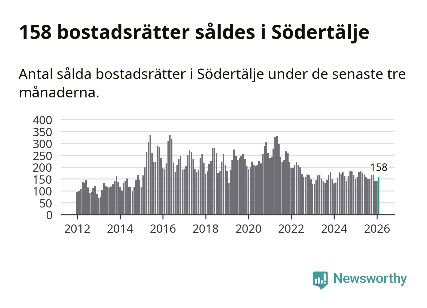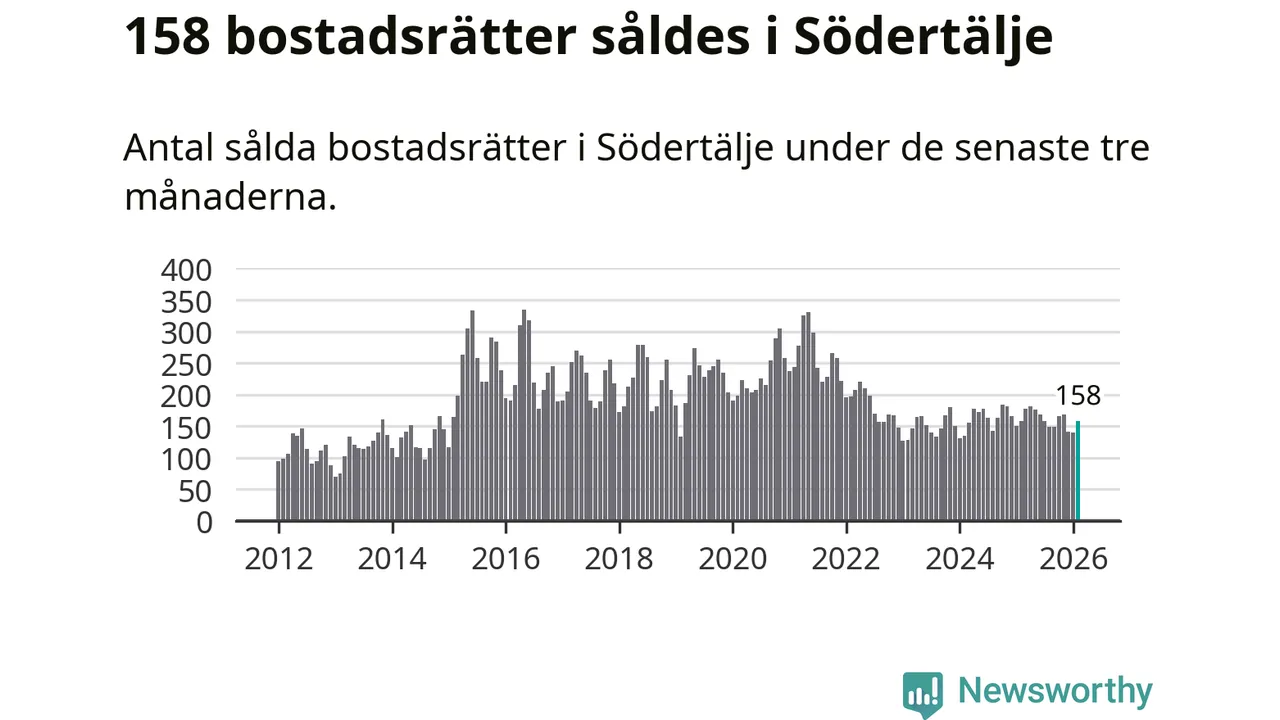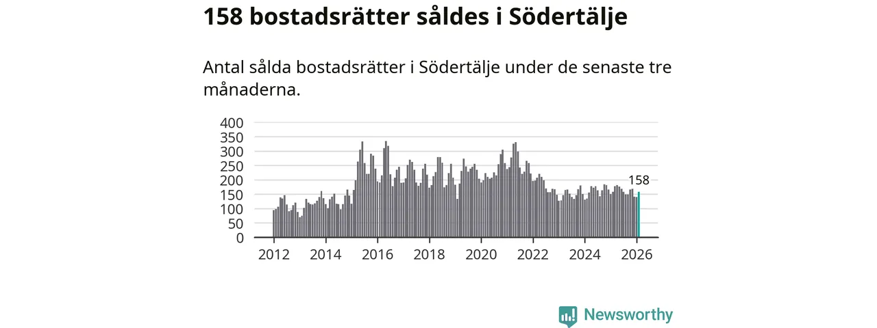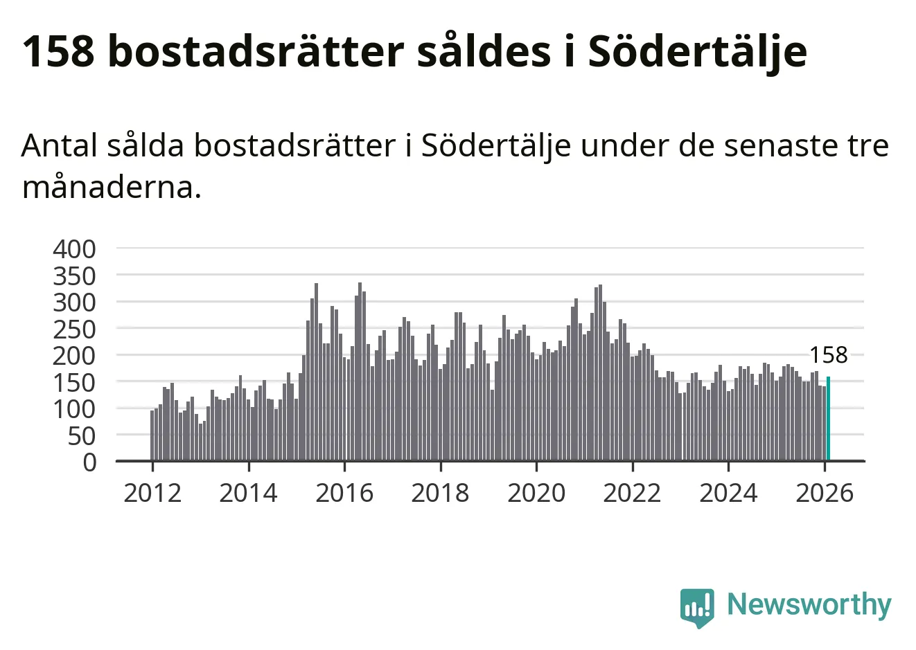 Sammanlagt såldes 158 bostadsrätter i Södertälje kommun mellan december och februari till ett genomsnittligt pris på 1,9 miljoner kronor. I fjol gjordes 158 affärer vid den här tiden på året.