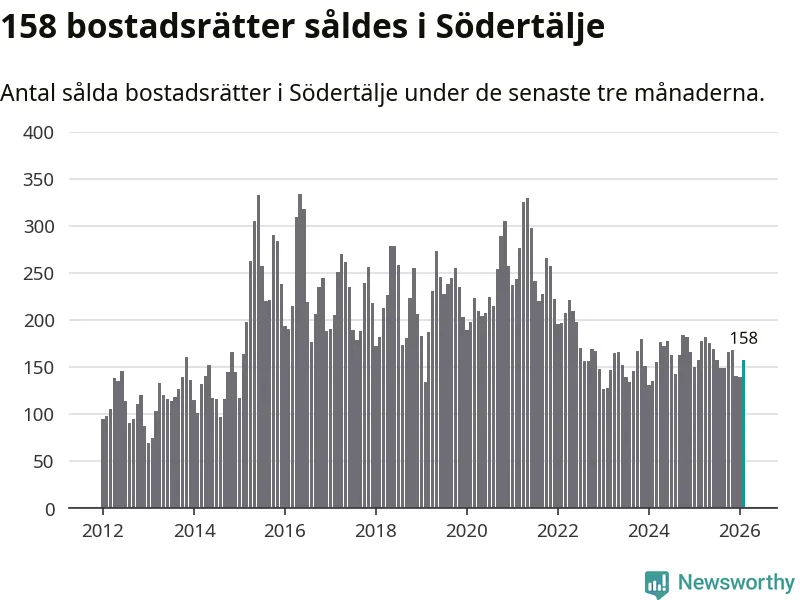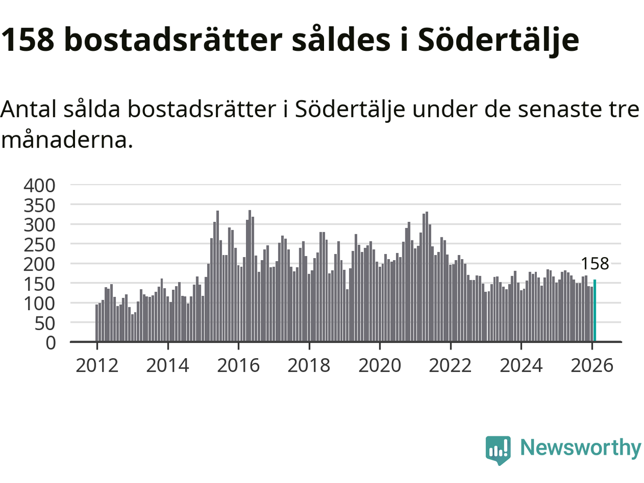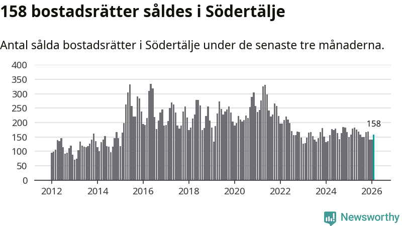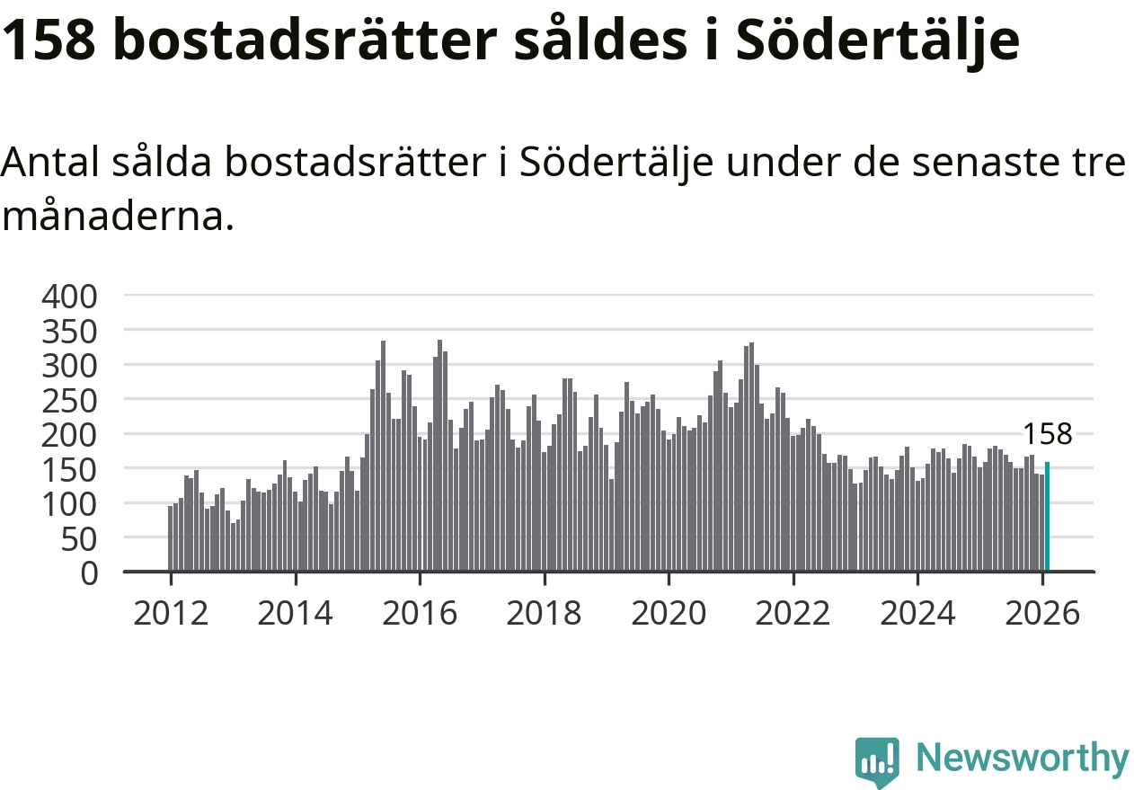 Sammanlagt såldes 158 bostadsrätter i Södertälje kommun mellan december och februari till ett genomsnittligt pris på 1,9 miljoner kronor. I fjol gjordes 158 affärer vid den här tiden på året.