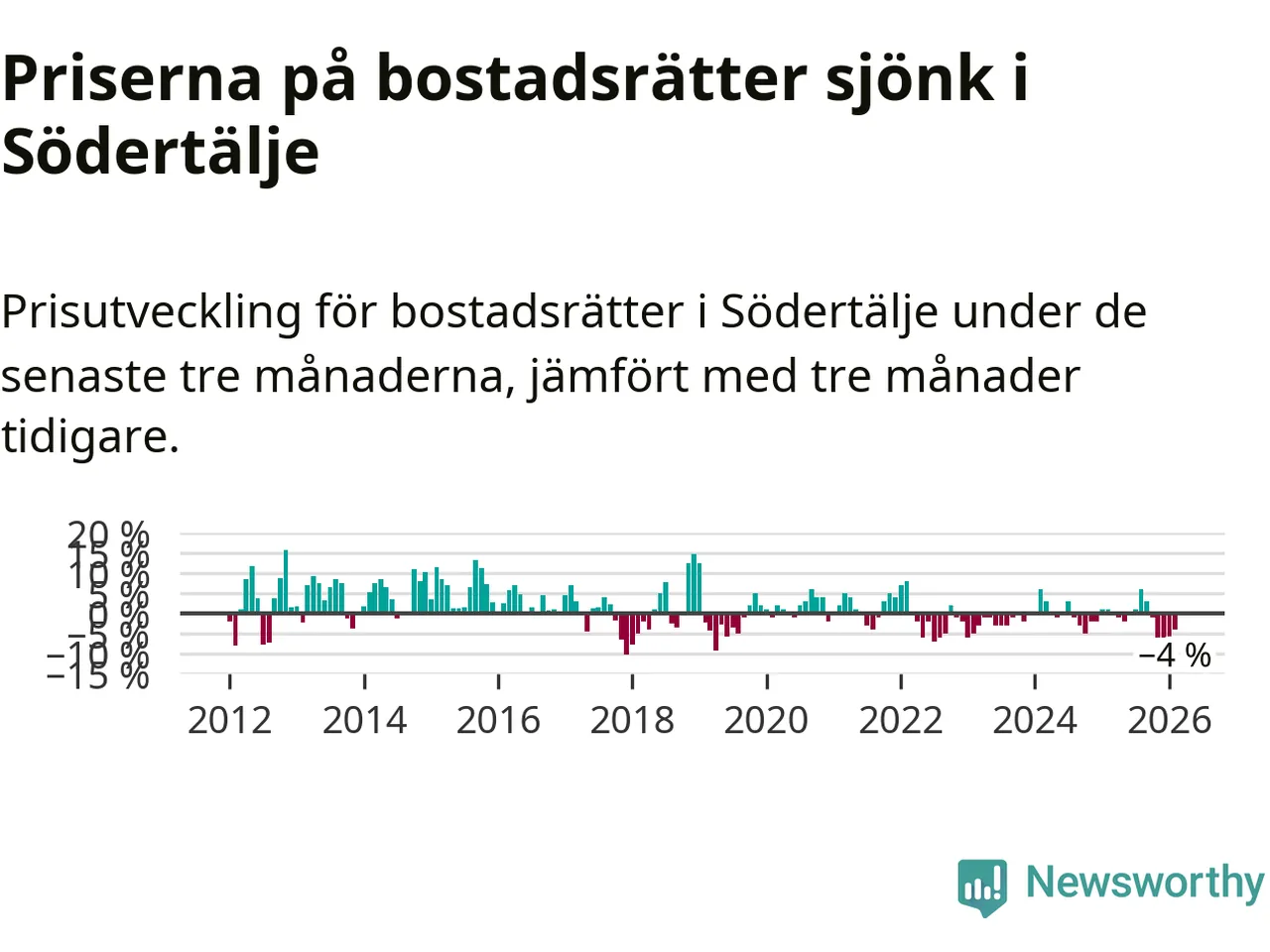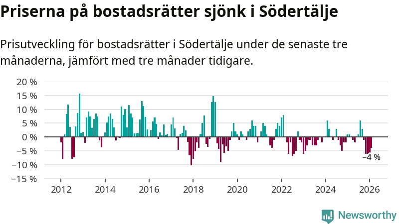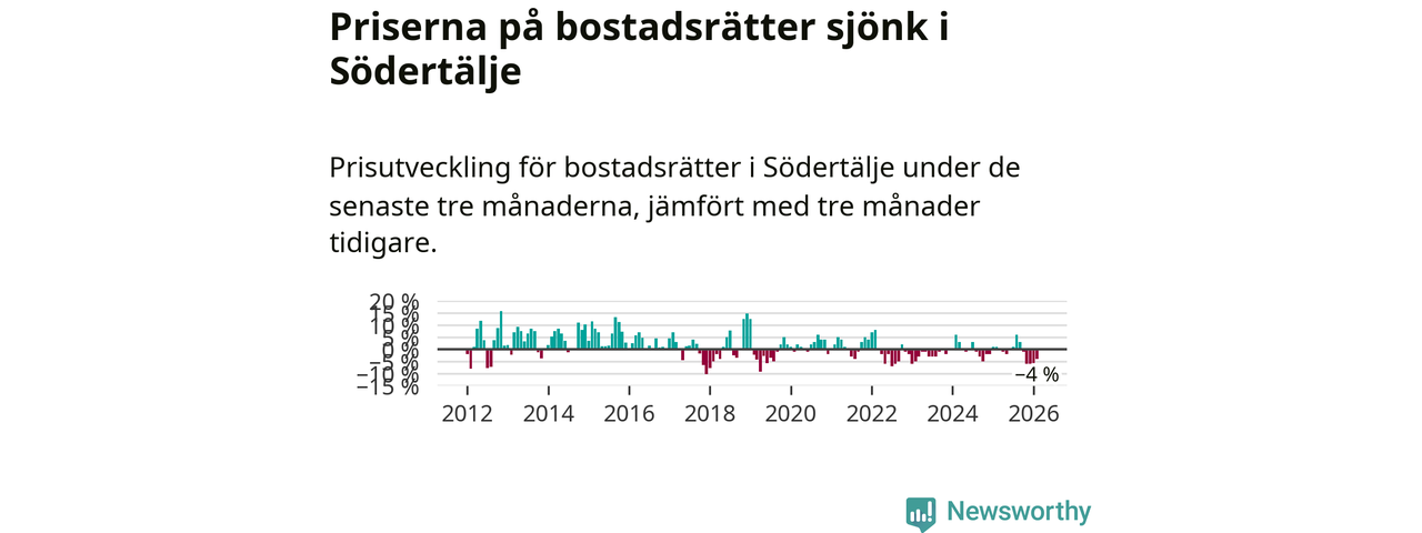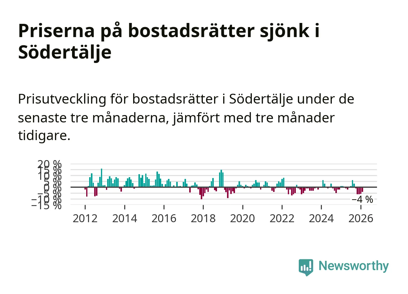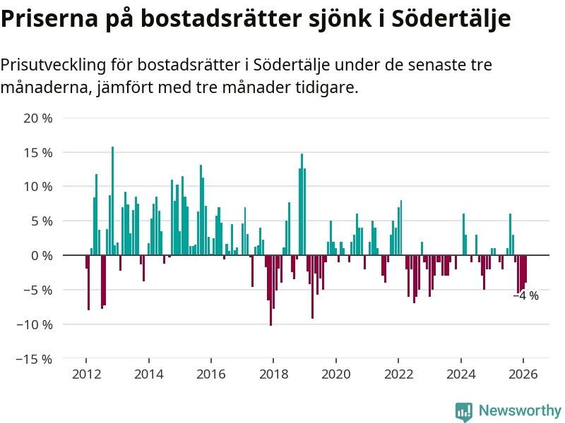 Priserna på bostadsrätter har gått ner i Södertälje kommun. Medelpriset på försäljningarna under de senaste tre månaderna visar på en nedgång med 4 procent.