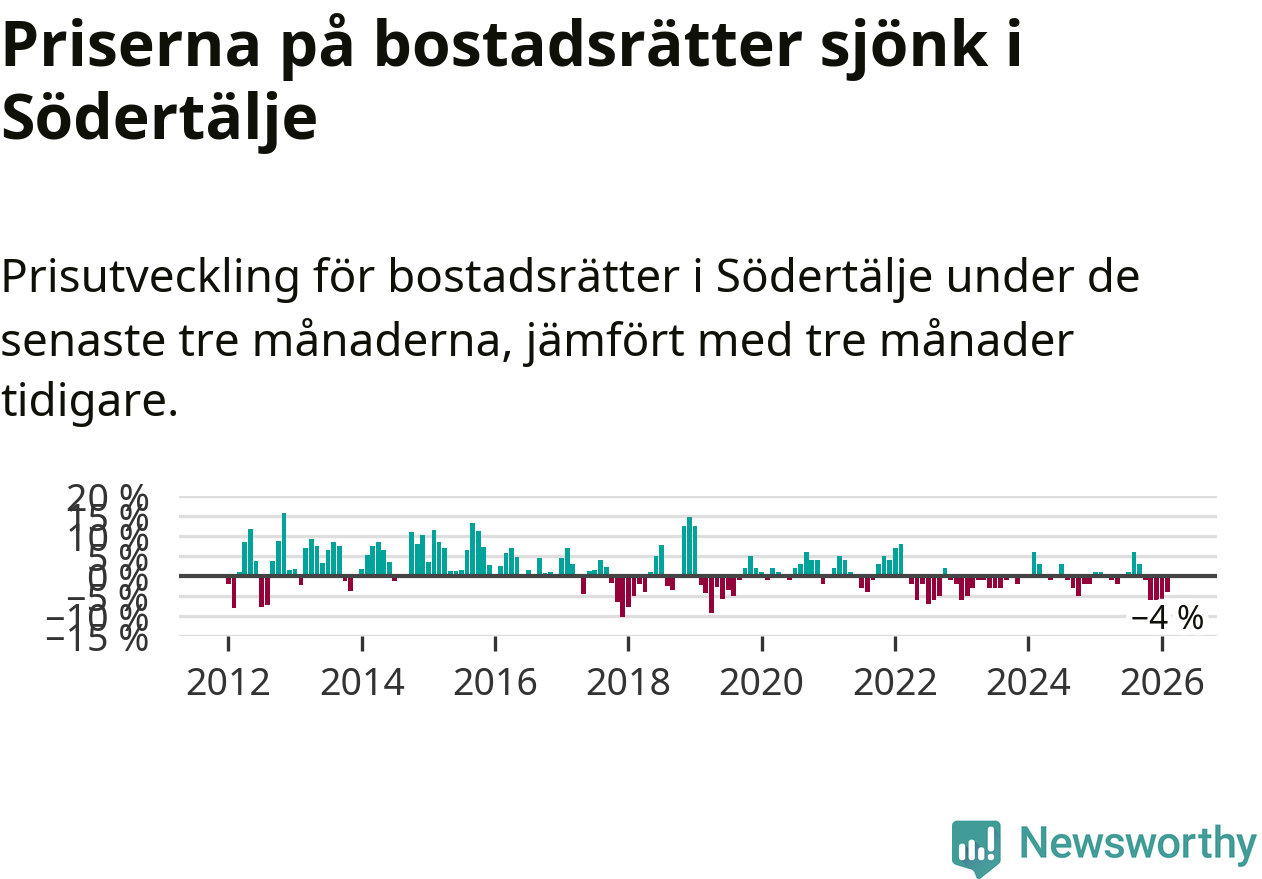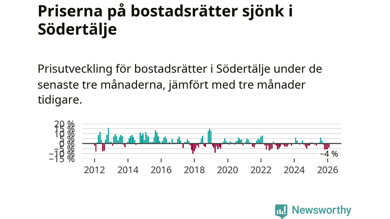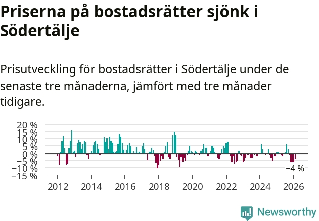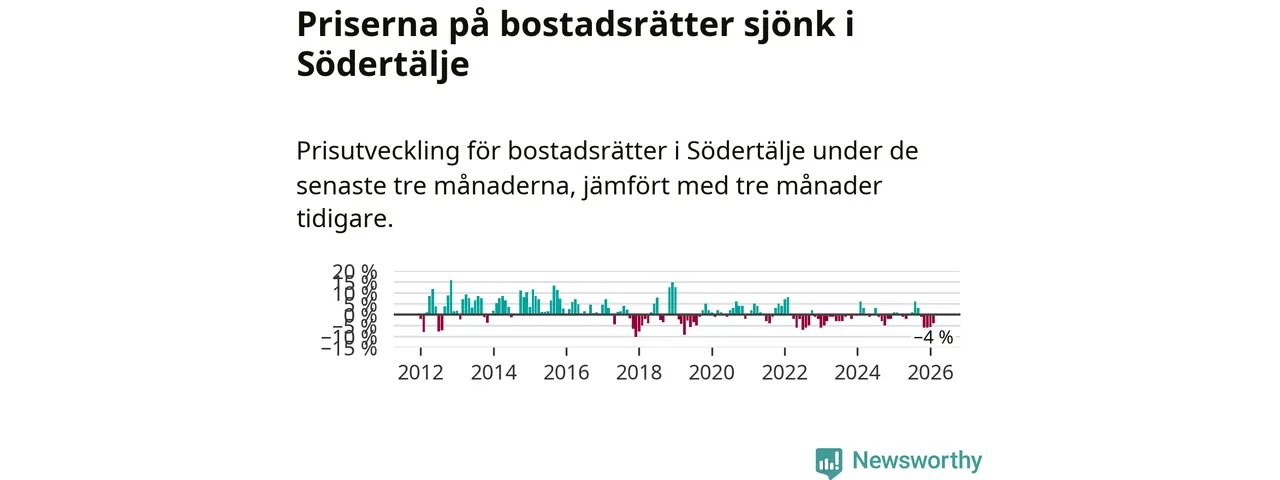 Priserna på bostadsrätter har gått ner i Södertälje kommun. Medelpriset på försäljningarna under de senaste tre månaderna visar på en nedgång med 4 procent.