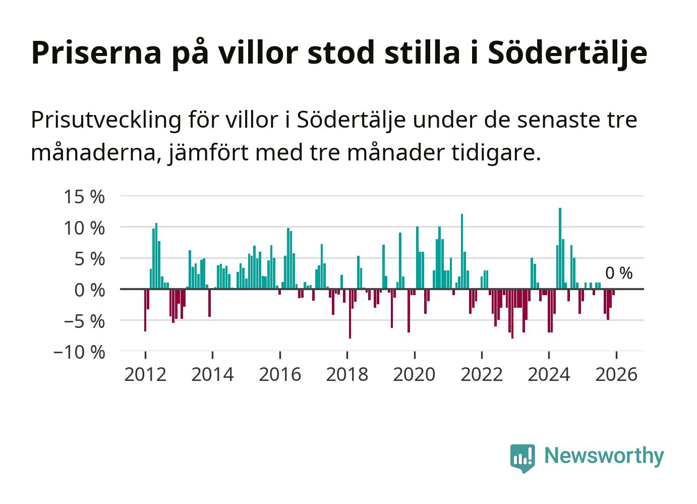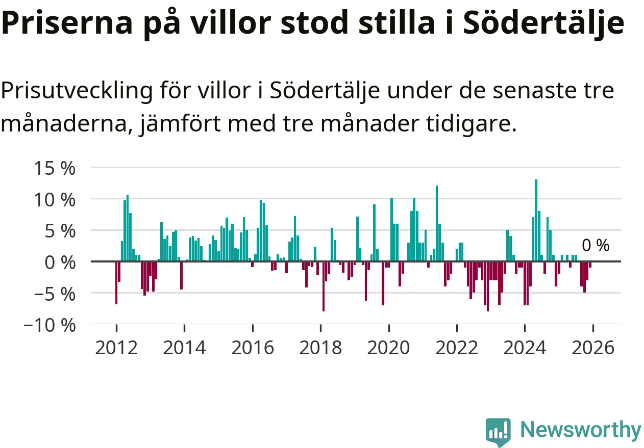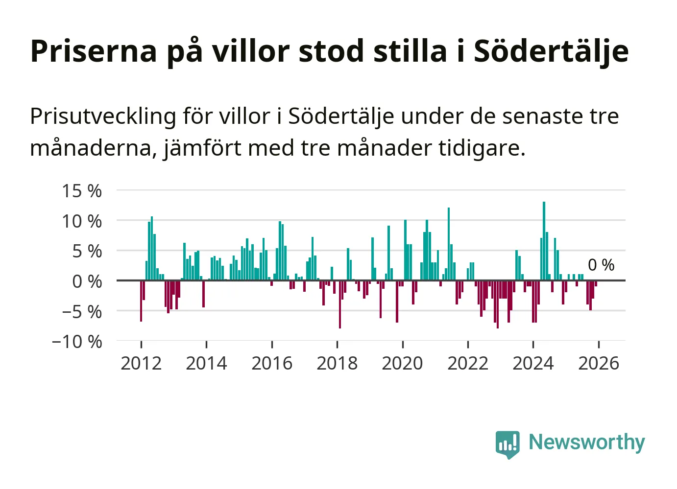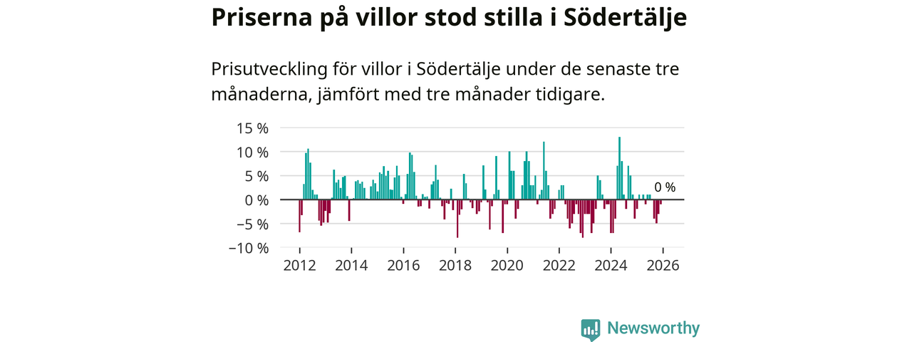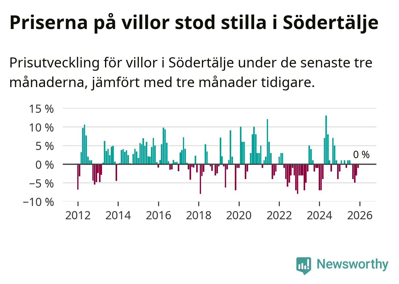 Villapriserna står i stort sett stilla i Södertälje kommun. Medelpriset på de på försäljningarna under de senaste tre månaderna låg på samma nivå som för tre månader sedan.