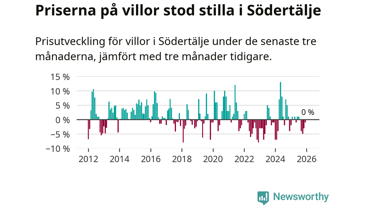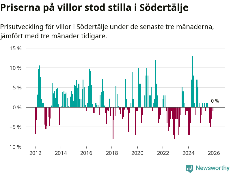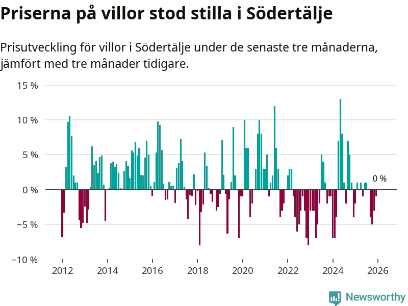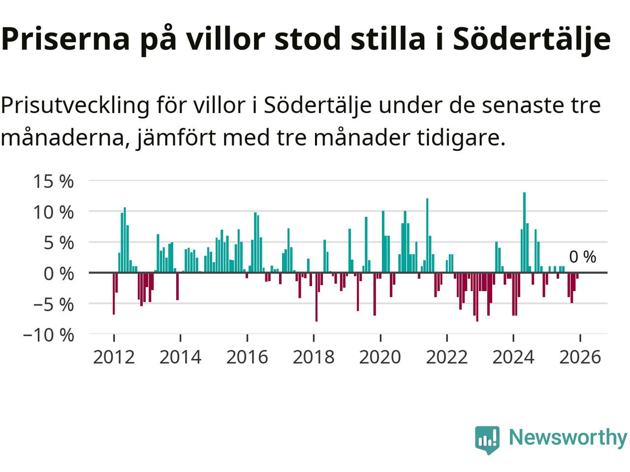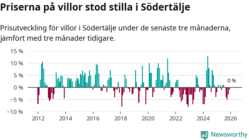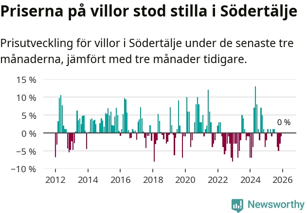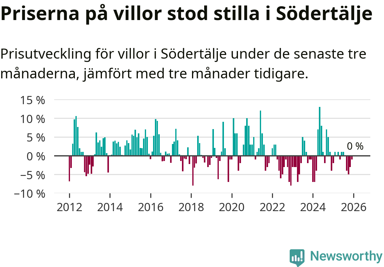 Villapriserna står i stort sett stilla i Södertälje kommun. Medelpriset på de på försäljningarna under de senaste tre månaderna låg på samma nivå som för tre månader sedan.