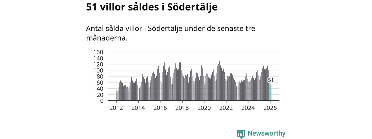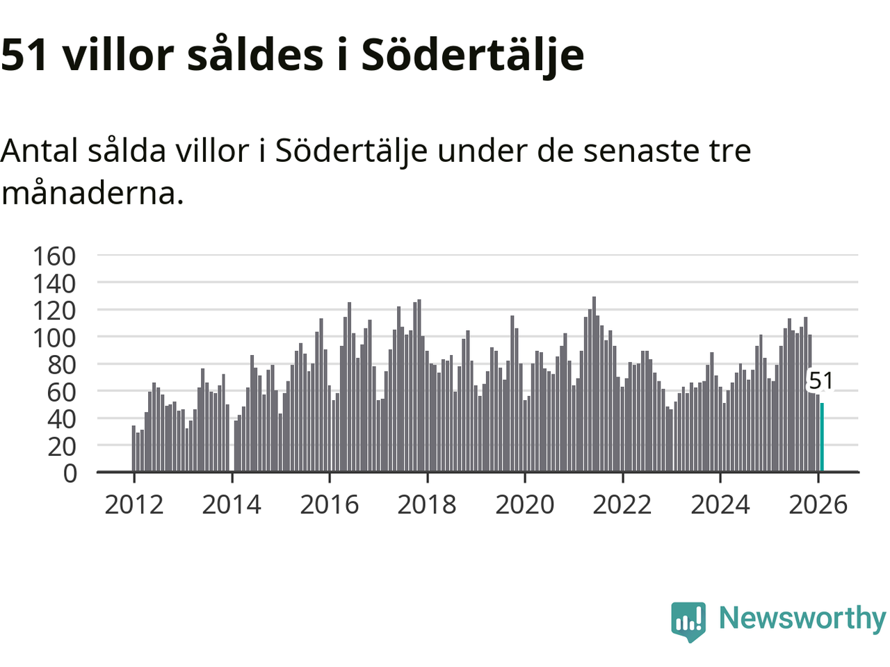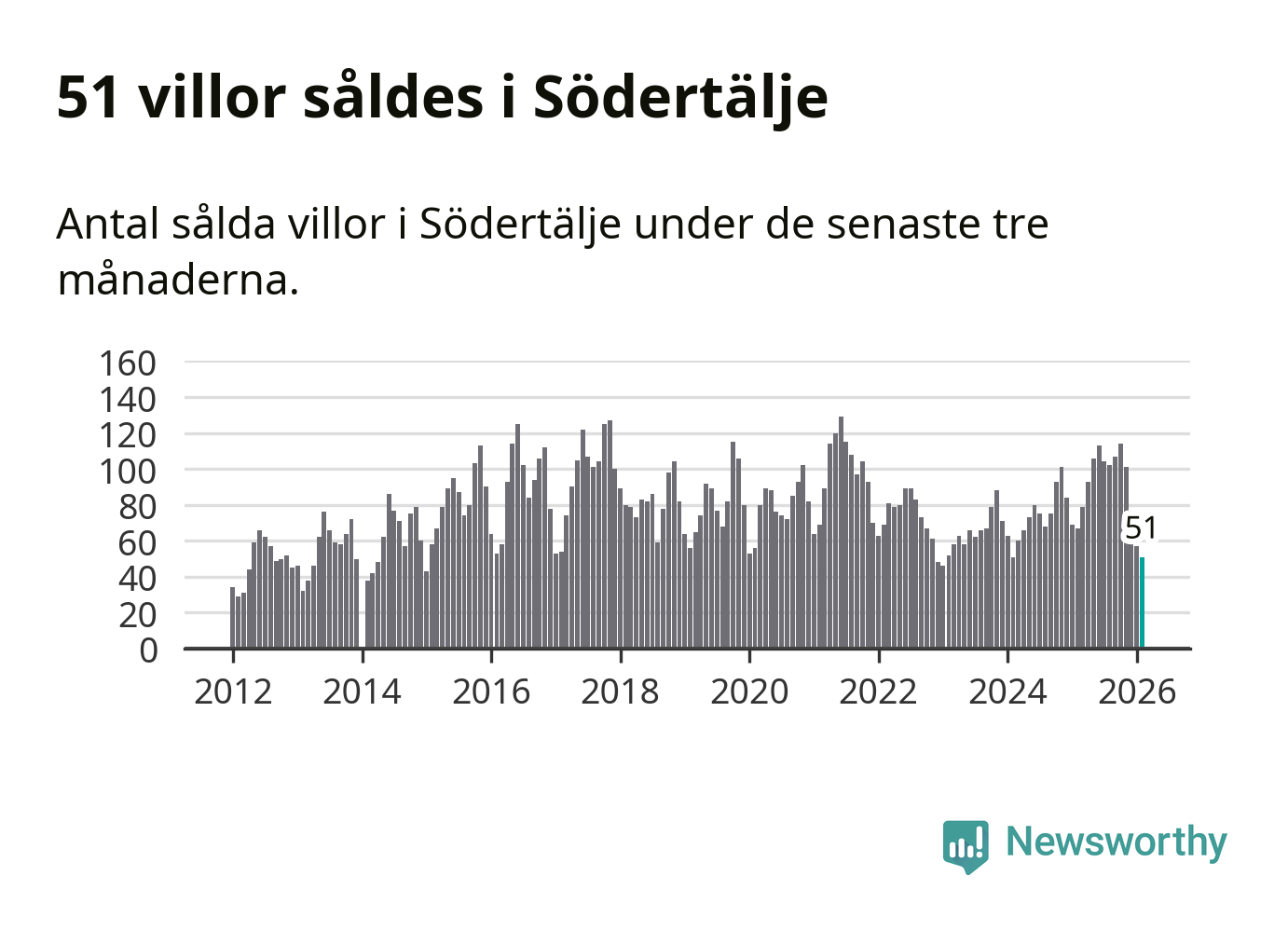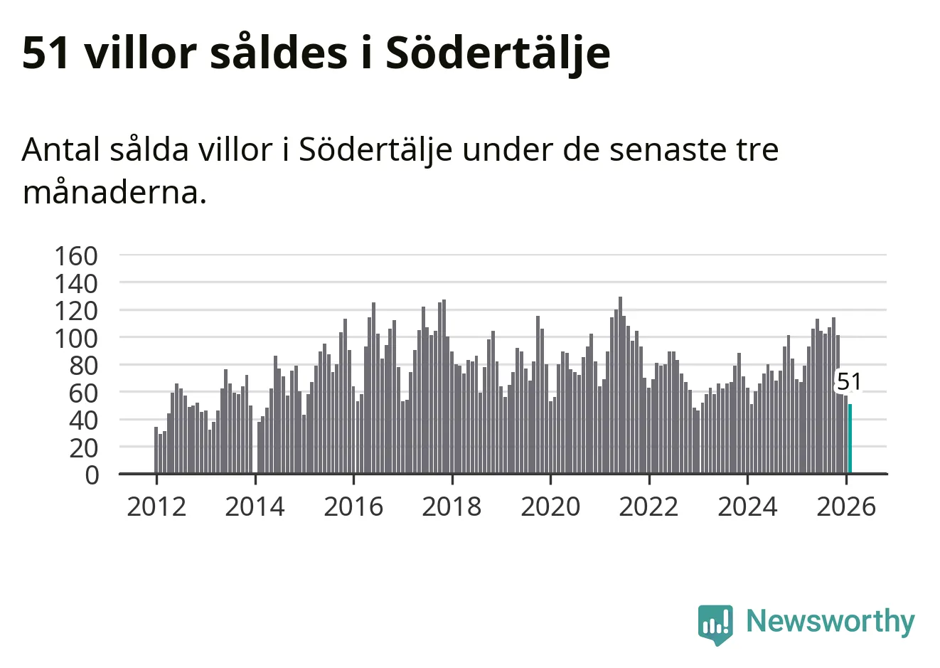 Sammanlagt såldes 51 villor i Södertälje kommun mellan december och februari till ett genomsnittligt pris på 4,3 miljoner kronor. I fjol gjordes 67 affärer vid den här tiden på året.