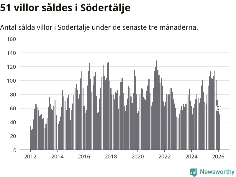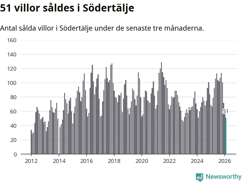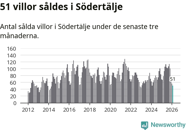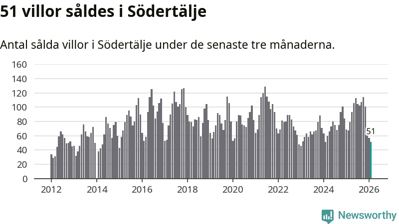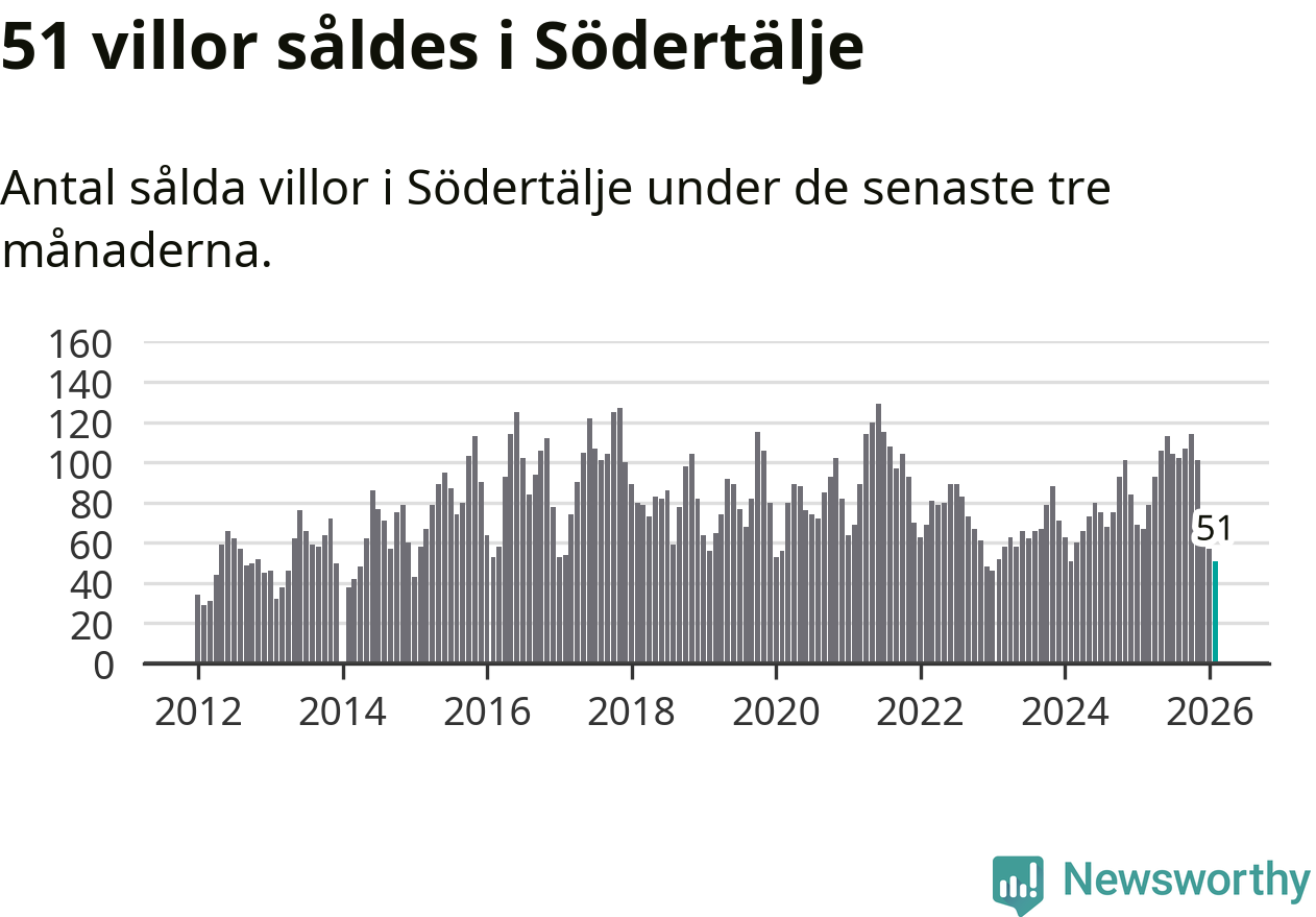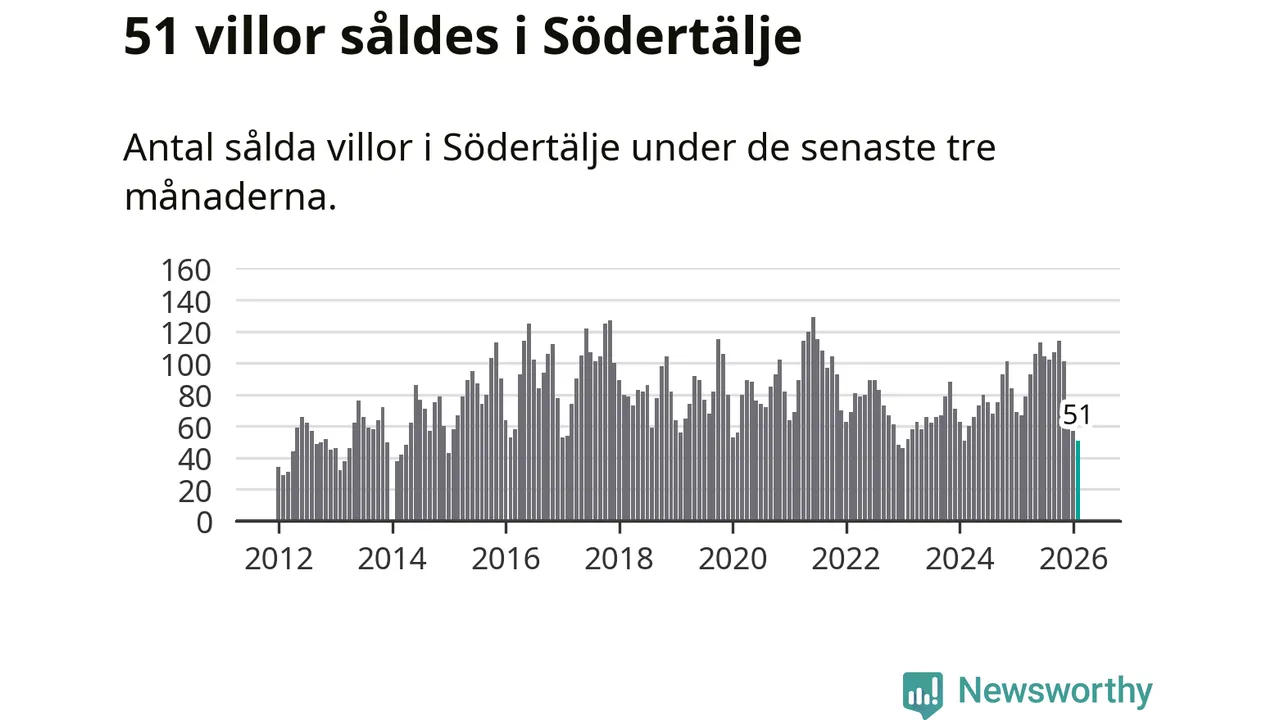 Sammanlagt såldes 51 villor i Södertälje kommun mellan december och februari till ett genomsnittligt pris på 4,3 miljoner kronor. I fjol gjordes 67 affärer vid den här tiden på året.